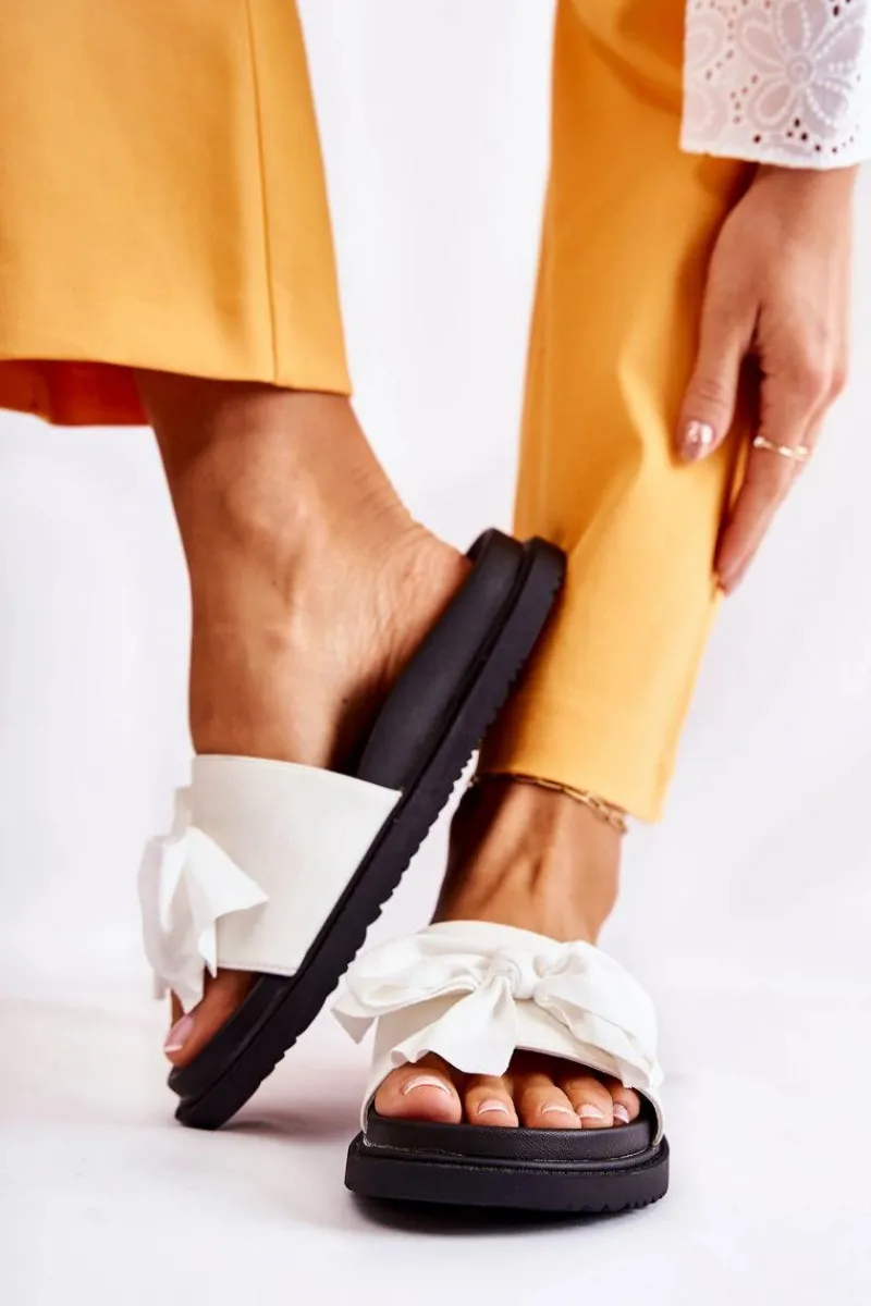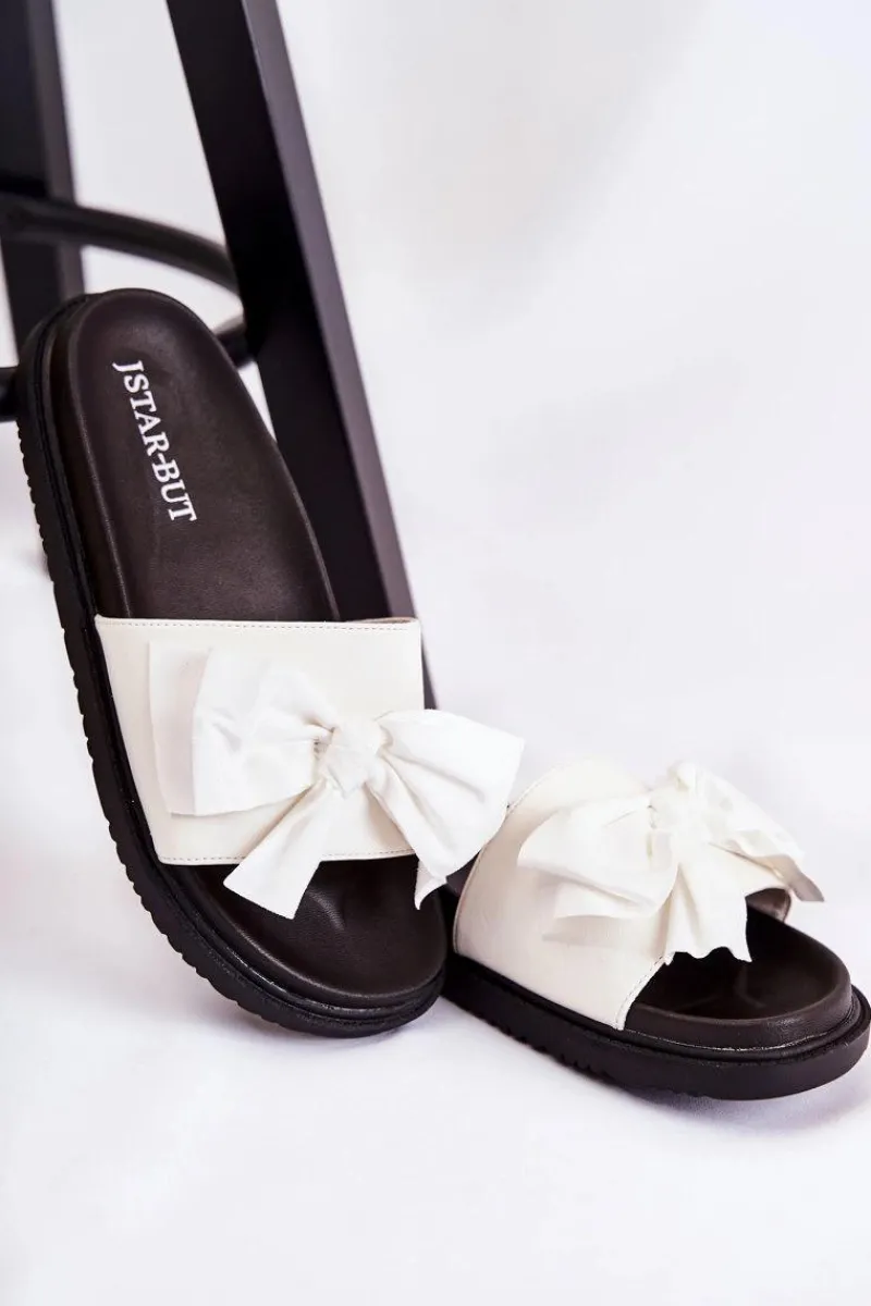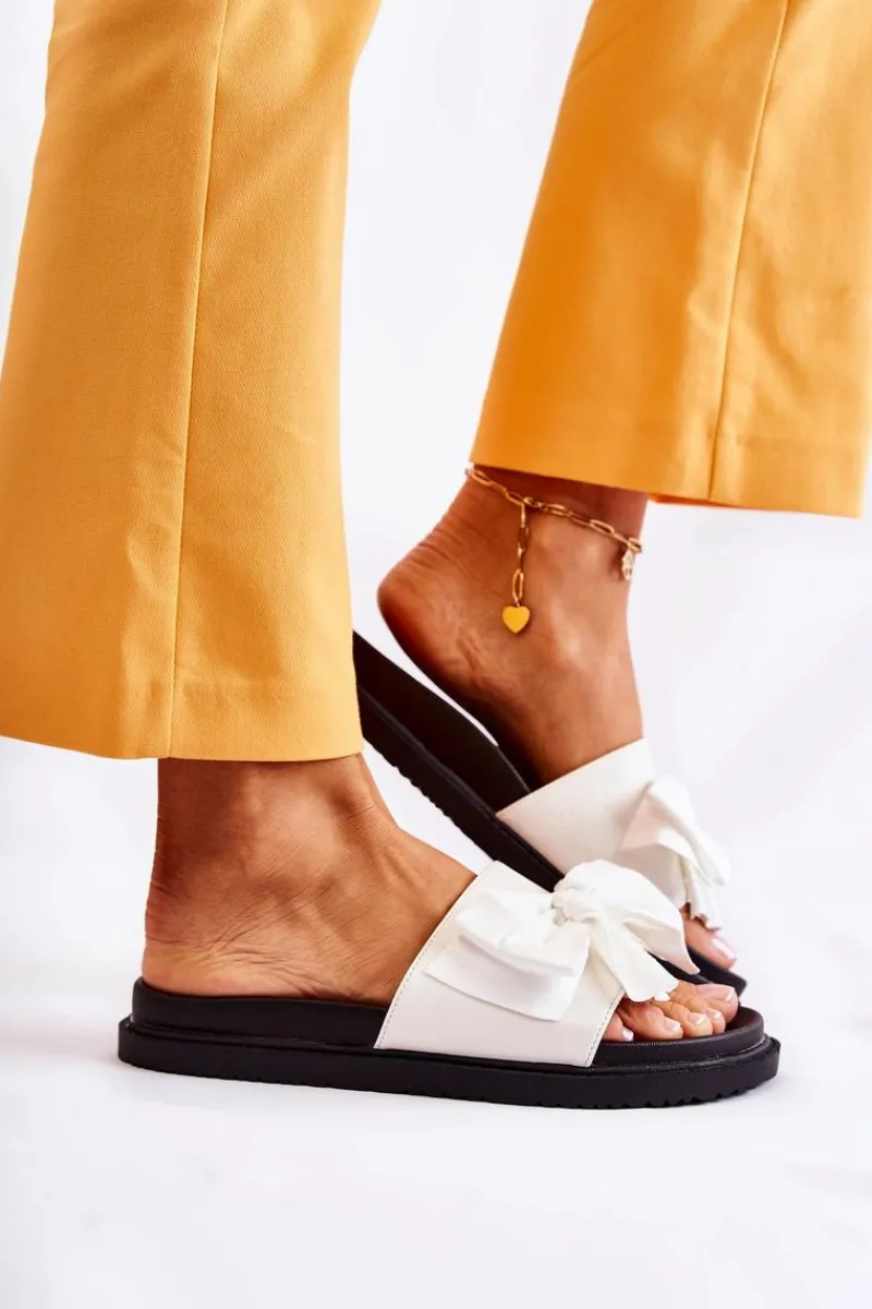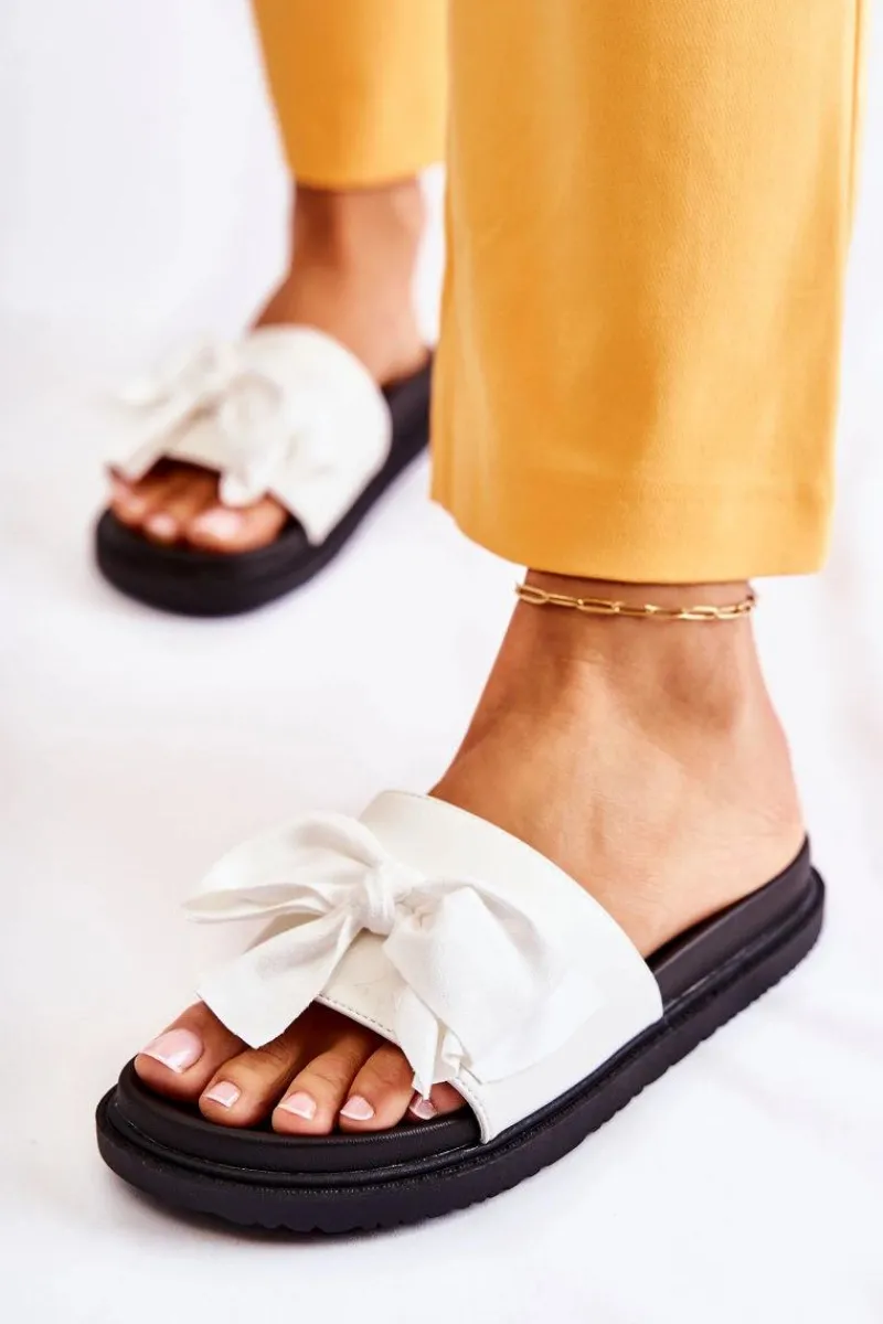 Modne klapki świetnie sprawdzą się podczas upalnych dni! Klasyczny, wsuwany model został wykonany z eko skóry. Eko zamszowa kokarda na przodzie dodaje tym butom elegancji. Klapki osadzone na delikatnej platformie wykonanej z tworzywa sztucznego. Wkładka jest profilowana, wykonana z tworzywa gumowego. Model ten posiada odkryty, zaokrąglony nosek. Podczas wyboru rozmiaru prosimy sugerować się tabelą rozmiarów.