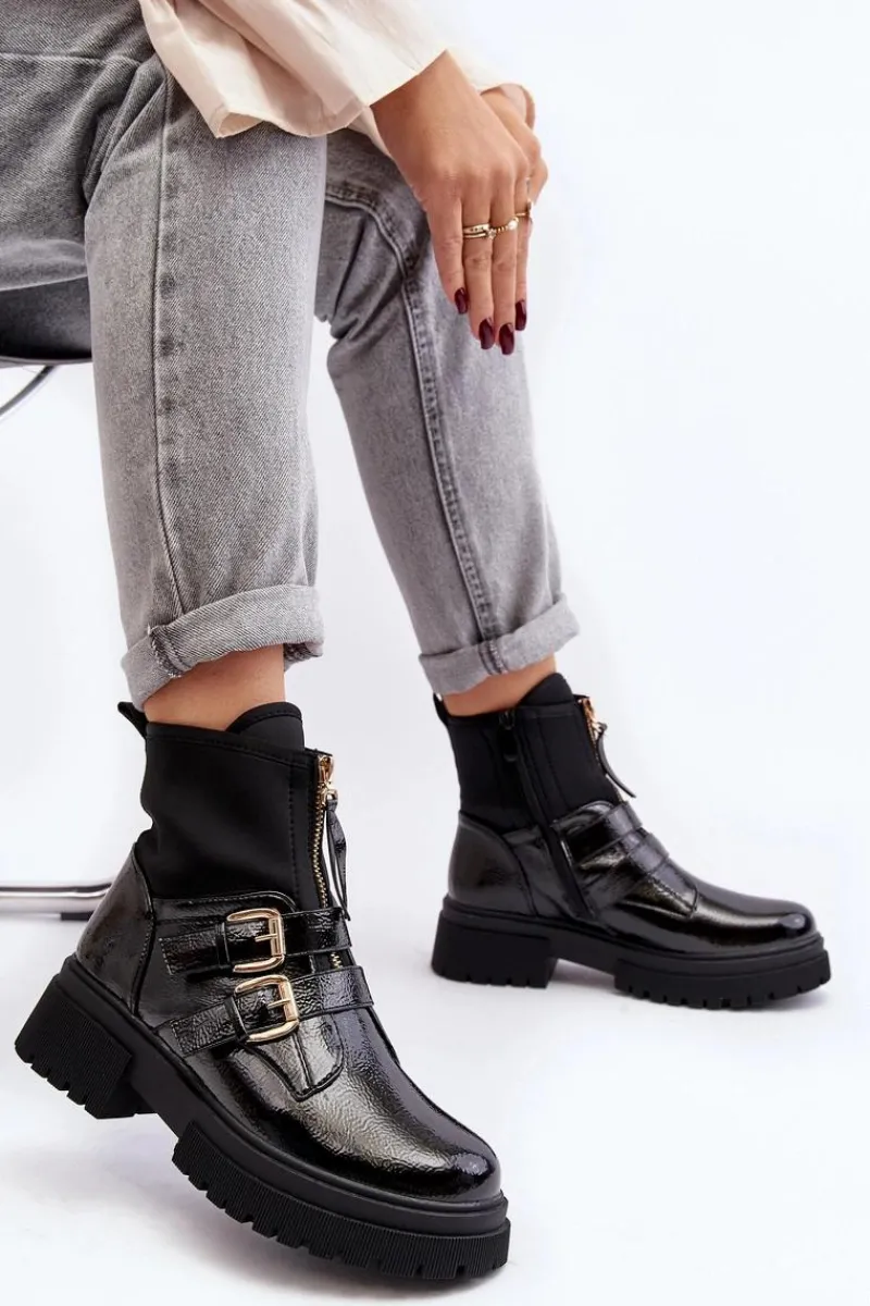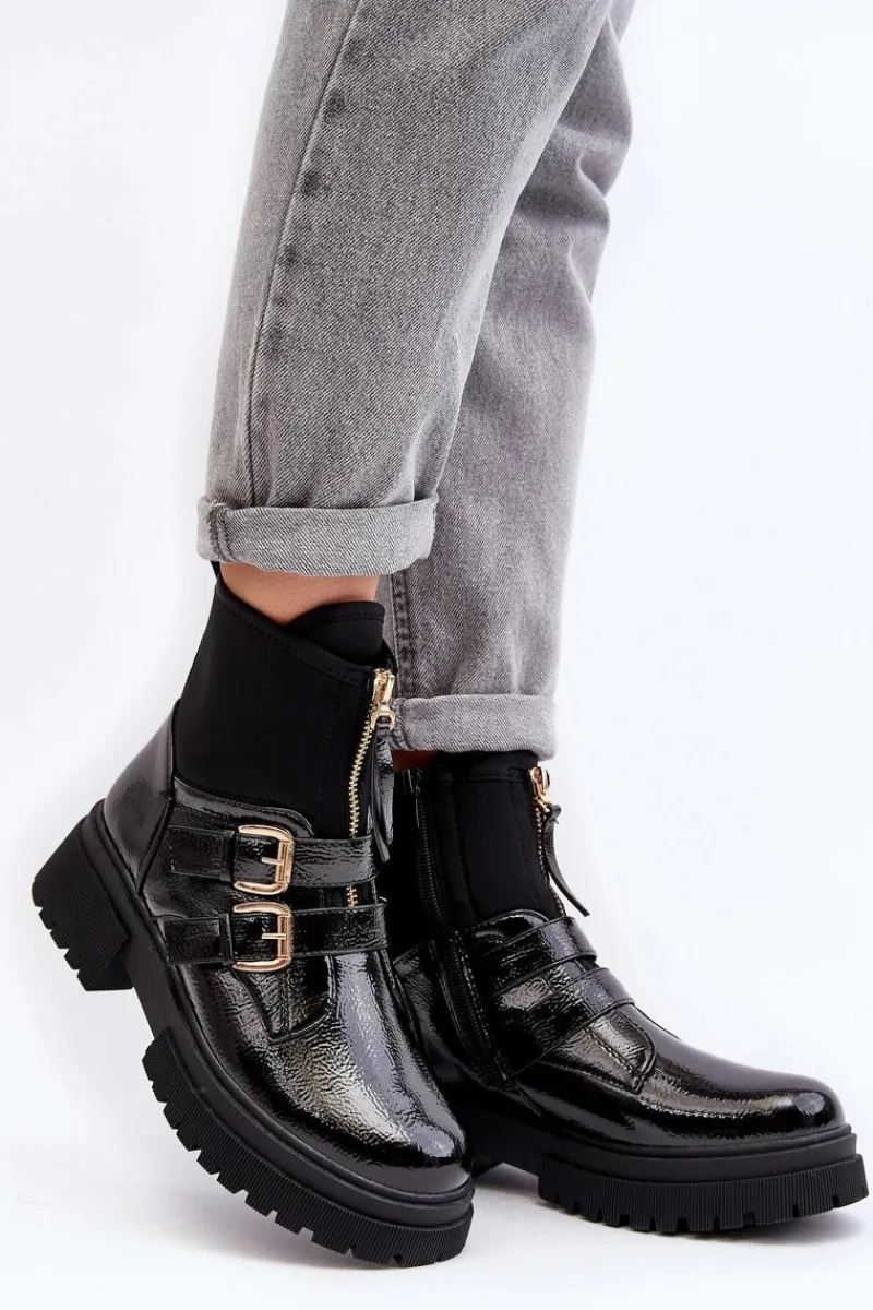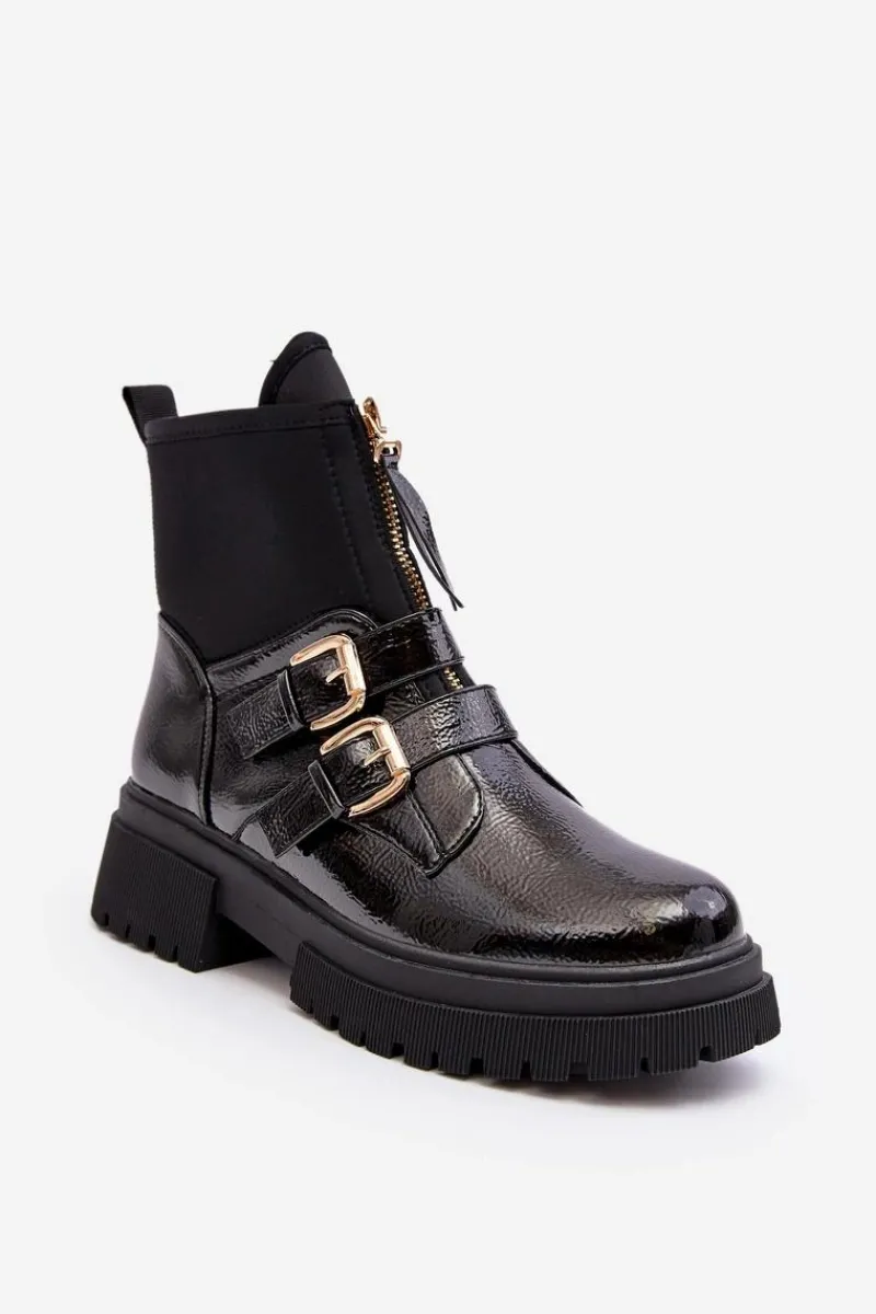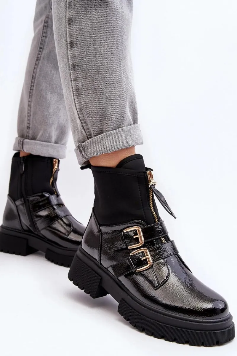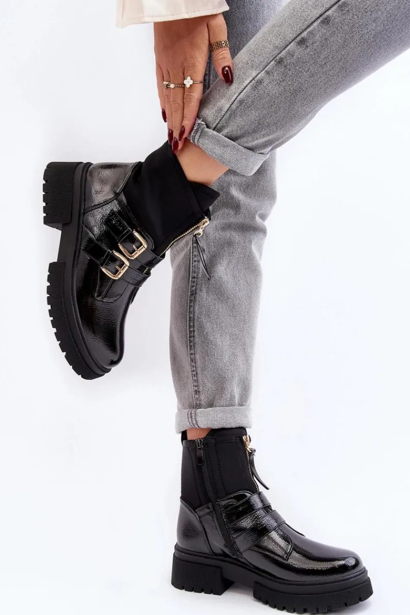Modne botki damskie zostały wykonane z połączenia eko skóry i materiału tekstylnego. Osadzone na płaskim obcasie i platformie. Model ten posiada dwa suwaki oraz paski ze złotymi klamrami. Noski zaokrąglone. Koniecznie sprawdź pozostałe modele płaskich botków! Przy wyborze rozmiaru prosimy sugerować się tabelą rozmiarów.