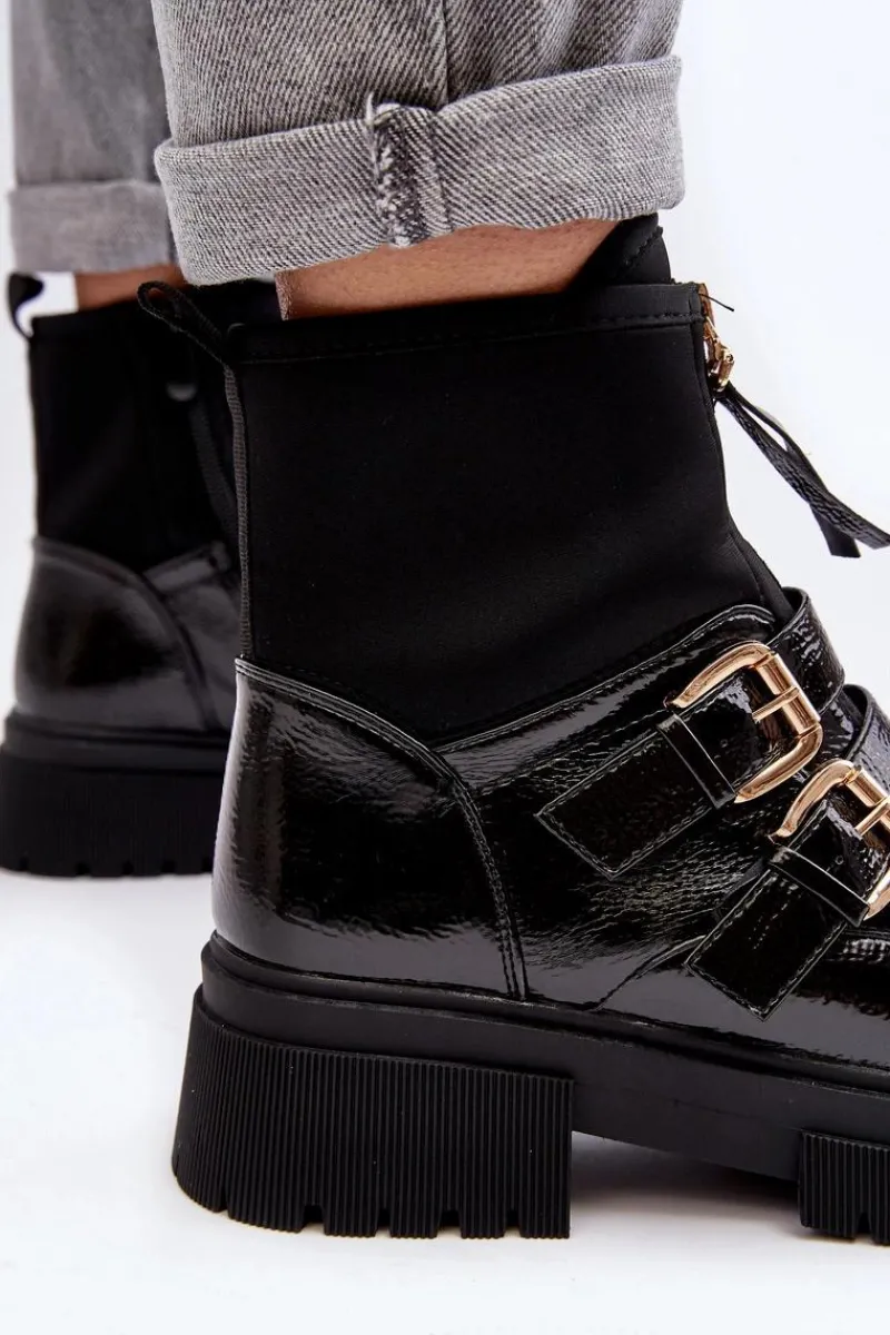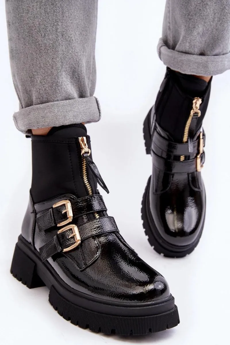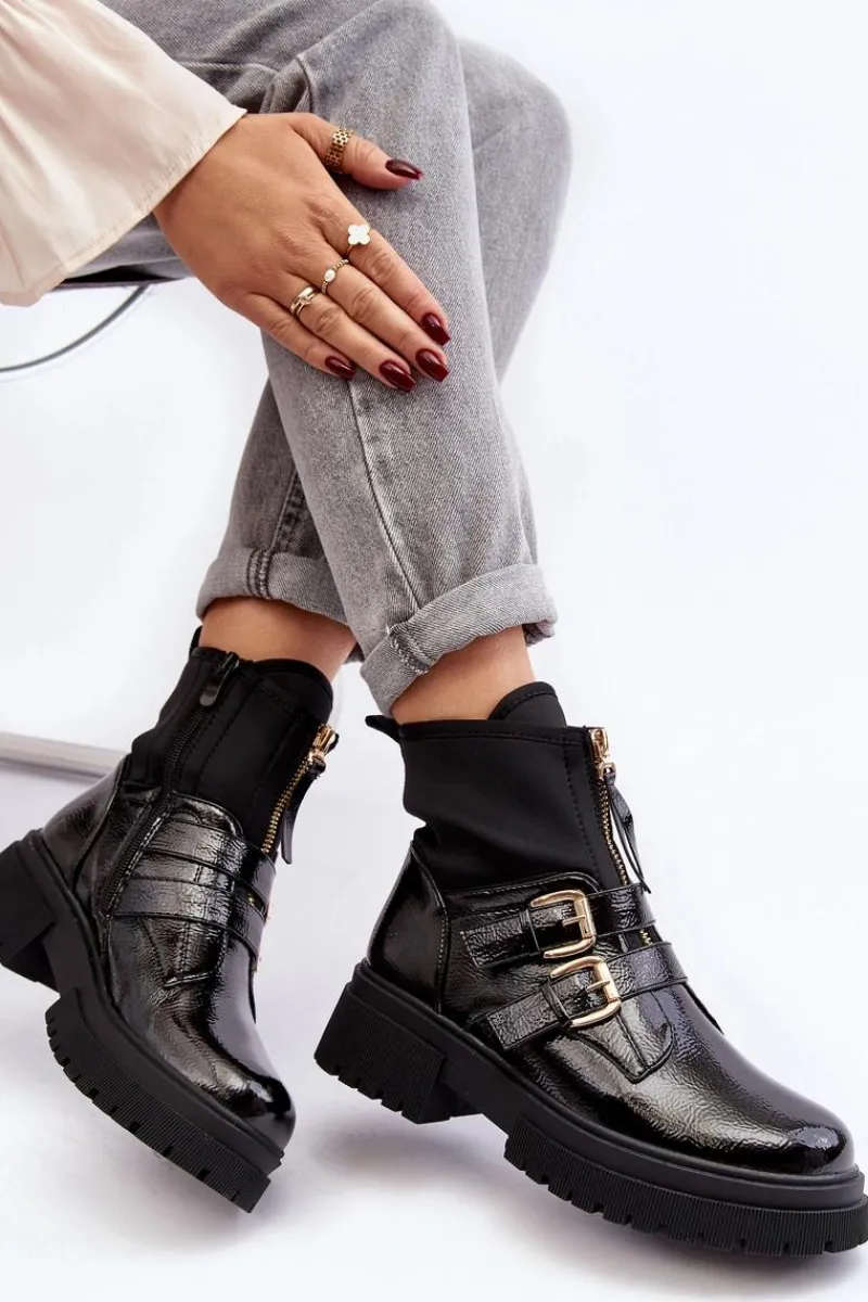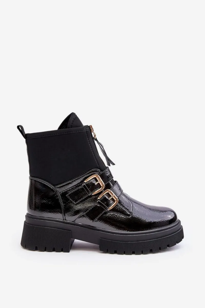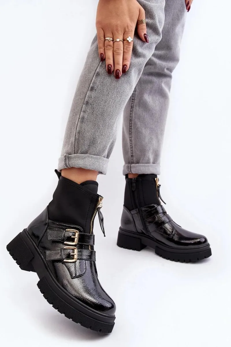 Modne botki damskie zostały wykonane z połączenia eko skóry i materiału tekstylnego. Osadzone na płaskim obcasie i platformie. Model ten posiada dwa suwaki oraz paski ze złotymi klamrami. Noski zaokrąglone. Koniecznie sprawdź pozostałe modele płaskich botków! Przy wyborze rozmiaru prosimy sugerować się tabelą rozmiarów.