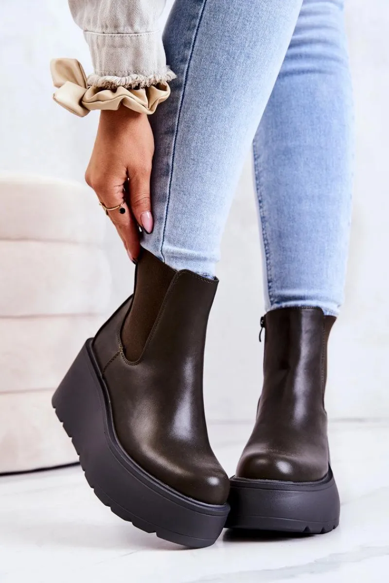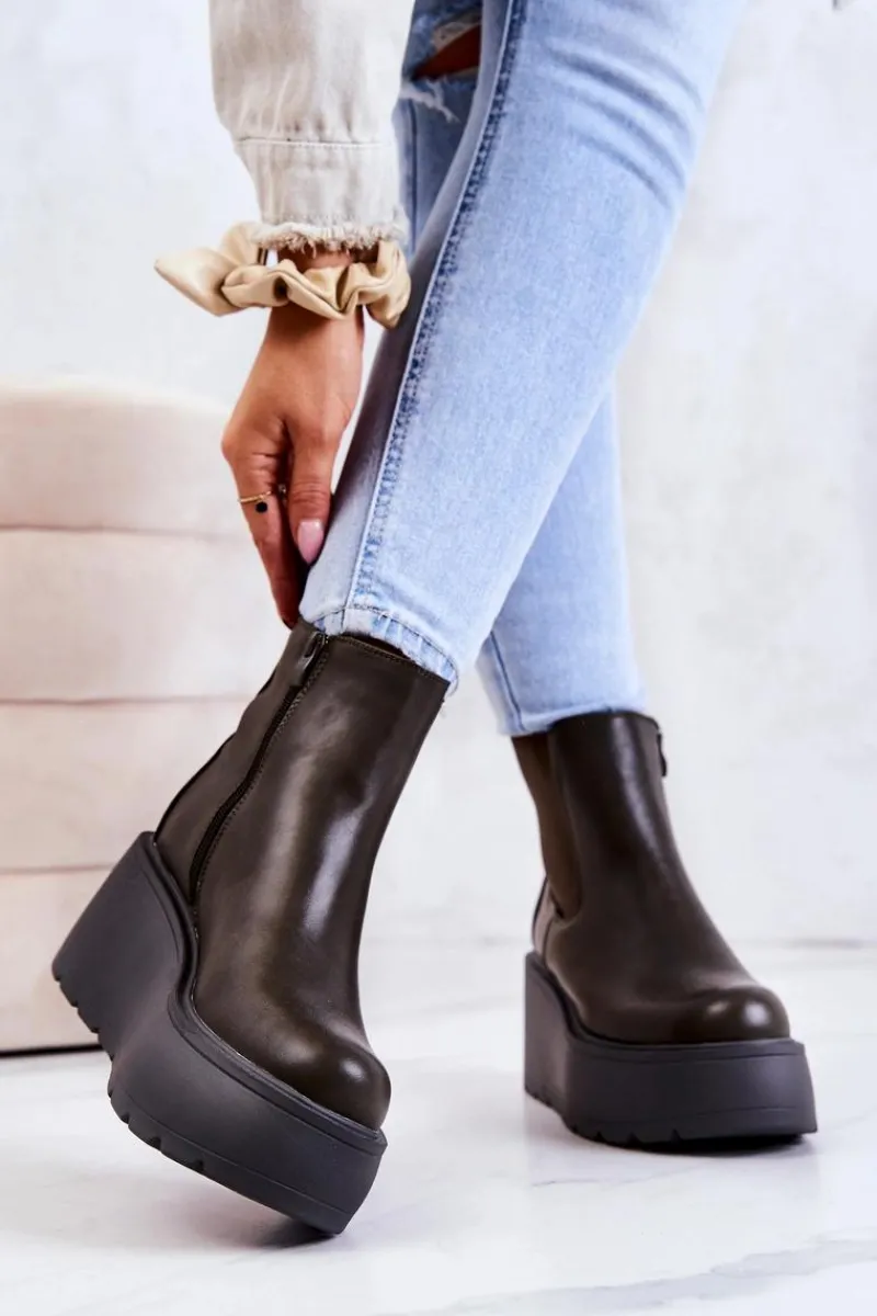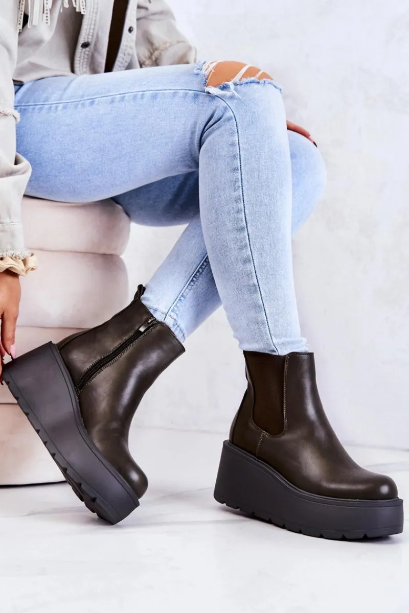 Botki damskie wykonane z eko skóry. Wnętrze botków ocieplone jest miłym w dotyku kocem obuwniczym. Wysoka platforma. Przy wyborze rozmiaru prosimy sugerować się tabelą rozmiarów.