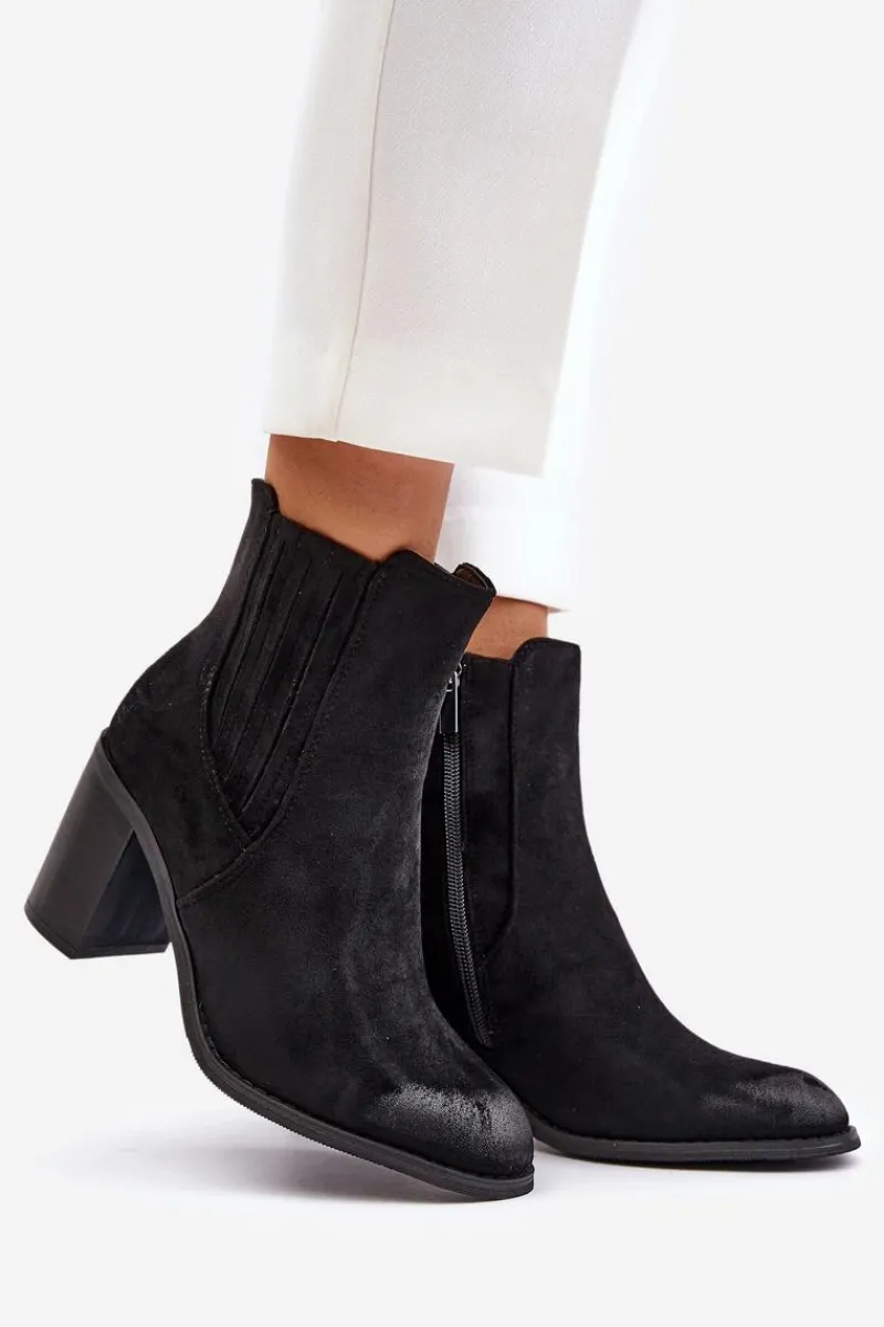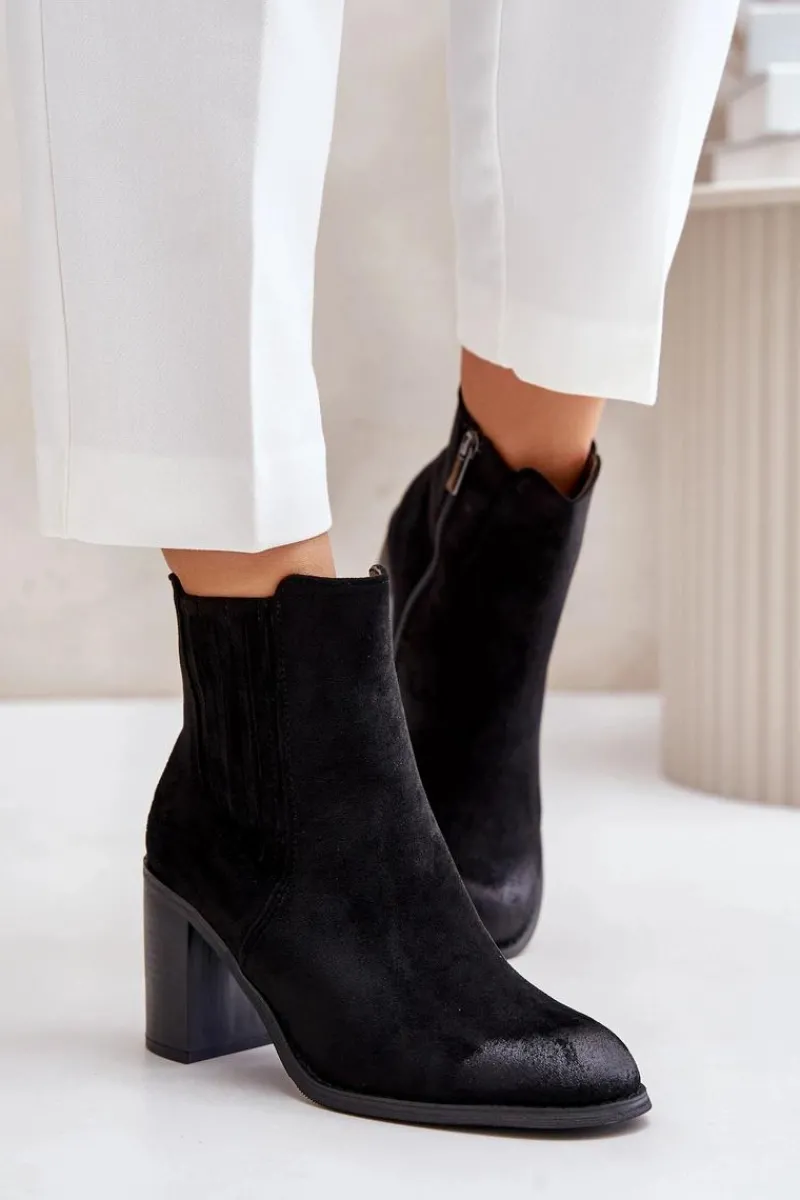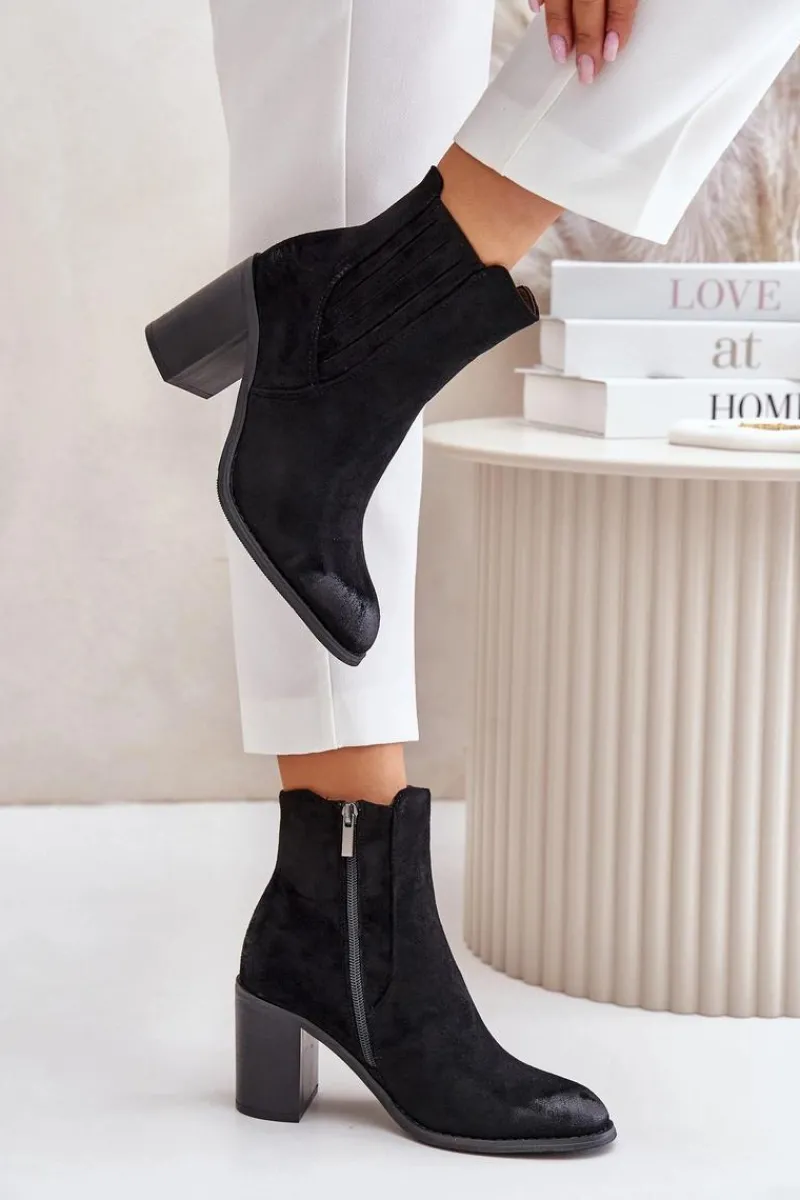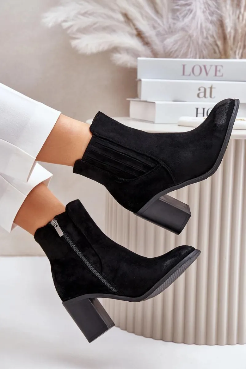 Botki wykonane z miłego w dotyku eko zamszu. Osadzone na obcasie w formie słupka. Wnętrze ocieplane kocem obuwniczym. Idealne do wielu stylizacji np.: do sukienek, spódnic czy spodni. Te botki koniecznie powinny znaleźć się w Twojej jesienno-zimowej garderobie! Przy wyborze rozmiaru prosimy sugerować się tabelą rozmiarów.