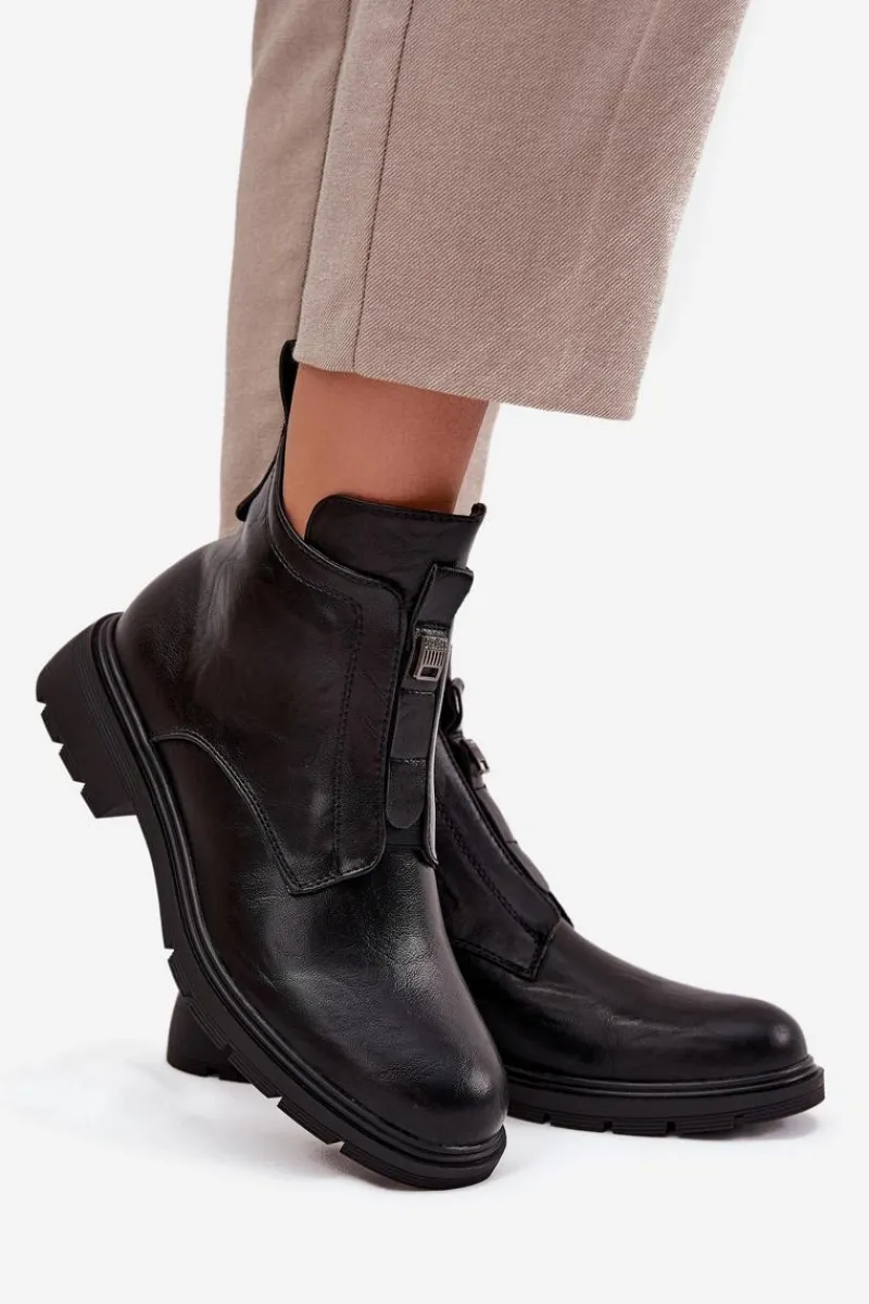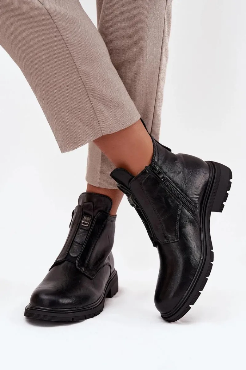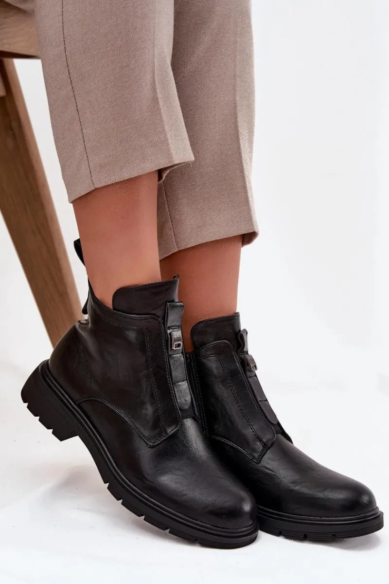 Botki damskie od marki Jezzi to praktyczne połączenie wygody i stylu na chłodniejsze dni. Wykonane z wysokiej jakości eko skóry, prezentują elegancki wygląd przy zachowaniu trwałości i łatwości w utrzymaniu. Osadzone na płaskim obcasie, zapewniają stabilny krok i komfort podczas codziennego noszenia. Model jest zapinany na zamek, co ułatwia szybkie zakładanie i dopasowanie do stopy. Wnętrze ocieplone, gwarantuje ciepło w chłodne dni, a subtelny, ozdobny detal z przodu cholewki dodaje charakteru i modnego akcentu, który wyróżnia je w codziennych stylizacjach. Idealne do casualowych zestawów, jak i do nieco bardziej eleganckich outfitów. Przy wyborze rozmiaru prosimy sugerować się tabelą rozmiarów.