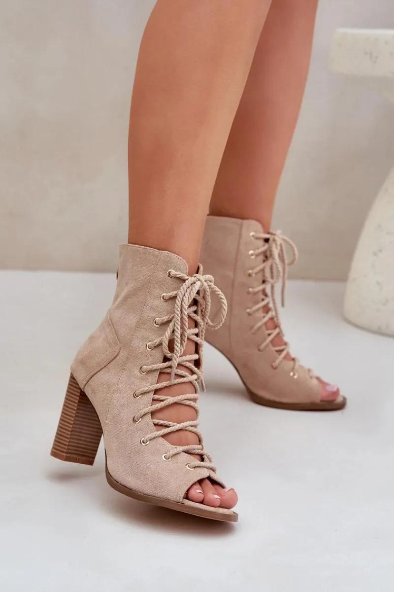 Sandały damskie z eko zamszu to elegancka propozycja na ciepłe dni. Osadzone na obcasie słupku, który zapewnia stabilność i wygodę. Sznurowana cholewka dodaje im nowoczesnego, a zarazem kobiecego charakteru, natomiast z tyłu znajdujące się zapięcie na zamek ułatwia ich zakładanie i zdejmowanie. Te sandały świetnie komponują się w letnich stylizacjach, łącząc styl, komfort i funkcjonalność. Przy wyborze rozmiaru prosimy sugerować się tabelą rozmiarów.
