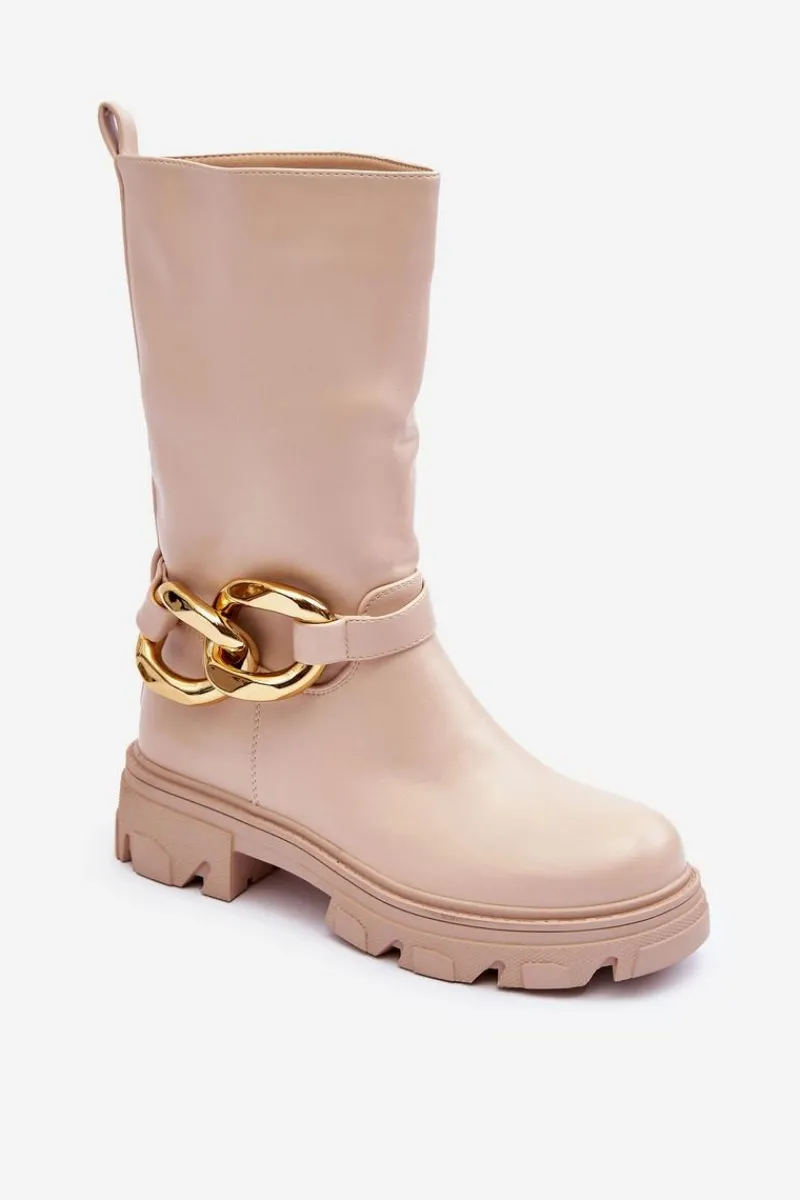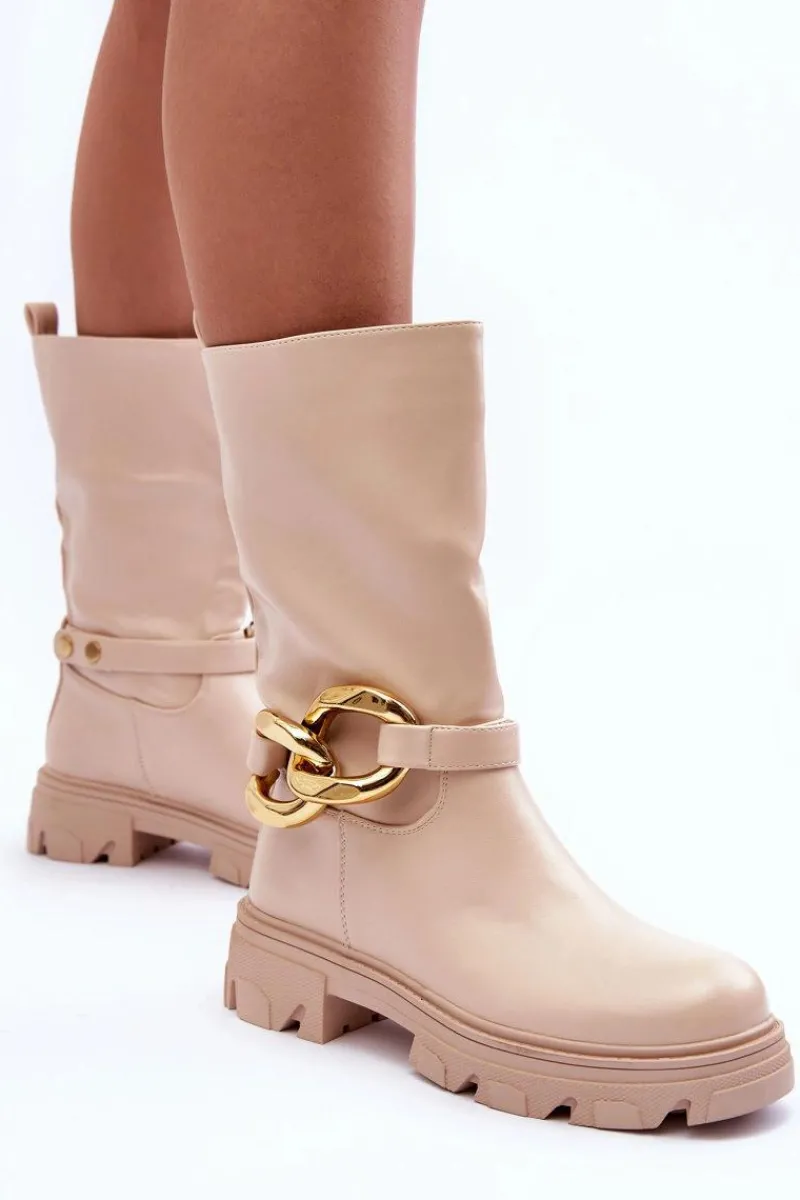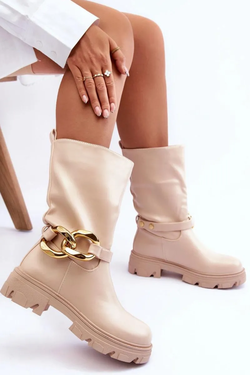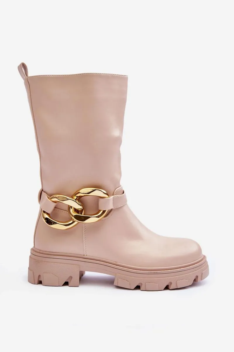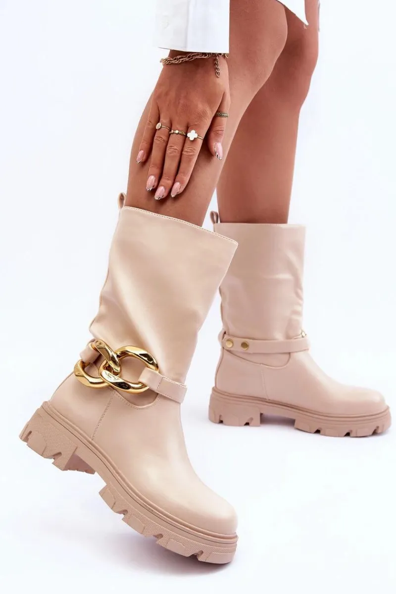 Modne kozaki damskie zostały wykonane z eko skóry. Osadzone na płaskim masywnym obcasie oraz platformie. Fason do połowy łydki. Model ten jest wsuwany oraz posiada odpinany paseczek z ozdobą. Ocieplone są kocem obuwniczym. Przy wyborze rozmiaru prosimy kierować tabelą rozmiarów.