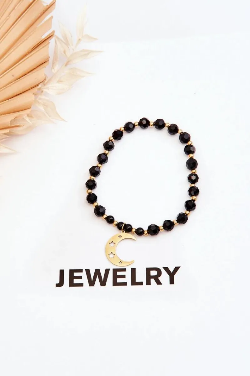 Śliczna bransoletka na żyłce, która delikatnie się rozciąga. Wykonana ze stali nierdzewnej i ozdobnych, oszlifowanych koralików z tworzywa. Posiada piękną zawieszkę z motywem księżyca z gwiazdami. Będzie idealnie prezentować się do wielu stylizacji.