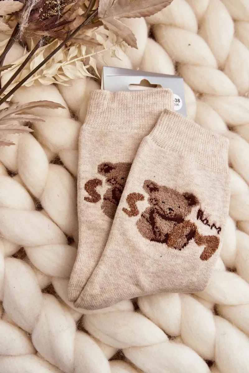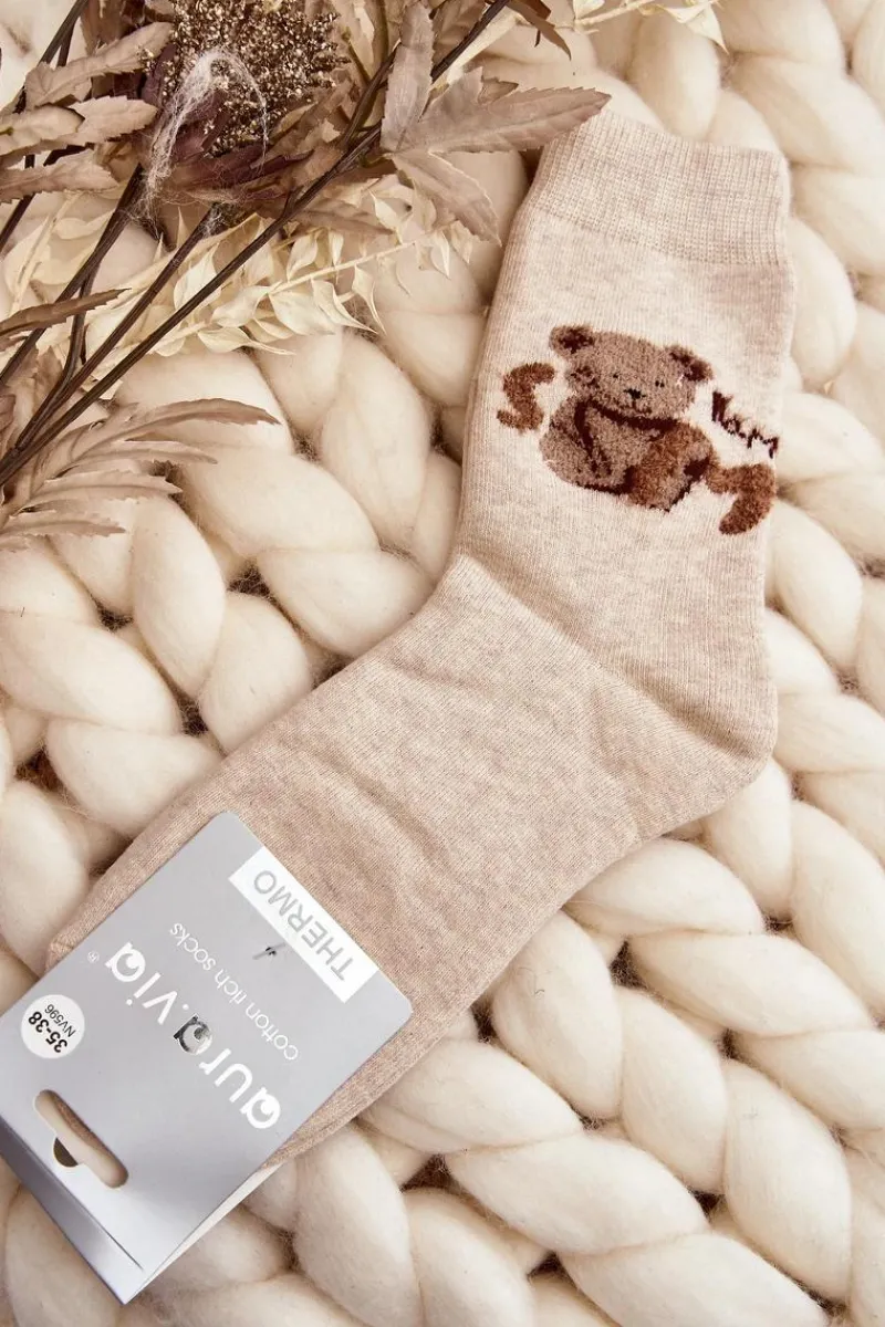 Ciepłe skarpety damskie idealne na mroźne dni. Model z naszywką w postaci misia. Lekki ściągacz sprawi, że będą idealnie dopasowane do tęgości nogi. Koniecznie powinnaś je mieć!