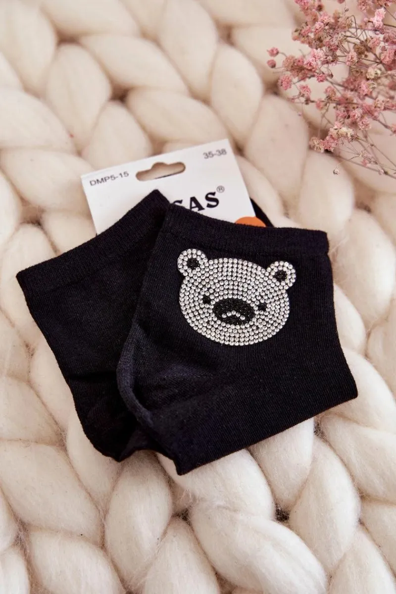 Damskie skarpetki zostały wykonane z wysokiej jakości bawełny z domieszką spandexu. Ozdobiono je mieniącymi się dżetami w postaci cyrkonii w kształcie misia. Delikatny ściągacz sprawi, że skarpetki będą idealnie dopasowane. Model za kostkę. Świetnie będą prezentować się do sportowego obuwia.