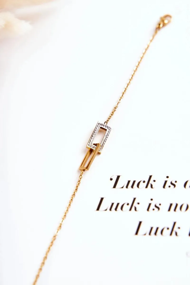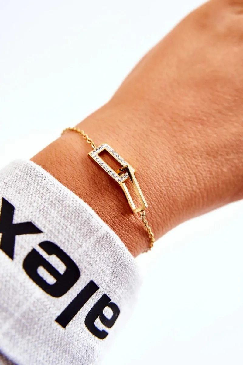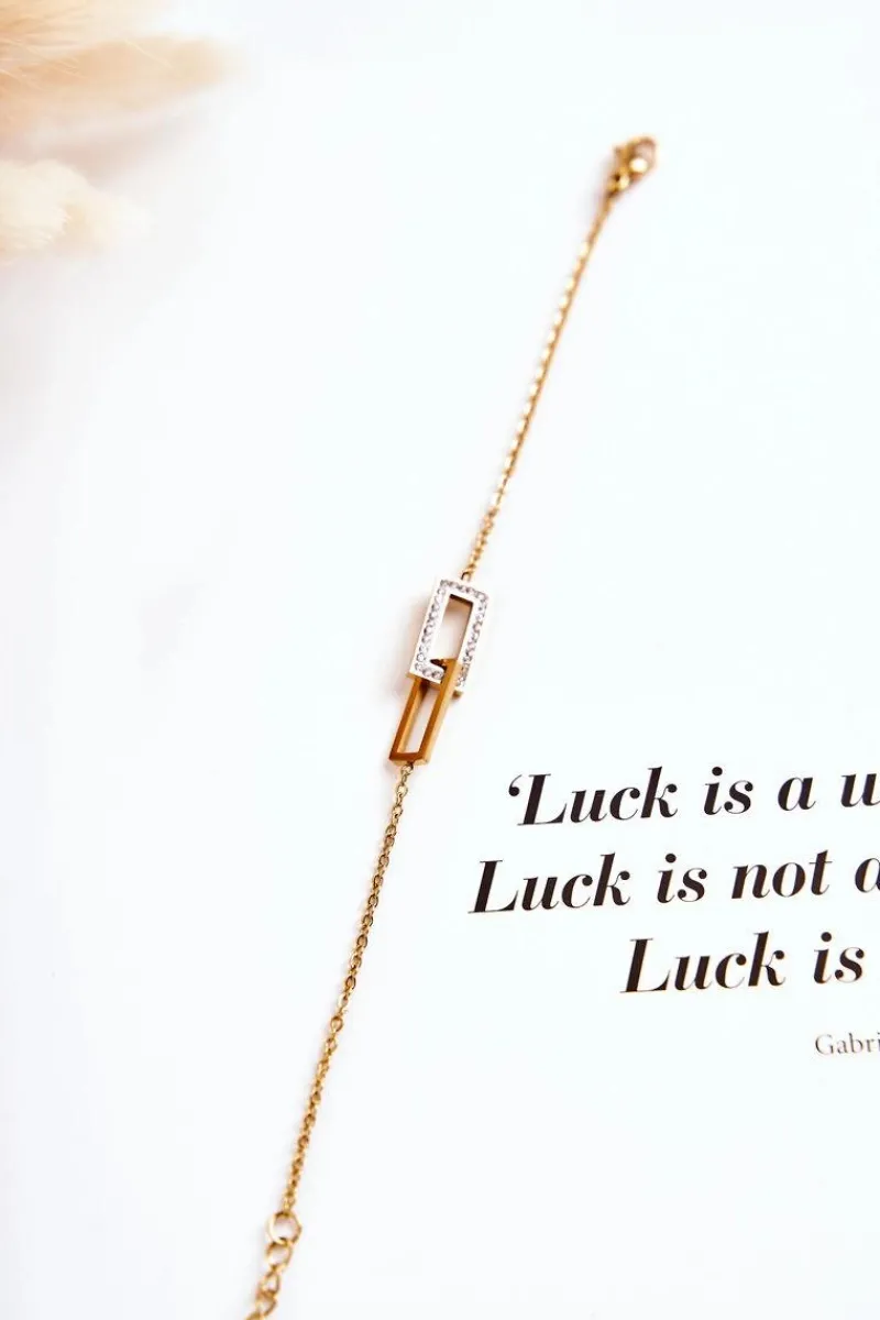 Damska bransoletka na cienkim łańcuszku typu celebrytka. Została wykonana ze stali nierdzewnej. Posiada możliwość regulacji długości. Na środku bransoletki znajduje się ozdoba w postaci dwóch prostokątów, z czego jeden jest przyozdobiony cyrkoniami. Taki rodzaj biżuterii jest świetnym dodatkiem do stylizacji nie tylko tych codziennych, ale i tych bardziej eleganckich. Model ten posiada klasyczne zapięcie. Koniecznie sprawdź także pozostałe modele biżuterii dostępnej w naszej ofercie!