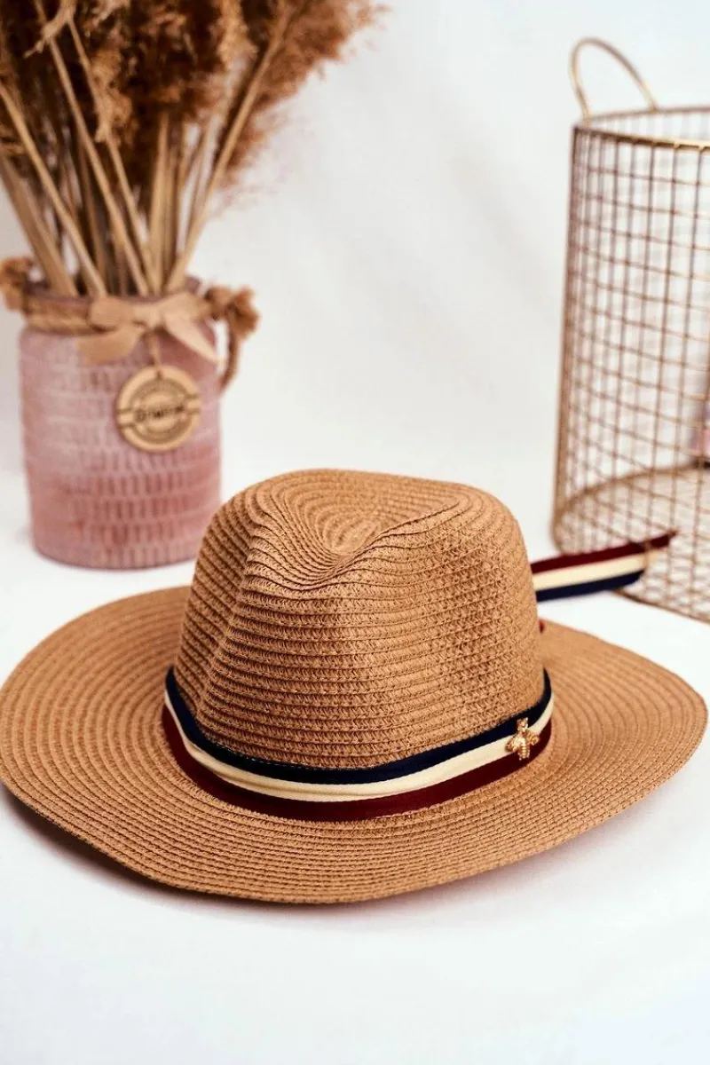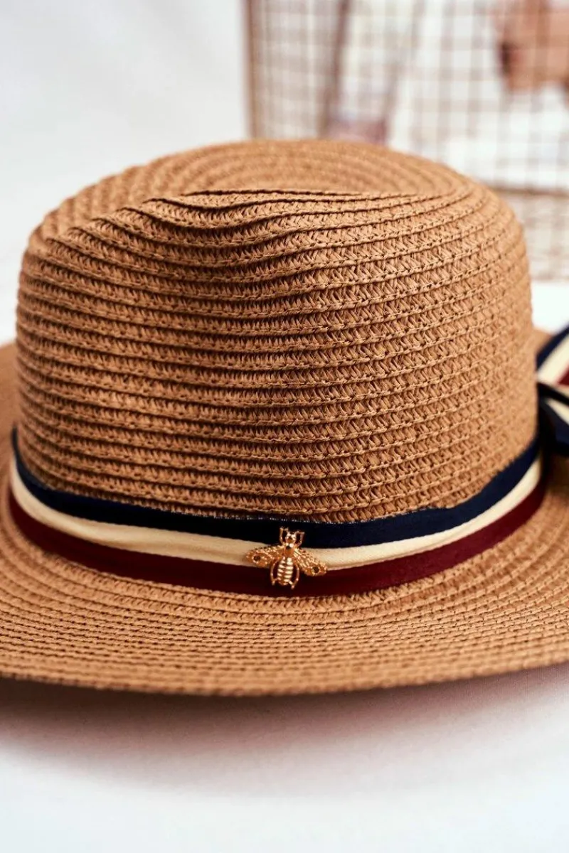 Outlet Damski Kapelusz Panama 100% Papier Camel Wstążka Złota Mucha Okrycia Głowy
