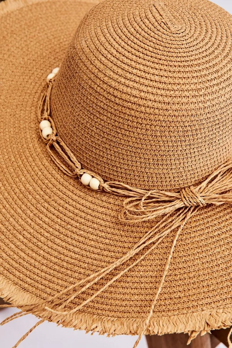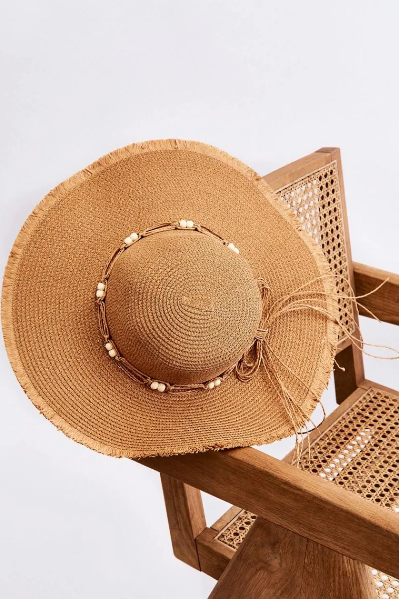 Ten kapelusz powinien być Twój! Idealny model na słoneczne dni! Kapelusz został wykonany w 100% z papieru. Posiada ozdobne sznureczki z koralikami zawiązane na kokardę. Płaskie rondo na brzegach posiada strzępienia. Wewnątrz kapelusza znajduje się sznureczek umożliwiający regulację obwodu.