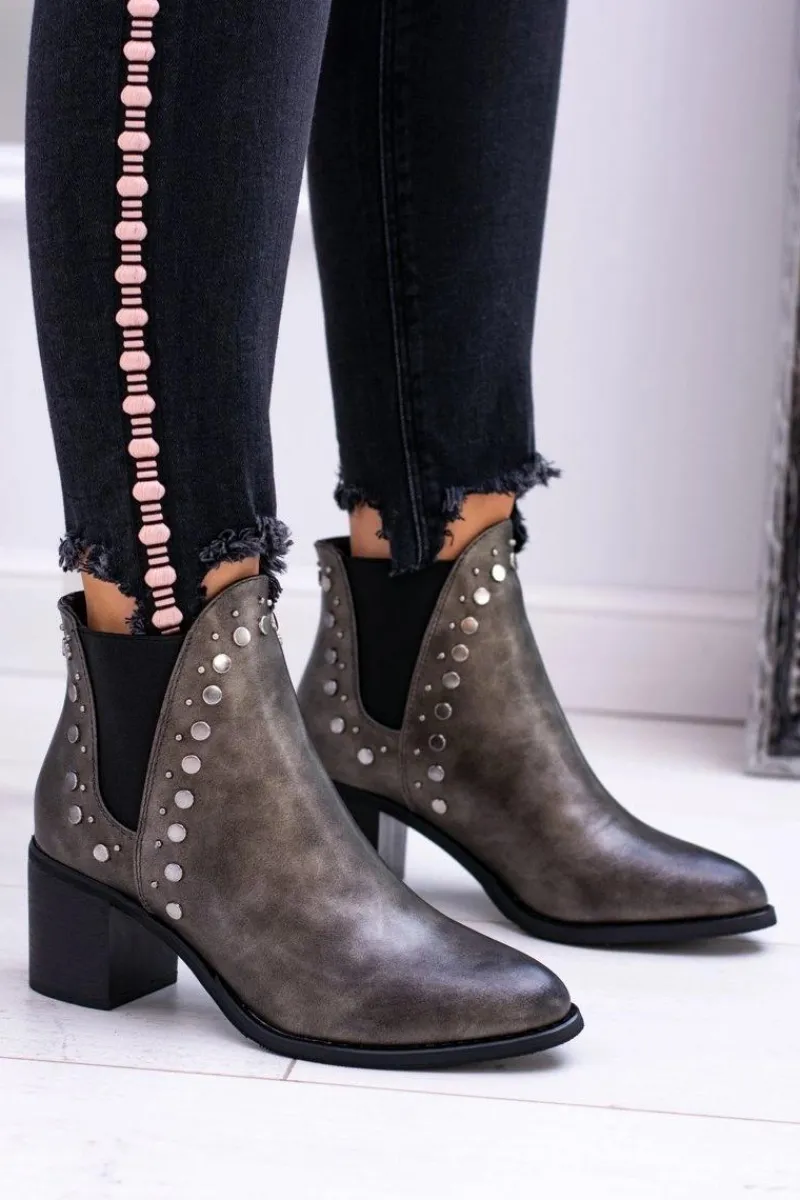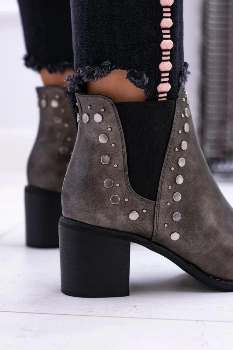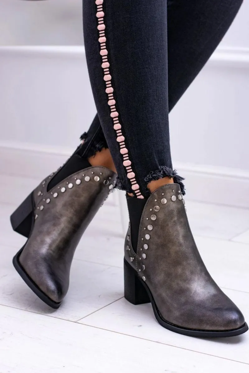 Podczas chłodniejszych dni warto zwrócić szczególną uwagę na buty. Dzięki nim podkreślimy nasze stylizacje a dodatkowo dadzą nam maksimum komfortu w każdej sytuacji. Klasyczne botki z gumkami na boku. Cholewka zdobiona małymi nitami. Wnętrze delikatnie ocieplone futerkiem. Koniecznie sprawdź całą naszą kolekcję sztybletów w super cenach!