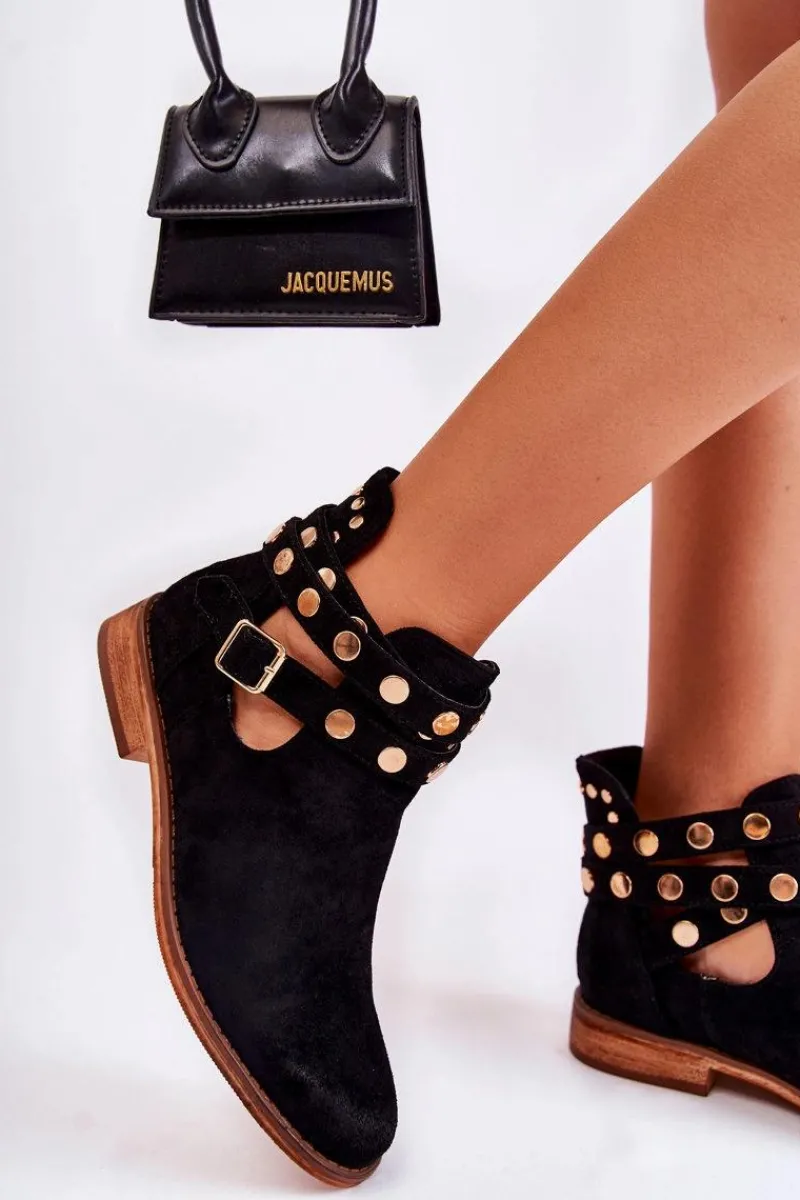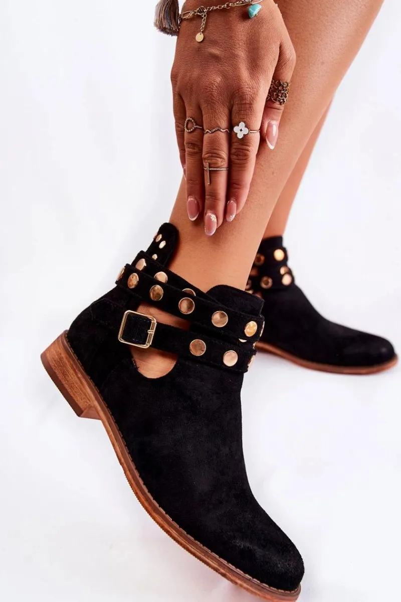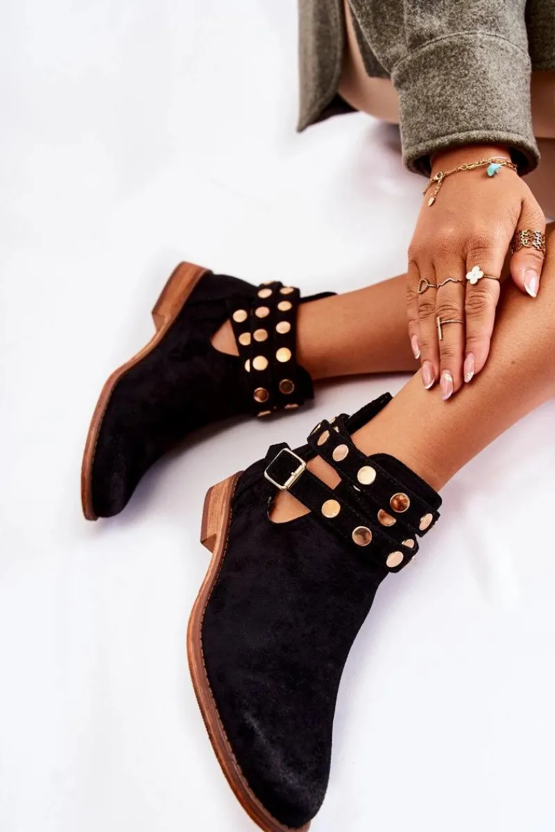 Wyjątkowe botki damskie z dżetami na paskach oraz z tyłu cholewki. Botki wykonane są z eko zamszu. Miękka wkładka z eko skóry oraz wygodny, płaski obcas zadbają o Twój komfort. Botki dopełnią wiele Twoich stylizacji! Posiadają wycięcia z boku cholewki. Podeszwa antypoślizgowa. Koniecznie sprawdź całą naszą kolekcję damskich botków! Przy wyborze rozmiaru prosimy sugerować się tabelą rozmiarów.