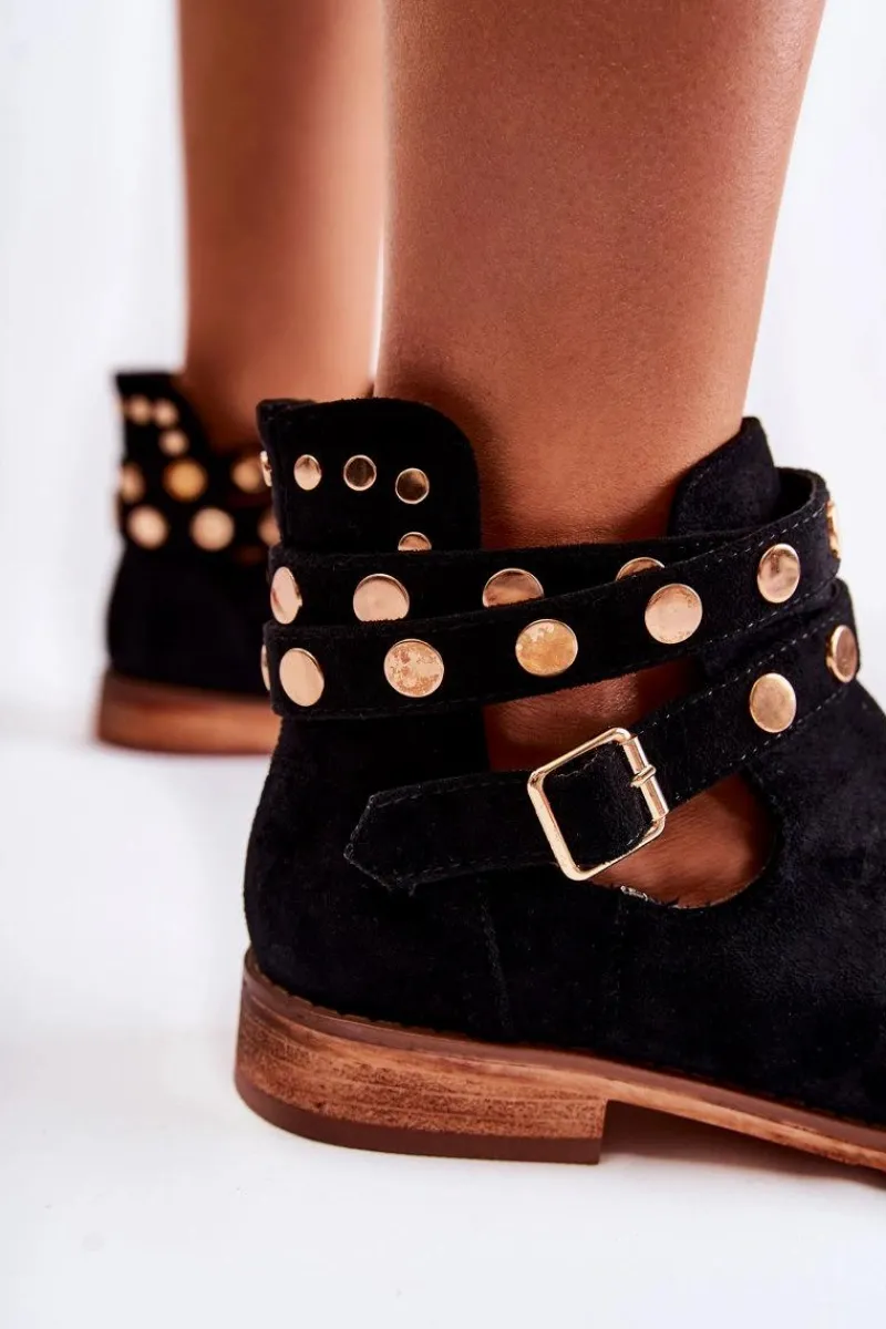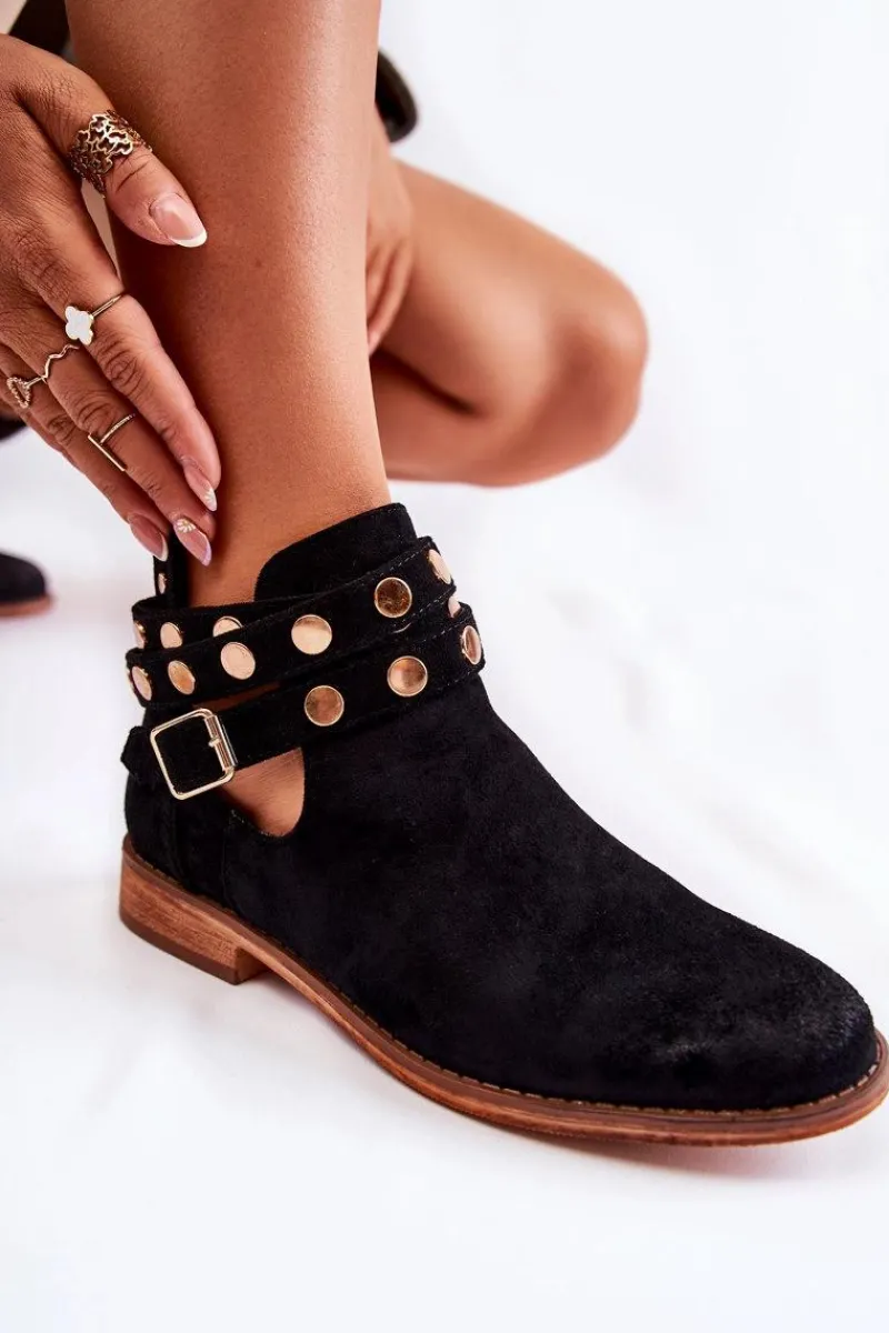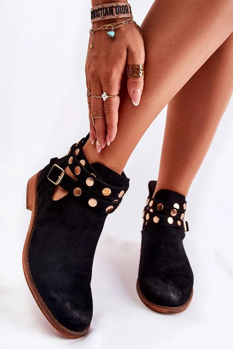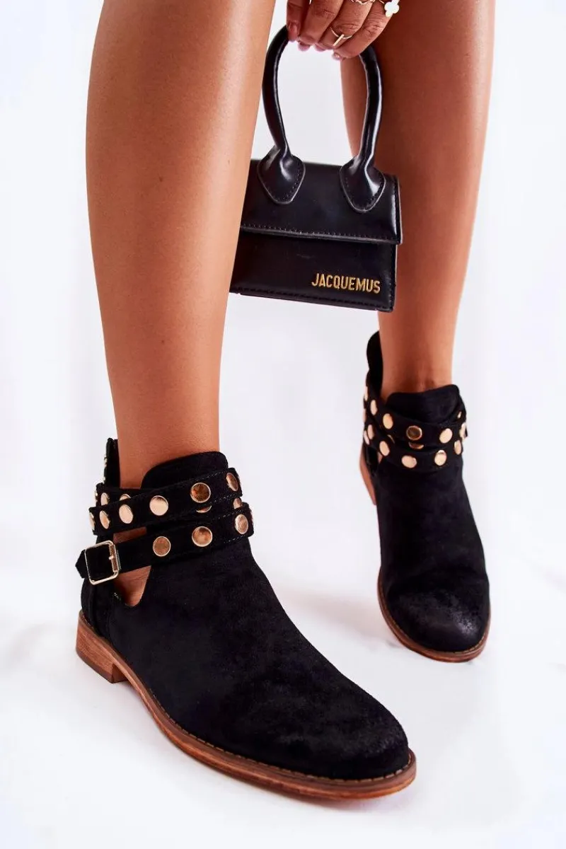 Wyjątkowe botki damskie z dżetami na paskach oraz z tyłu cholewki. Botki wykonane są z eko zamszu. Miękka wkładka z eko skóry oraz wygodny, płaski obcas zadbają o Twój komfort. Botki dopełnią wiele Twoich stylizacji! Posiadają wycięcia z boku cholewki. Podeszwa antypoślizgowa. Koniecznie sprawdź całą naszą kolekcję damskich botków! Przy wyborze rozmiaru prosimy sugerować się tabelą rozmiarów.