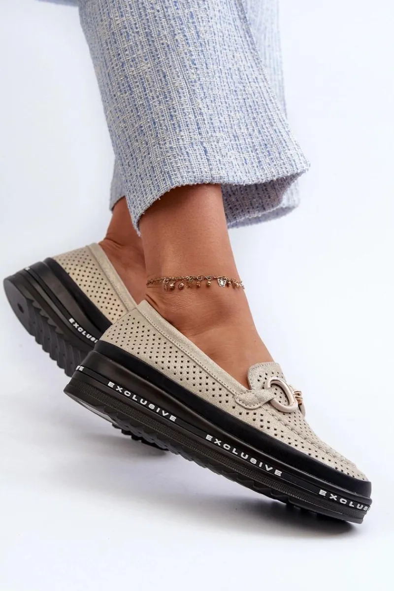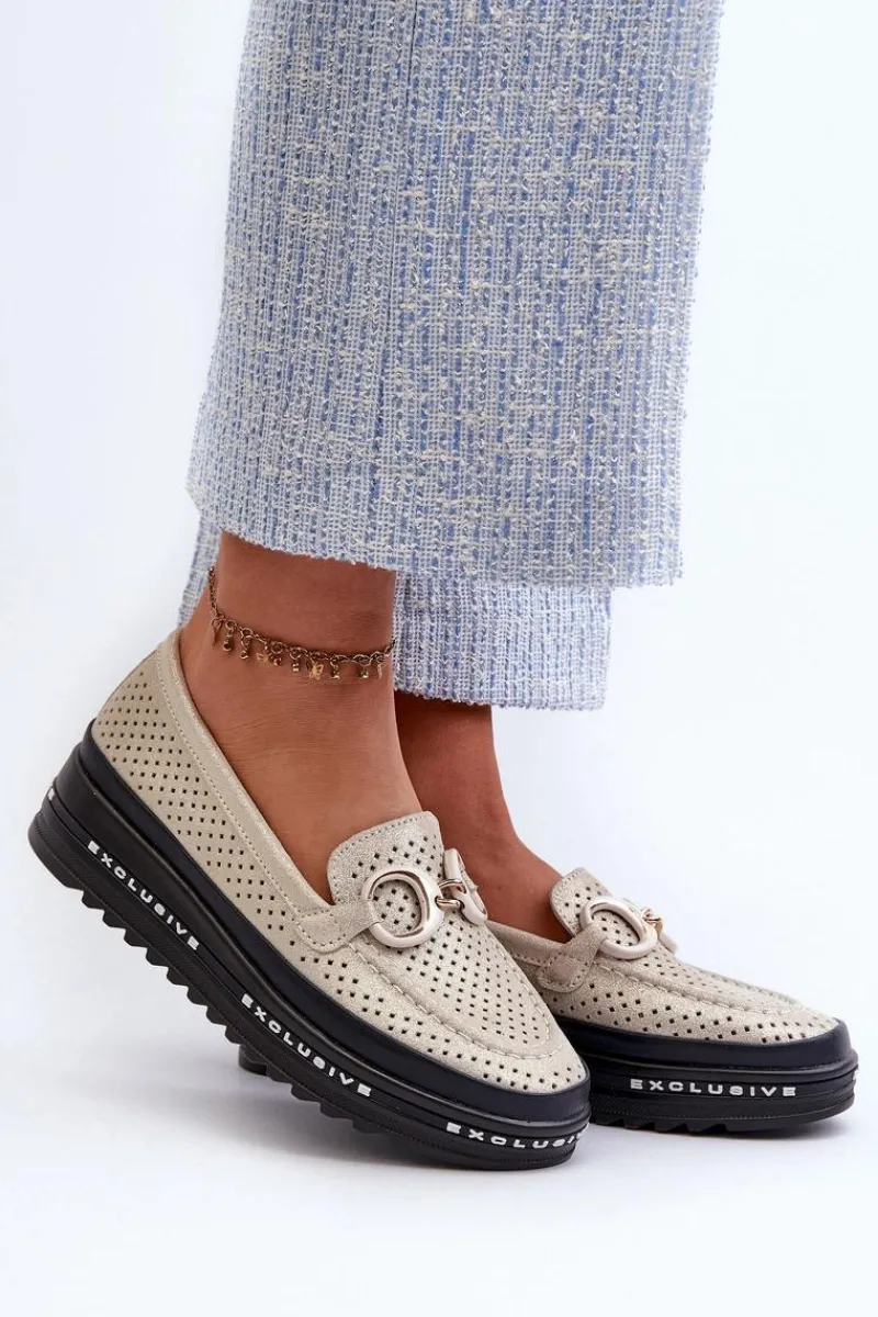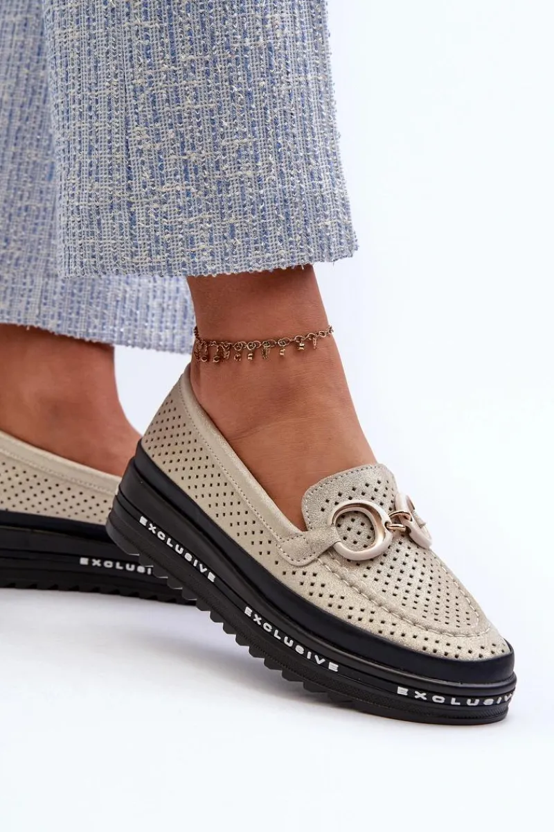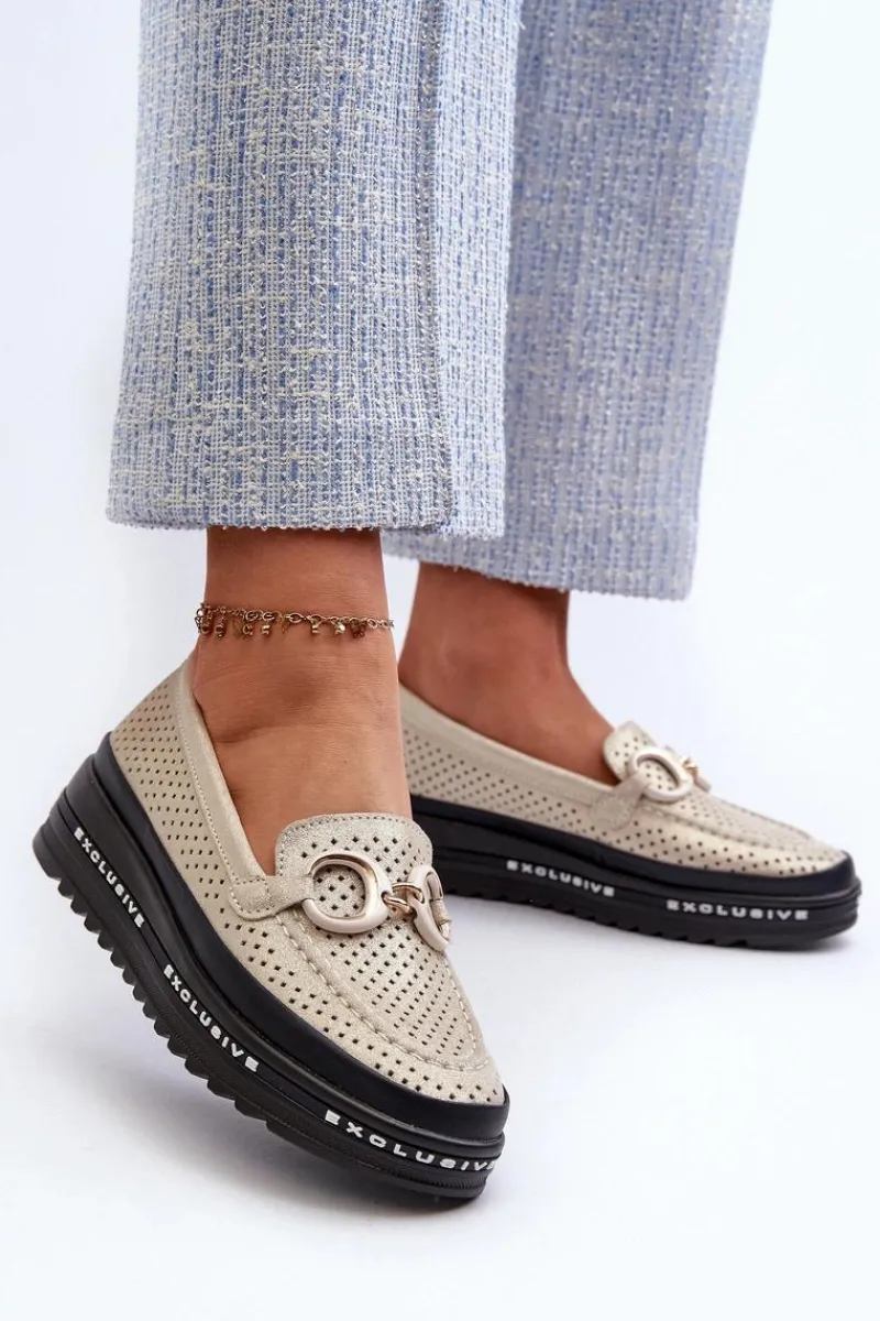 Outlet Damskie buty S.Barski Skórzane Błyszczące Mokasyny Damskie Na Platformie Z Ozdobą S.Barski LR750 Złote Złoty