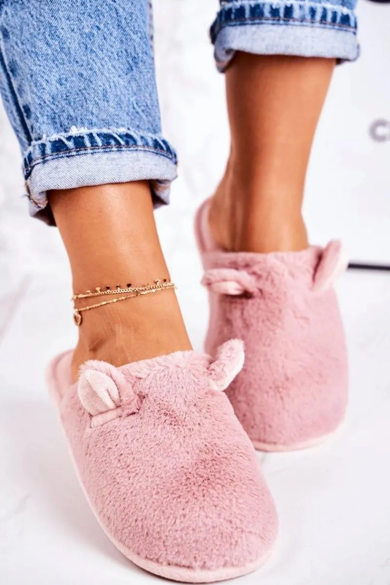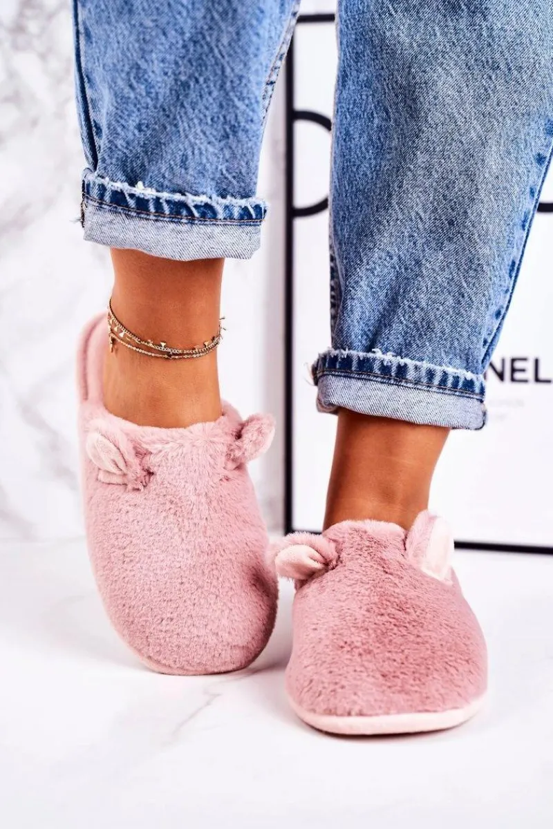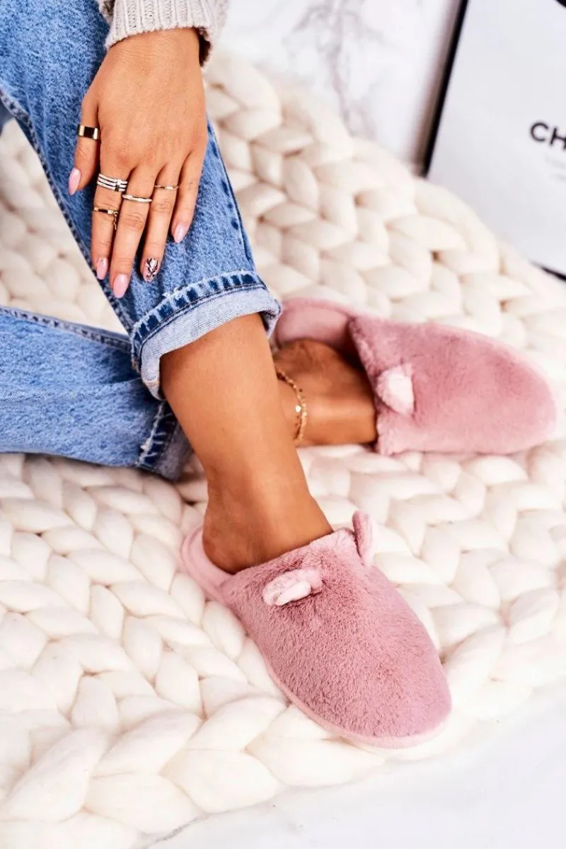 Outlet Damskie Futrzane Papcie Z Uszami Pudrowy Róż Hippo Damskie Kapcie Klasyczne