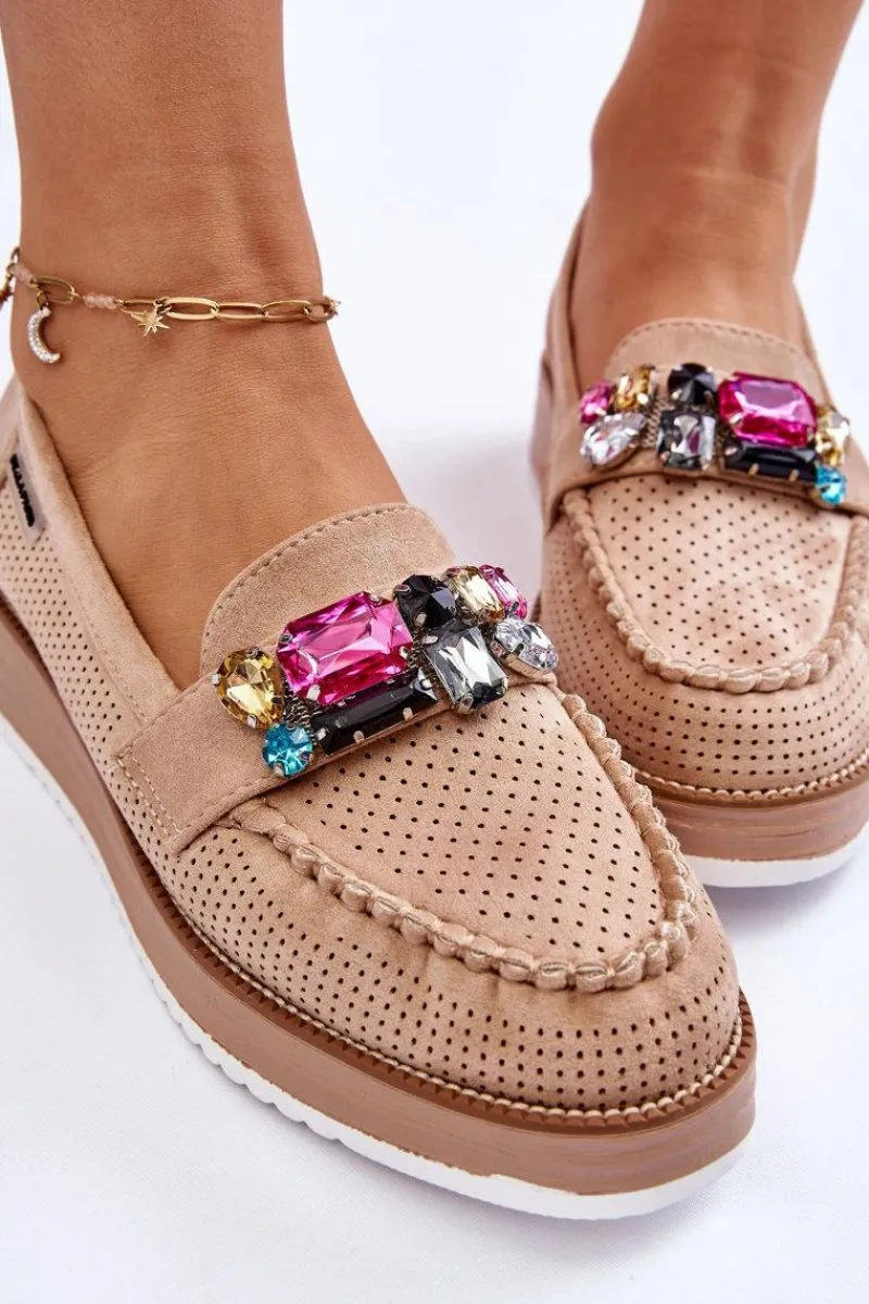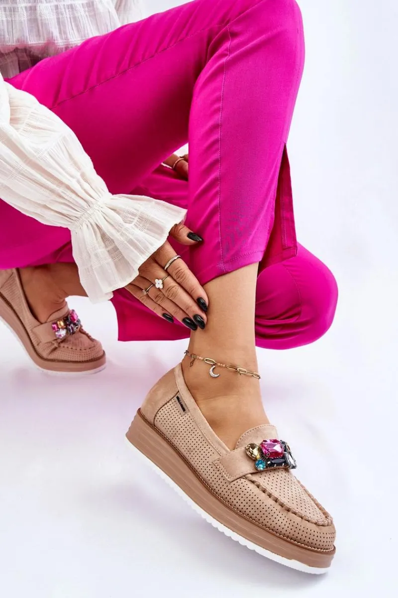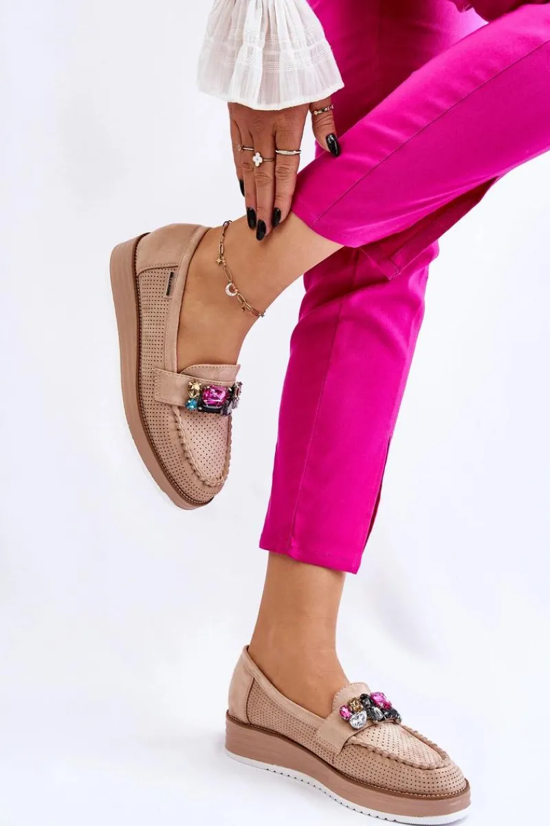 Piękne mokasyny damskie zostały osadzone na delikatnym koturnie i platformie. Wykonane z materiału przypominającego eko zamsz. Miękka wkładka z naturalnej skóry zapewni wygodę podczas użytkowania, nawet przez cały dzień! Na przodzie znajdują się ozdobne elementy imitujące cyrkonie. Świetny model do wiosenno-jesiennych stylizacji! Przy wyborze rozmiaru prosimy sugerować się tabelą rozmiarów.