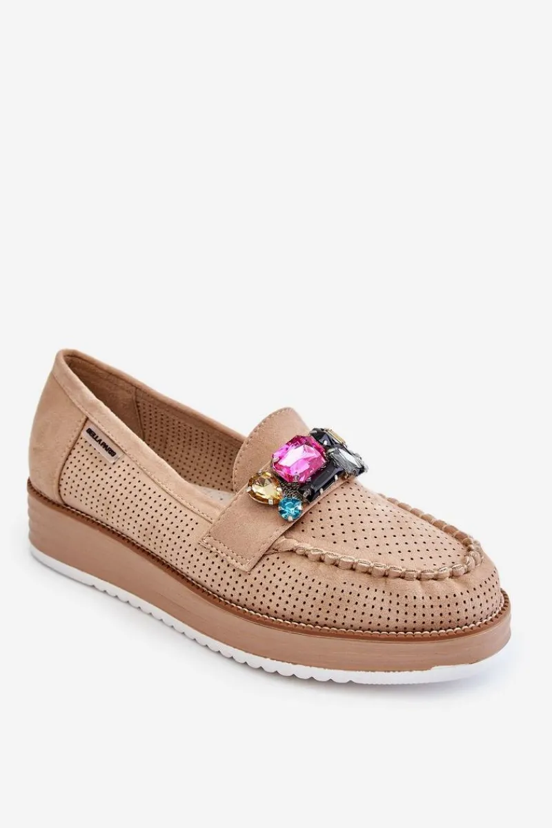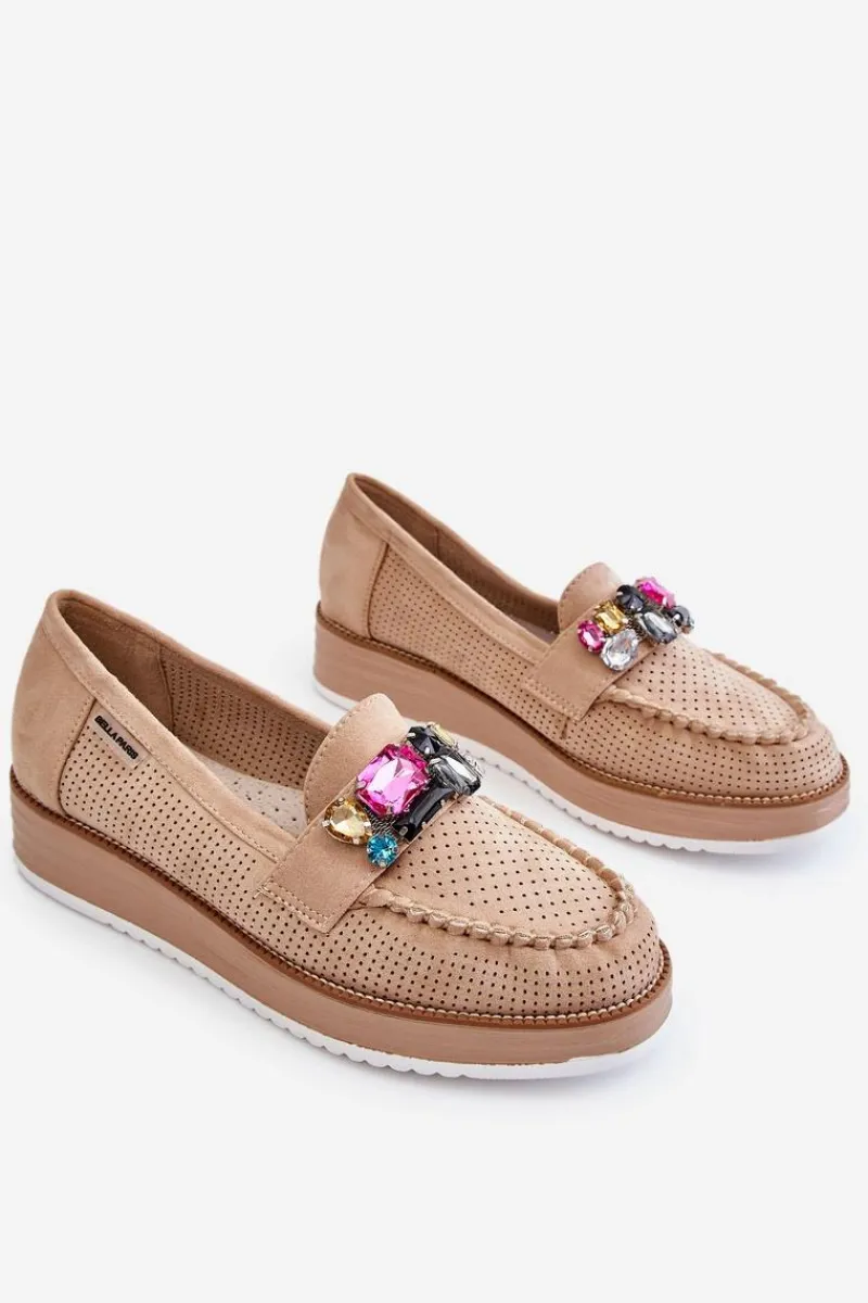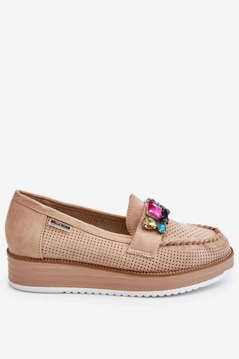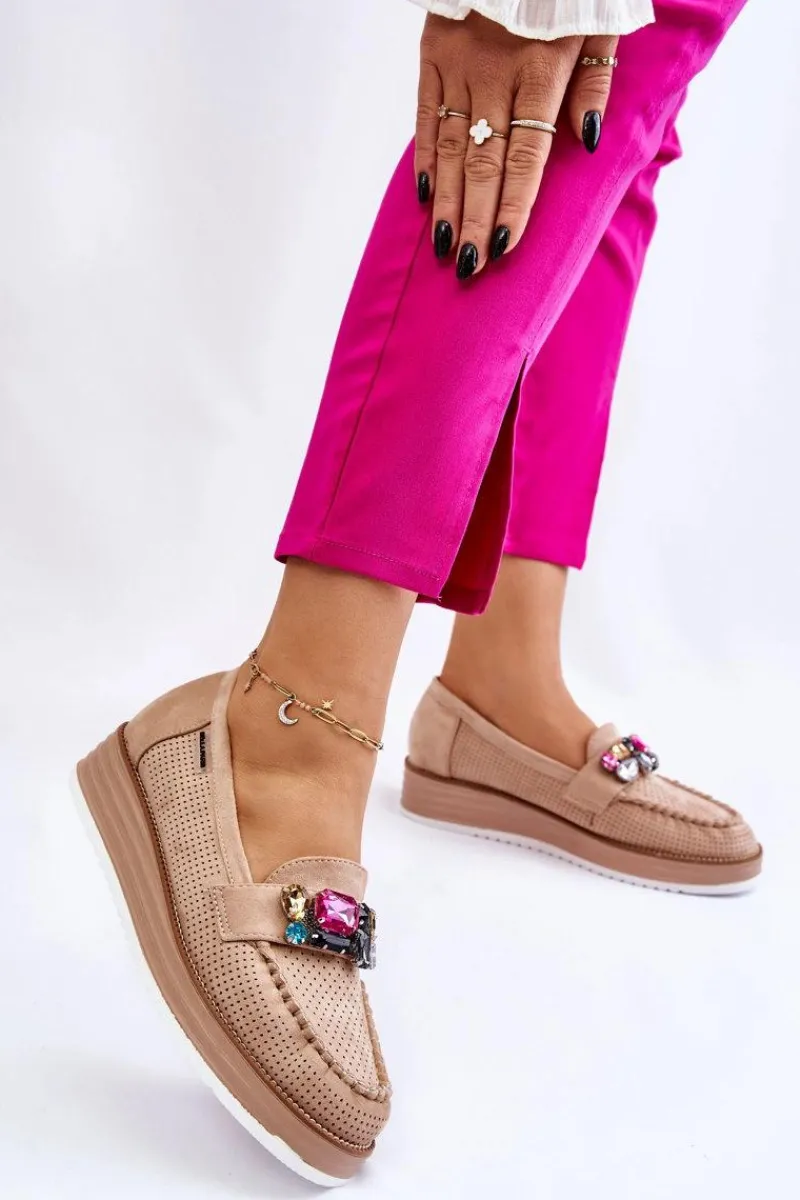 Piękne mokasyny damskie zostały osadzone na delikatnym koturnie i platformie. Wykonane z materiału przypominającego eko zamsz. Miękka wkładka z naturalnej skóry zapewni wygodę podczas użytkowania, nawet przez cały dzień! Na przodzie znajdują się ozdobne elementy imitujące cyrkonie. Świetny model do wiosenno-jesiennych stylizacji! Przy wyborze rozmiaru prosimy sugerować się tabelą rozmiarów.