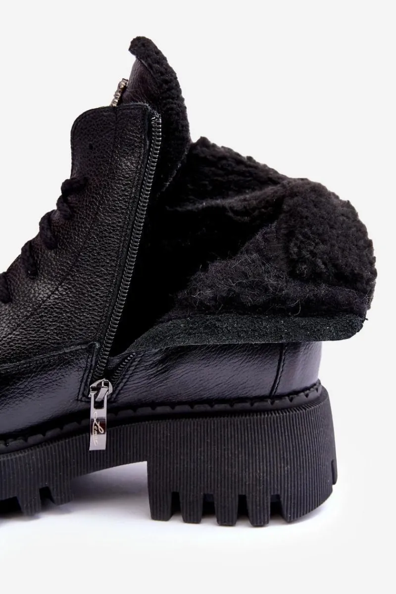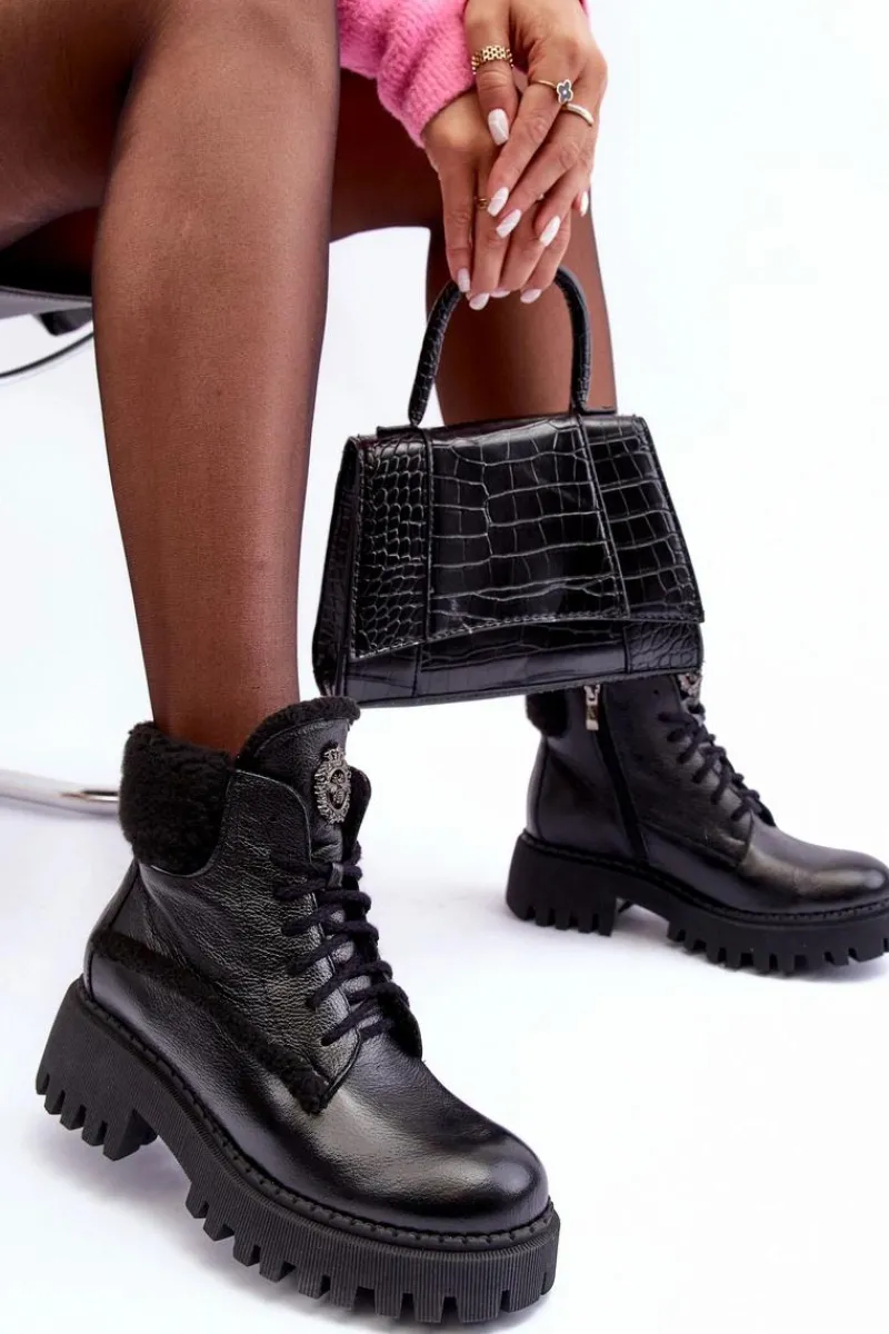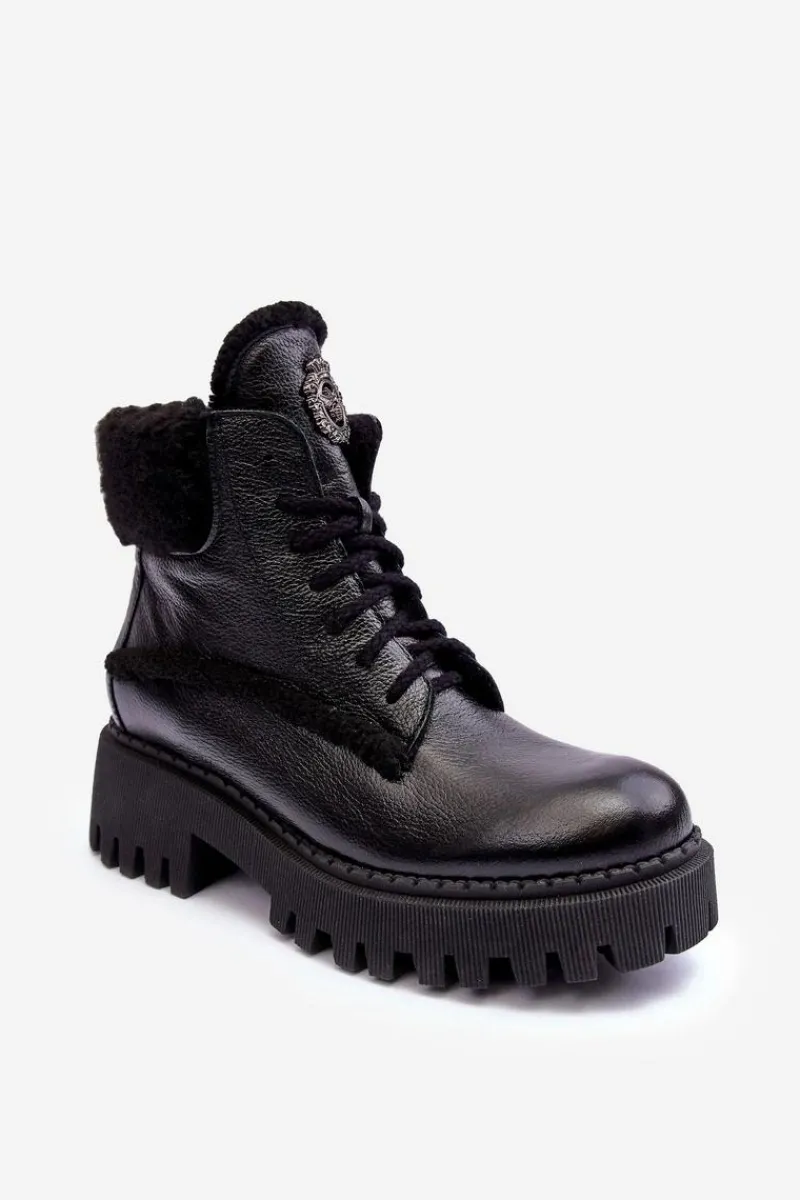 Botki w formie traperów zostały osadzone na masywnym obcasie. Podeszwa z bieżnikiem. Na języku znajduje się ozdobny element. Trapery wykonane zostały z wysokiej jakości naturalnych skór. Wewnątrz botki ocieplono wełną. Model ten posiada sznurowanie oraz suwak z boku cholewki. Dodatkowo zapiętek jest usztywniany. Przy wyborze rozmiaru prosimy sugerować się tabelą rozmiarów.