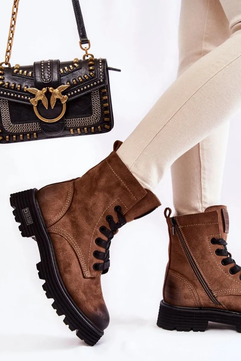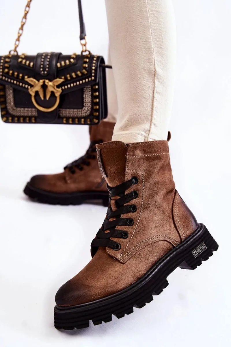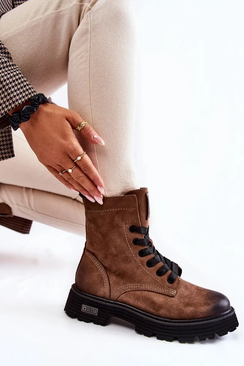 Wyjątkowe botki marki Big Star zostały wykonane z eko zamszu. Posiadają modne przetarcia przy nosku i z tyłu cholewki. Dodatkowo zapiętek jest usztywniany. Zapinane z boku cholewki na suwak oraz klasycznie sznurowane. Botki posiadają ocieplenie w postaci miłego w dotyku koca obuwniczego. Osadzone na delikatnej platformie i płaskim obcasie. Przy wyborze rozmiaru prosimy sugerować się tabelą rozmiarów.