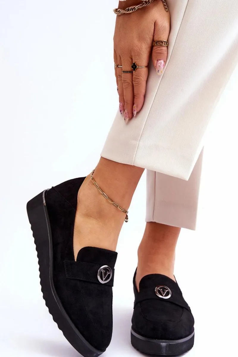 Damskie mokasyny zostały wykonane z wysokiej jakości eko skóry. Posiadają z przodu pasek z ozdobą w kształcie koła i literą V. Mokasyny zostały osadzone na platformie z niskim koturnem. Miękka wkładka z naturalnej skóry zapewni wygodę podczas użytkowania. Przy wyborze rozmiaru prosimy sugerować się tabelą rozmiarów.