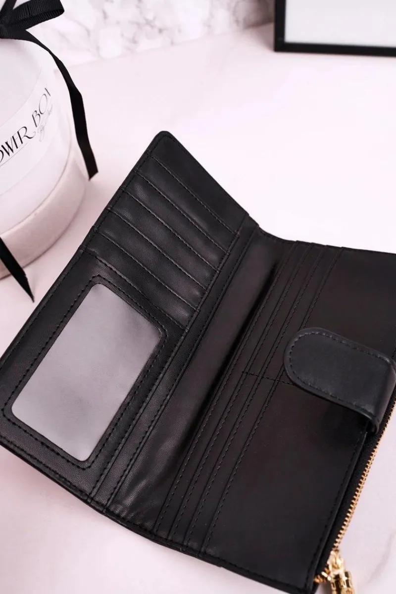 Duży i praktyczny portfel zapinany na zamek i zatrzask. Portfel pomieści bilon, banknoty oraz karty płatnicze i dokumenty. Wykonany ze skóry ekologicznej, dostępny w kilku kolorach. W zestawie znajduje się mała portmonetka zapinana na zamek.
