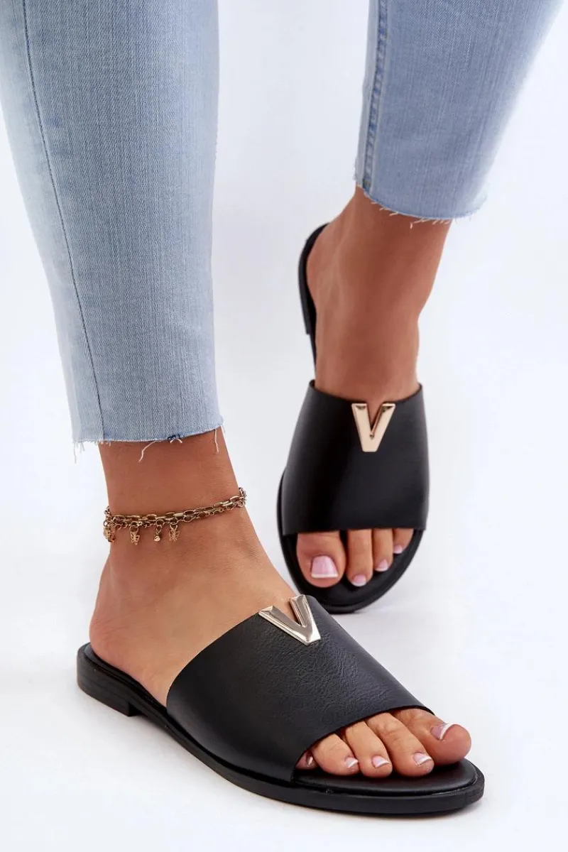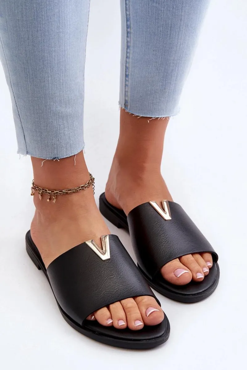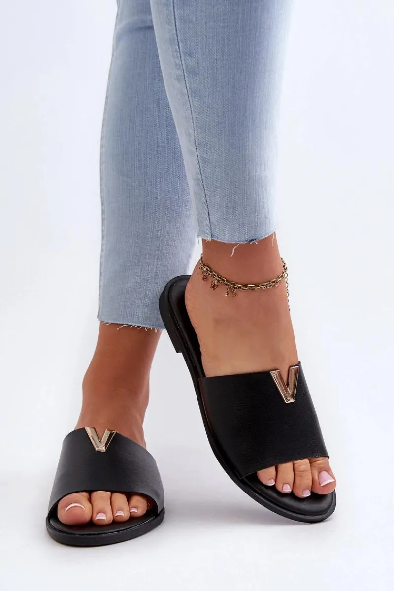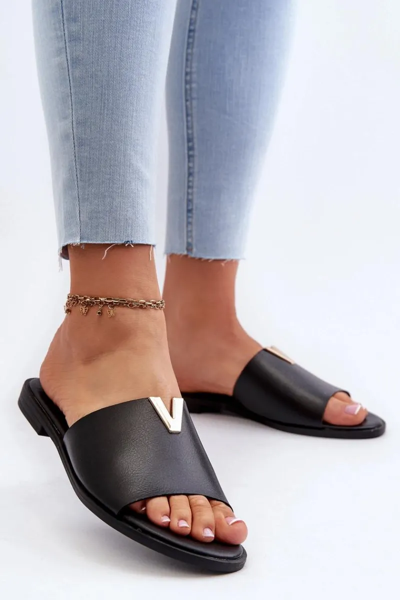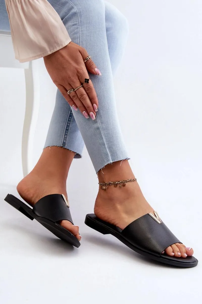 Klapki damskie wykonane ze skóry ekologicznej. Złoty element doda blasku Twojej letniej stylizacji. Osadzone na płaskim obcasie. Model ten będzie idealnym wyborem na wiele okazji! Przy wyborze rozmiaru prosimy sugerować się tabelą rozmiarów.