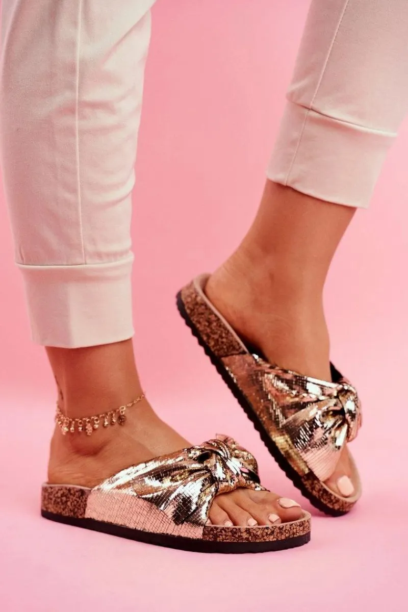 Outlet Evento Klapki Damskie z Dużą Kokardą Złote Lovely Time