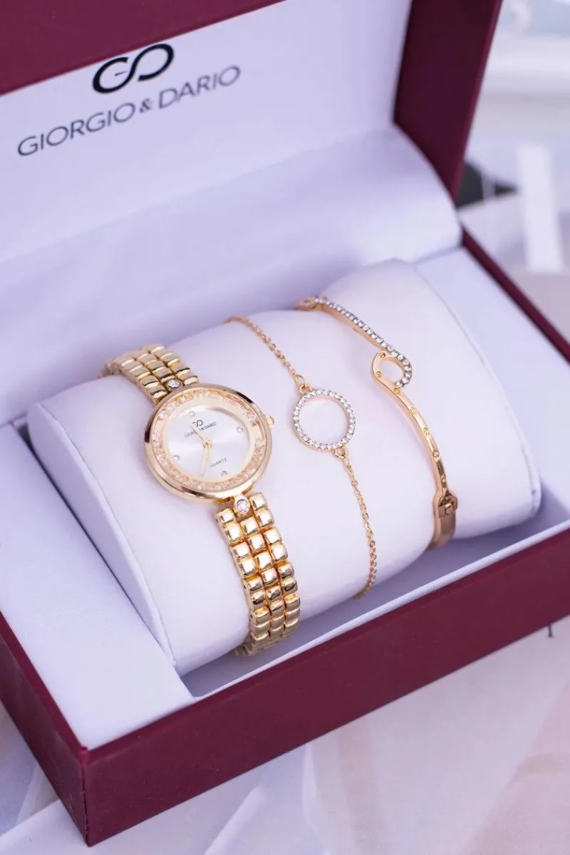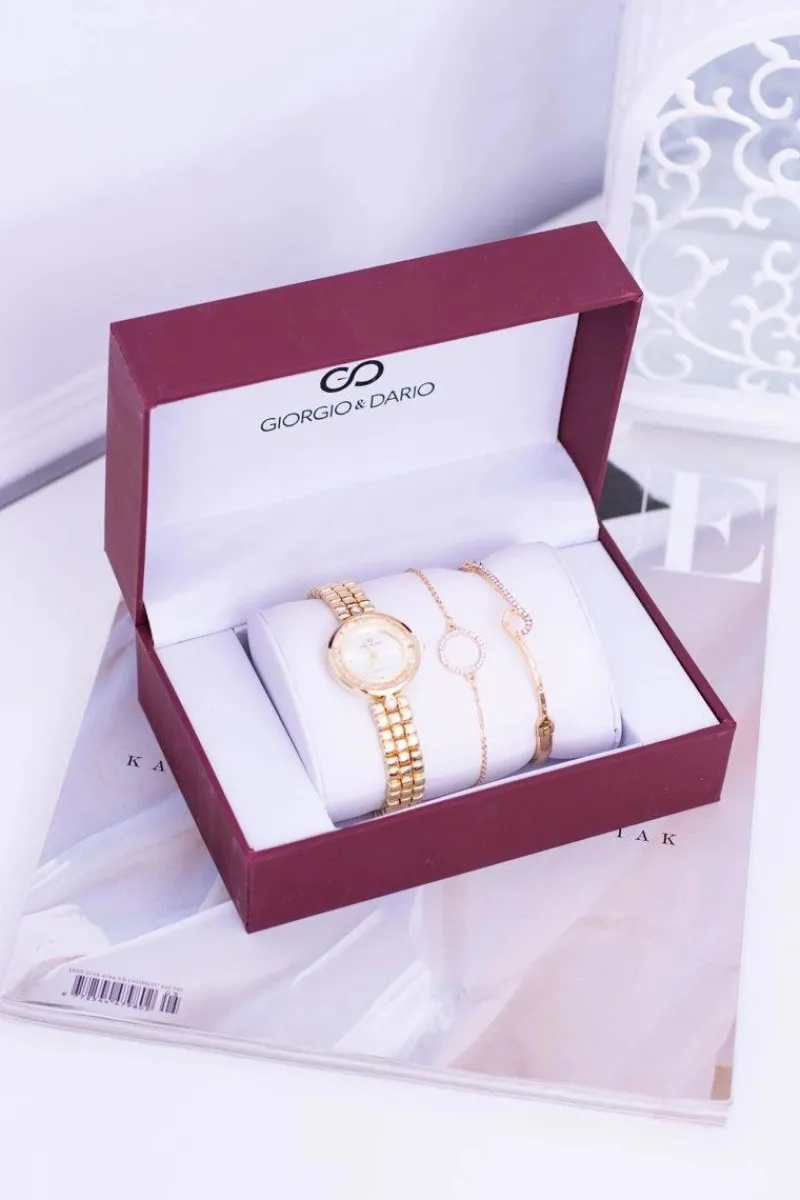 Niezwykła kolekcja zegarków Giorgio Dario, która w idealny sposób podkreśli Twoją wyjątkowość! Delikatna ozdoba w postaci złotego zegarka z cyrkoniami, oraz z dwoma pięknymi bransoletkami. Zestaw zawiera wszystko co jest na zdjęciu, czyli zegarek, dwie bransoletki i opakowanie.
