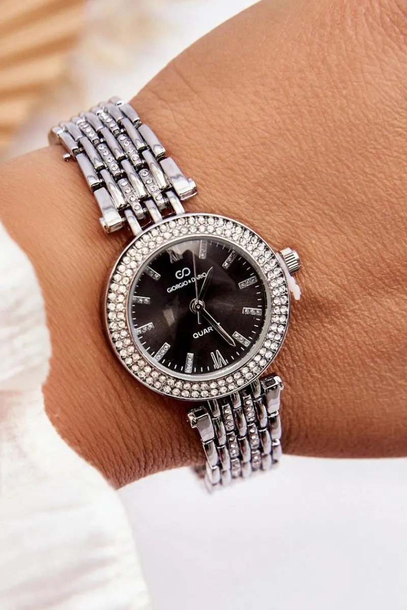 Damski, elegancki zegarek od marki Giorgio&Dario to idealny dodatek do wielu stylizacji Został wykonany ze stali nierdzewnej. Posiada okrągłą kopertę oraz bransoletę zapinaną na zatrzask. Tarcza z cyframi rzymskimi została wzbogacona także o dżety imitujące cyrkonie.