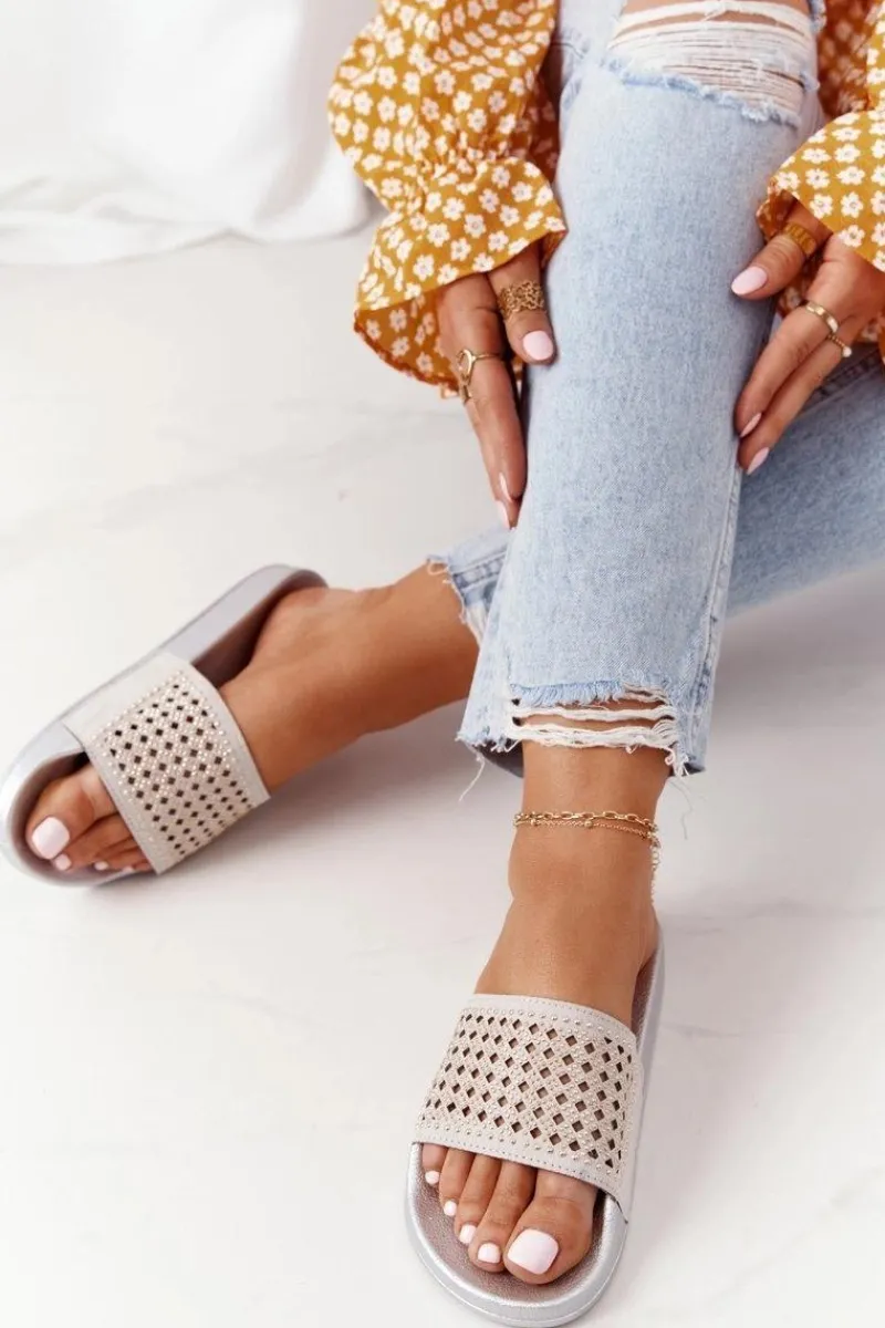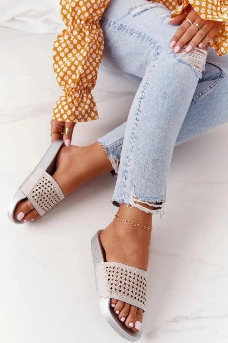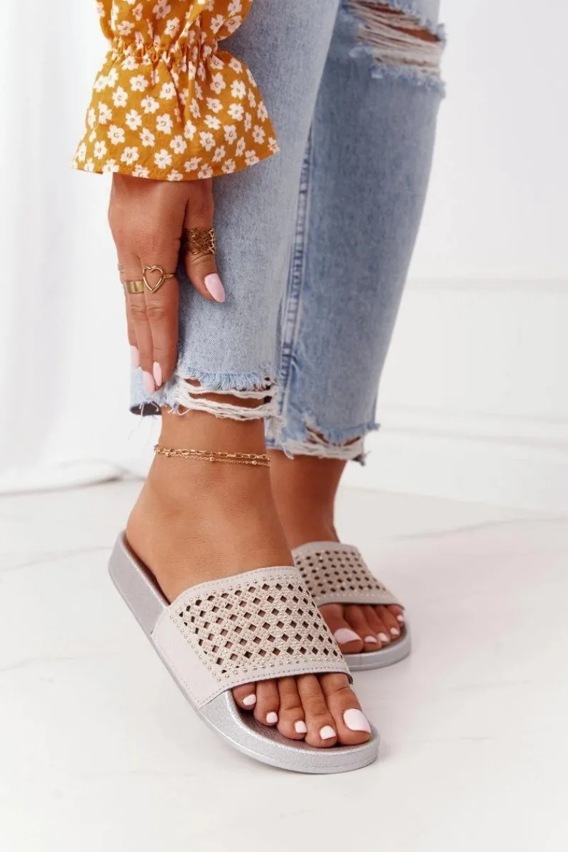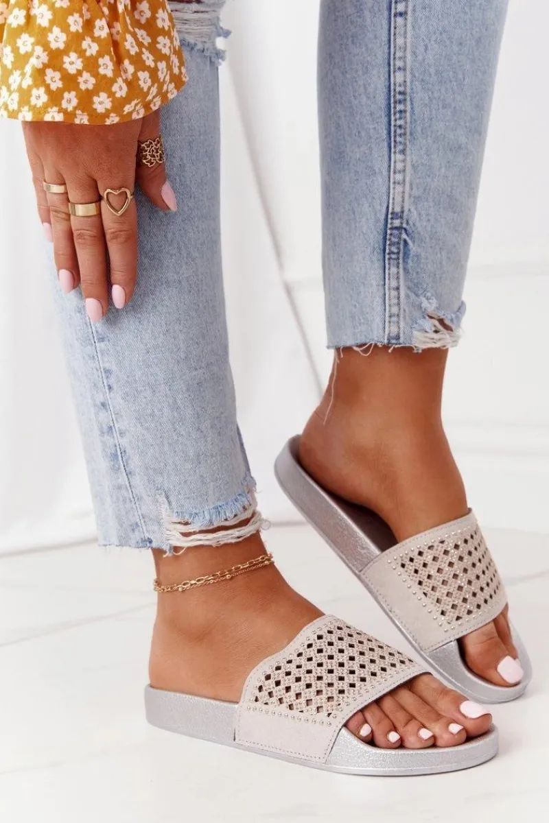 Gumowe klapki damskie ozdobione cekinami. Klapki to świetna propozycja dla kobiet ceniących sobie komfort w letnie dni! Koniecznie sprawdź całą naszą kolekcję klapek damskich! Przy wyborze rozmiaru prosimy sugerować się tabelą rozmiarów.