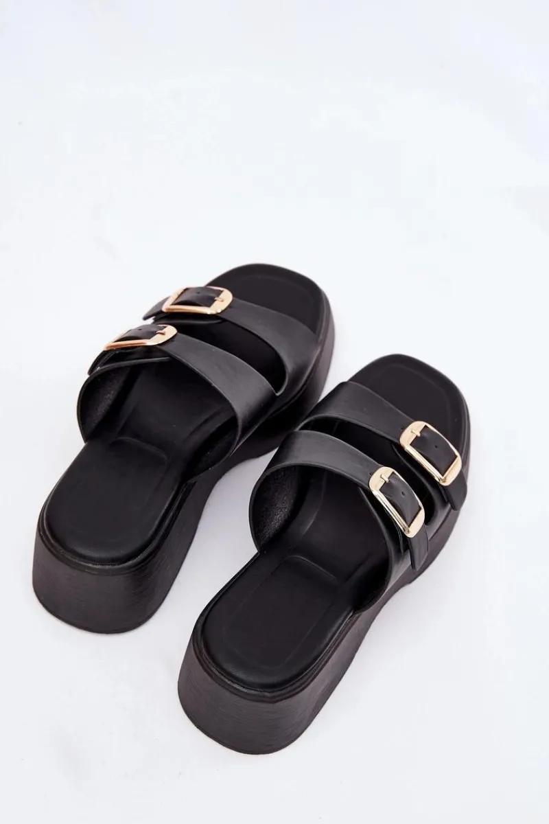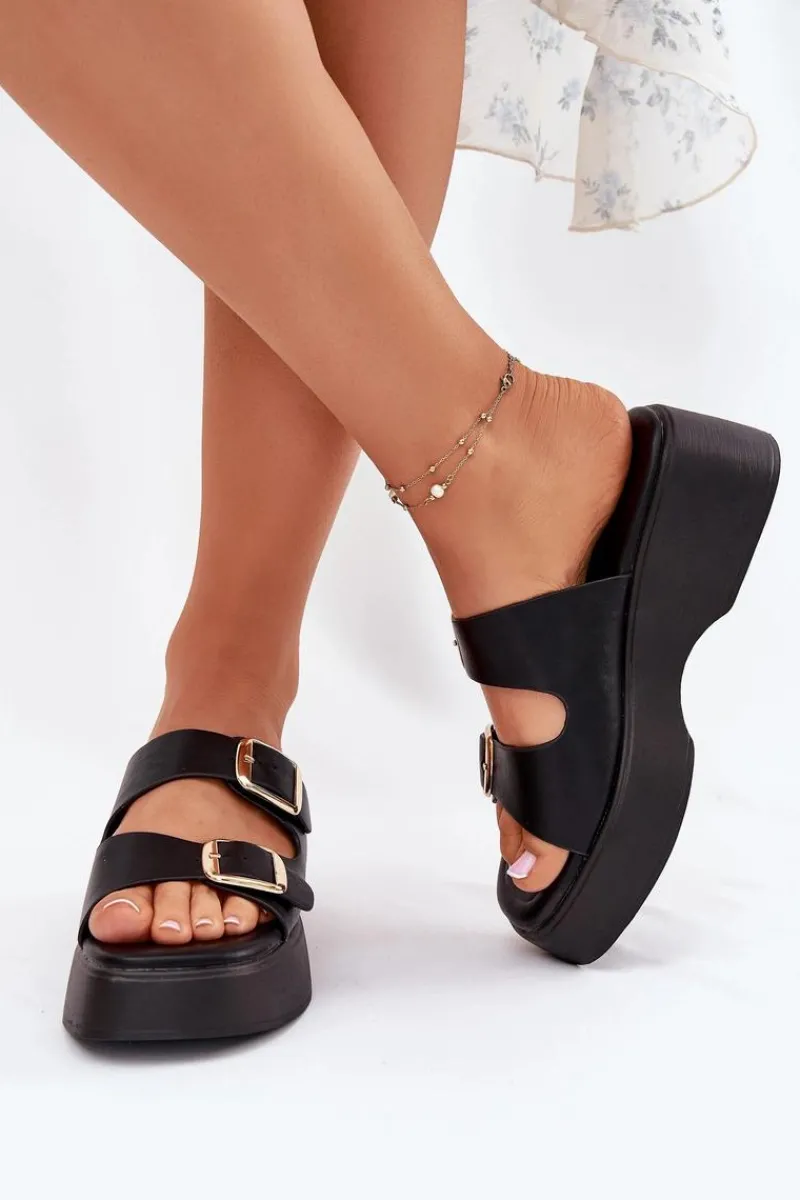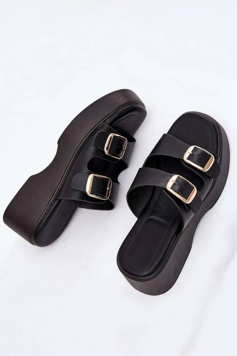 Damskie klapki wykonane ze skóry ekologicznej. Osadzone na koturnie wraz z platformą. Model ten wyróżniają dwie klamry z regulowanymi paskami. Miękka wkładka zapewnia komfort noszenia przez cały dzień, niezależnie od okazji. Klapki świetnie sprawdzą się zarówno w zestawieniu z letnią sukienką, jak i z materiałowymi spodniami, dodając stylu każdej stylizacji. Idealne na co dzień oraz na wyjścia ze znajomymi! Przy wyborze rozmiaru prosimy kierować się tabelą rozmiarów.