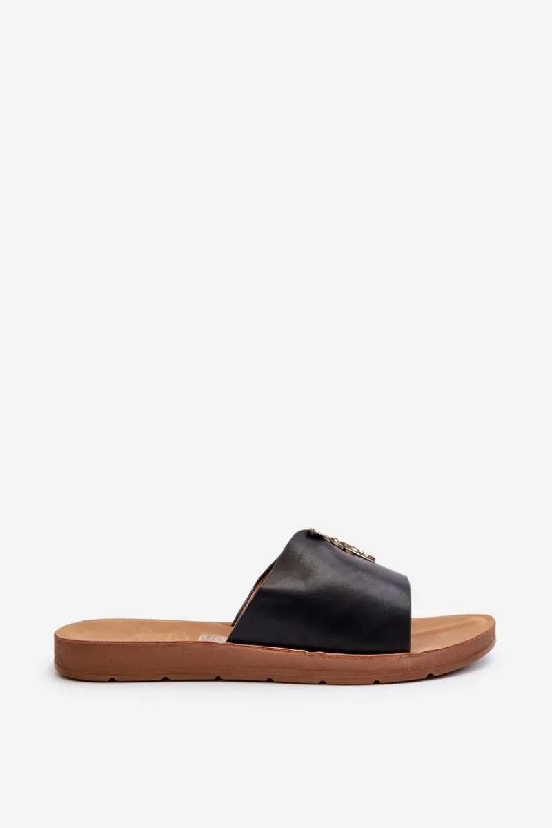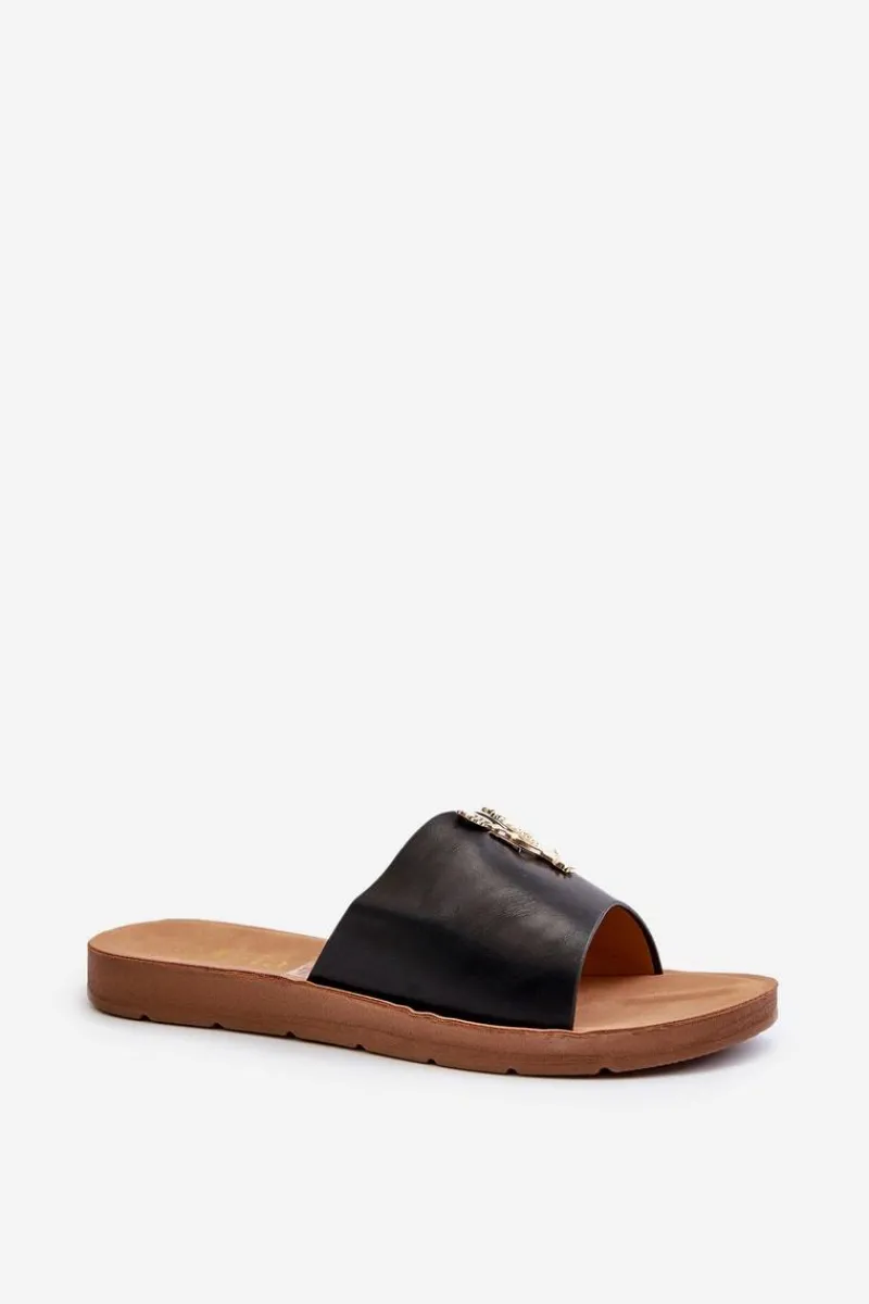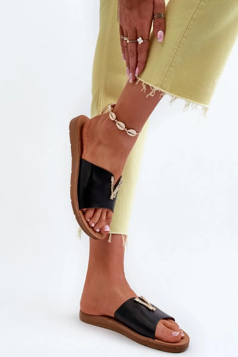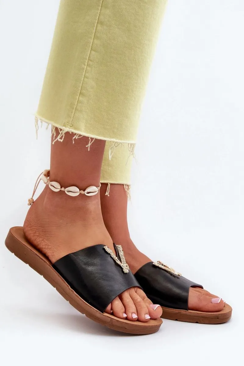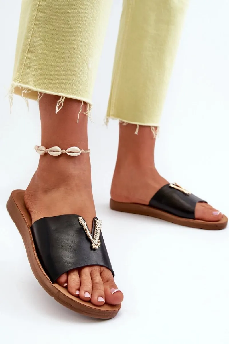Klapki damskie wykonane ze skóry ekologicznej. Osadzone na płaskiej podeszwie. Złota ozdoba dodaje im subtelnej elegancji, dzięki czemu świetnie sprawdzą się zarówno na codzienne spacery, jak i na letnie wyjścia. To idealne obuwie na ciepłe letnie dni! Przy wyborze rozmiaru prosimy sugerować się tabelą rozmiarów.