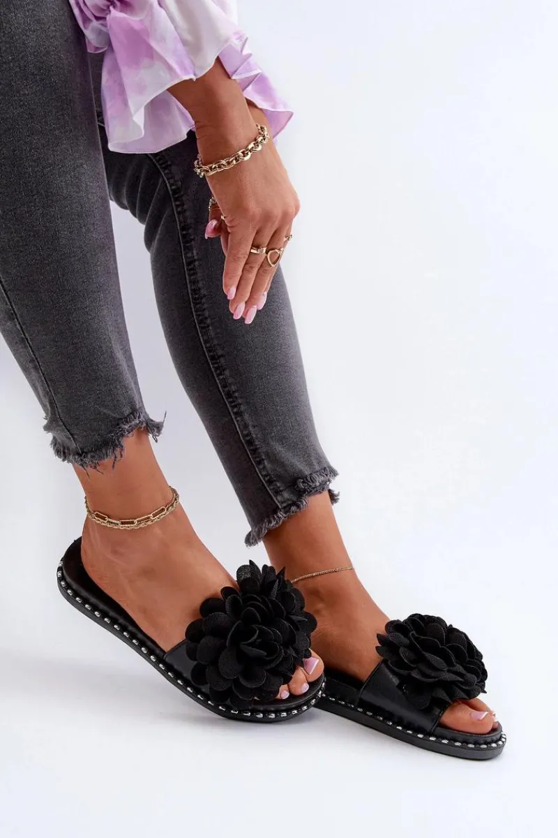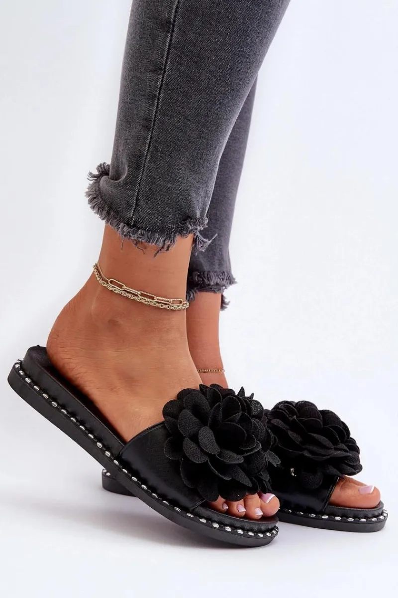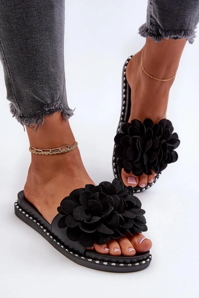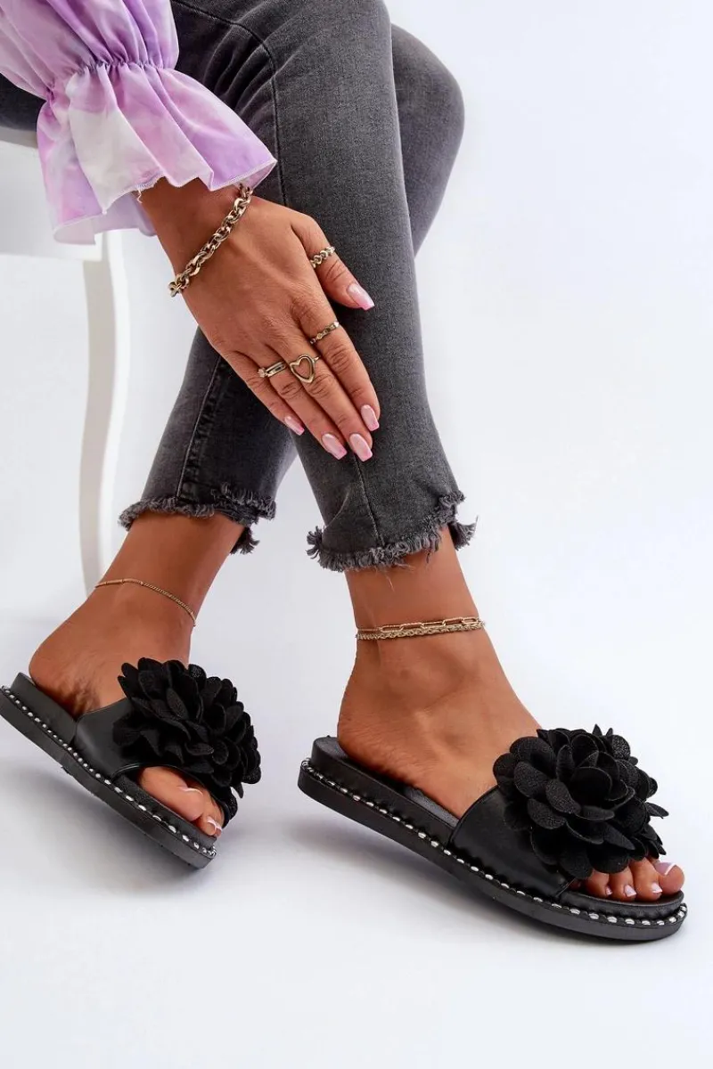Outlet Klapki Damskie Ozdobione Kwiatami Czarne Cellanen Damskie Klapki Damskie Klasyczne