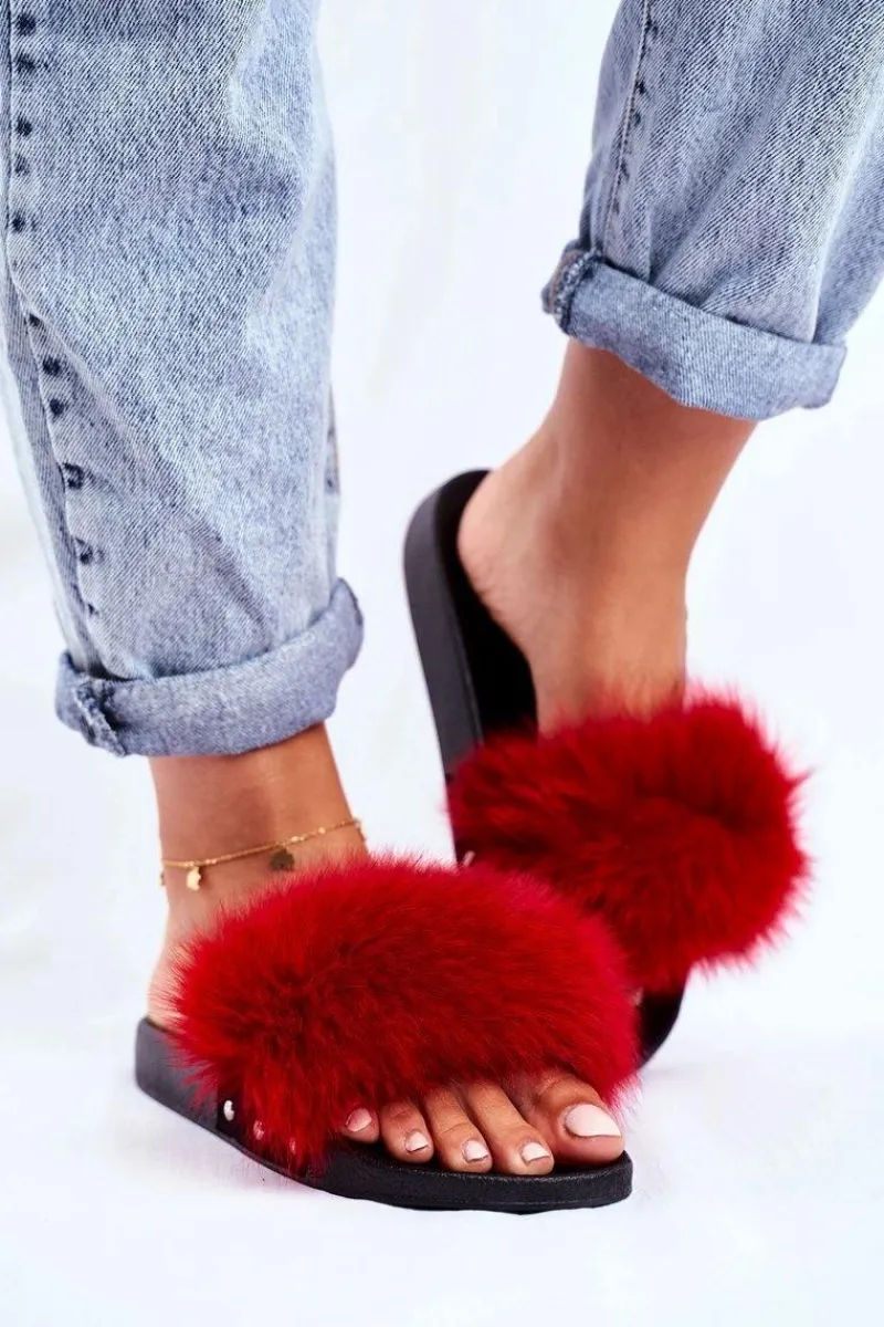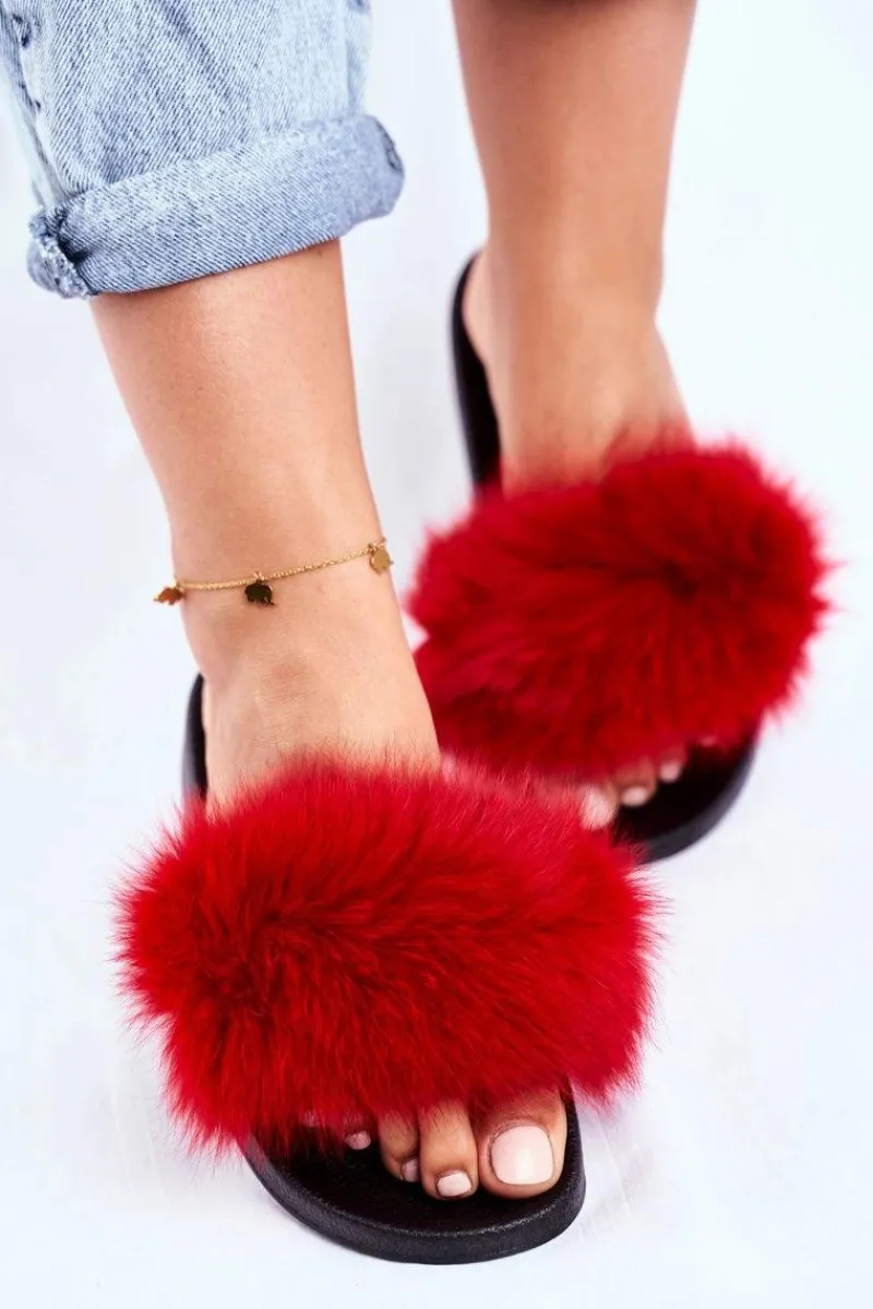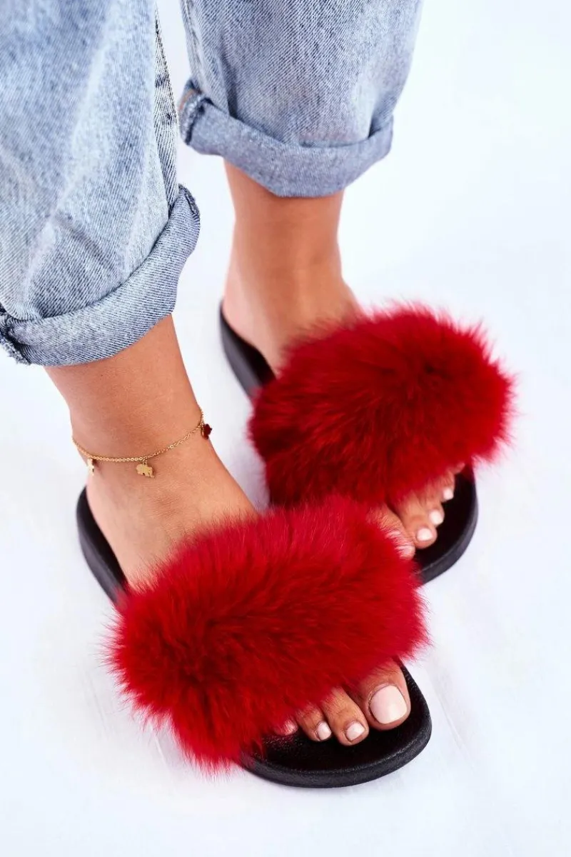 Outlet Klapki Damskie z Naturalnym Futerkiem Czerwone Bushido Damskie Klapki Z Futerkiem|Klapki Damskie Klasyczne