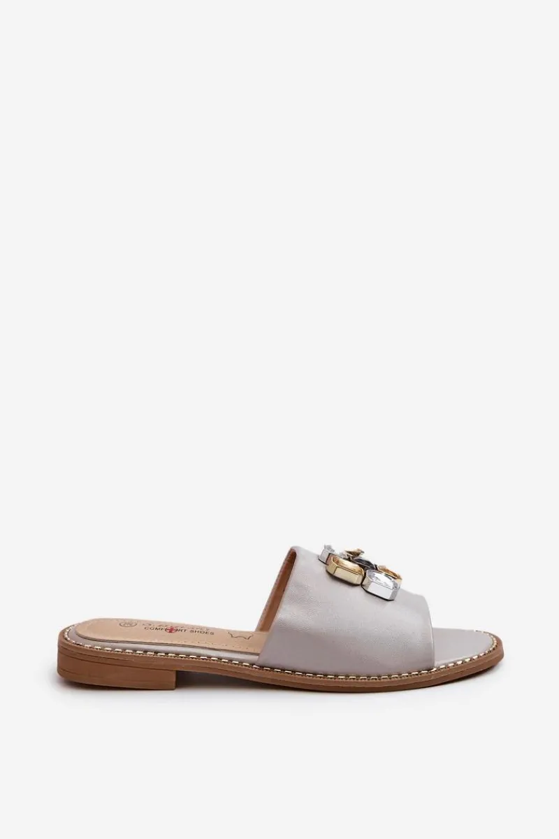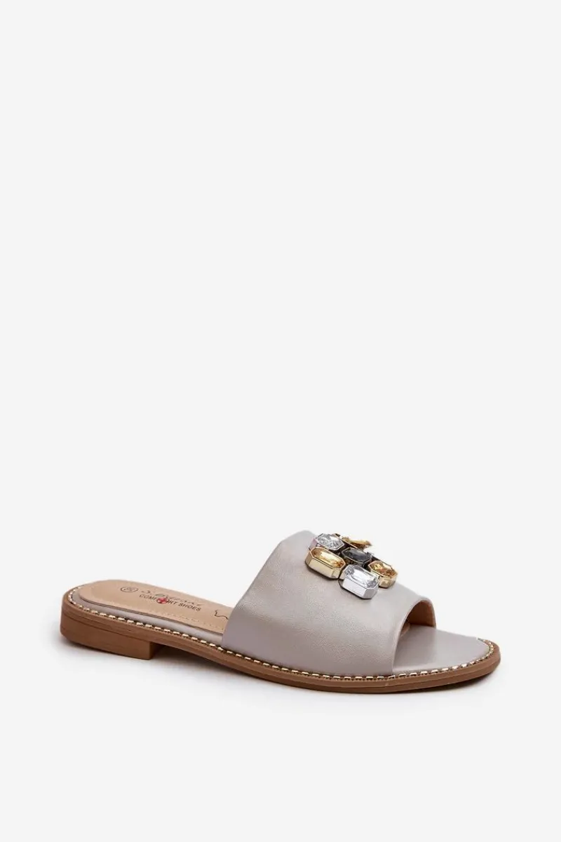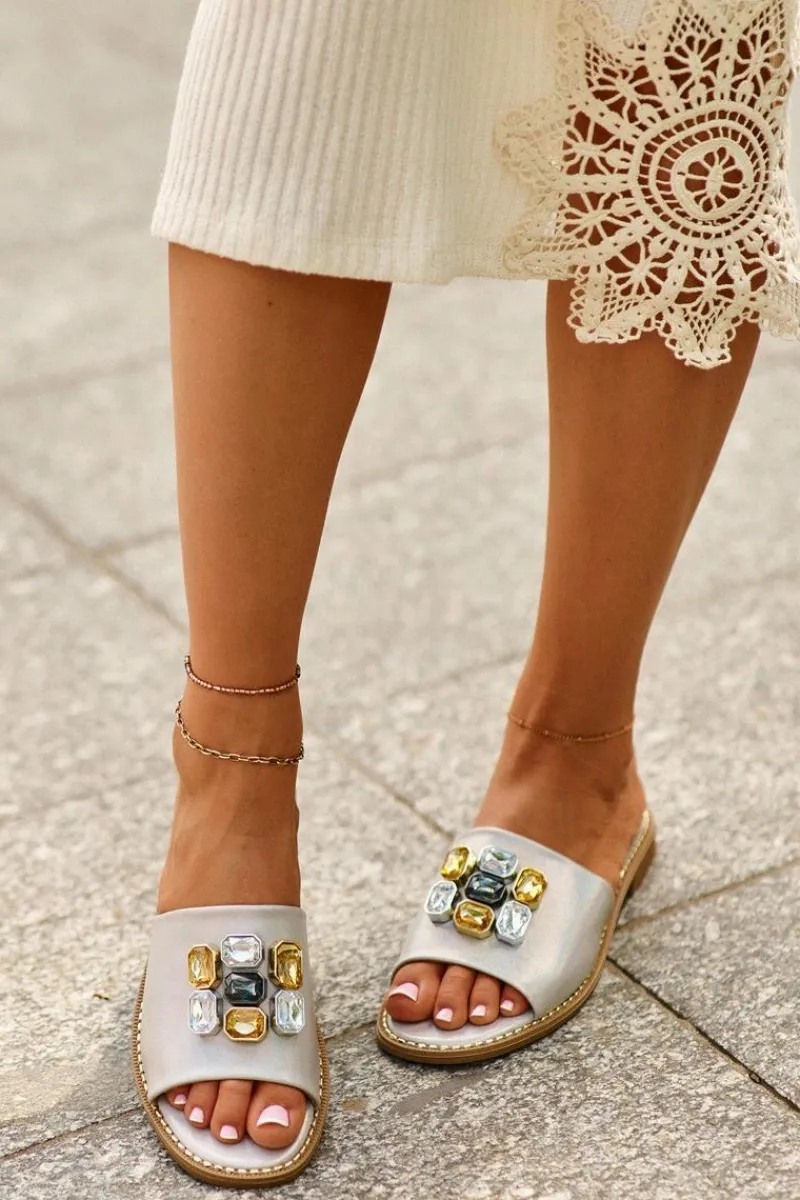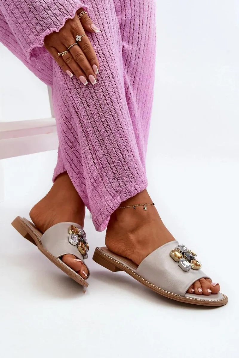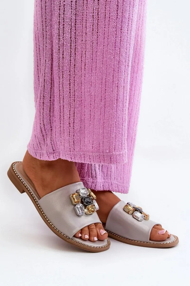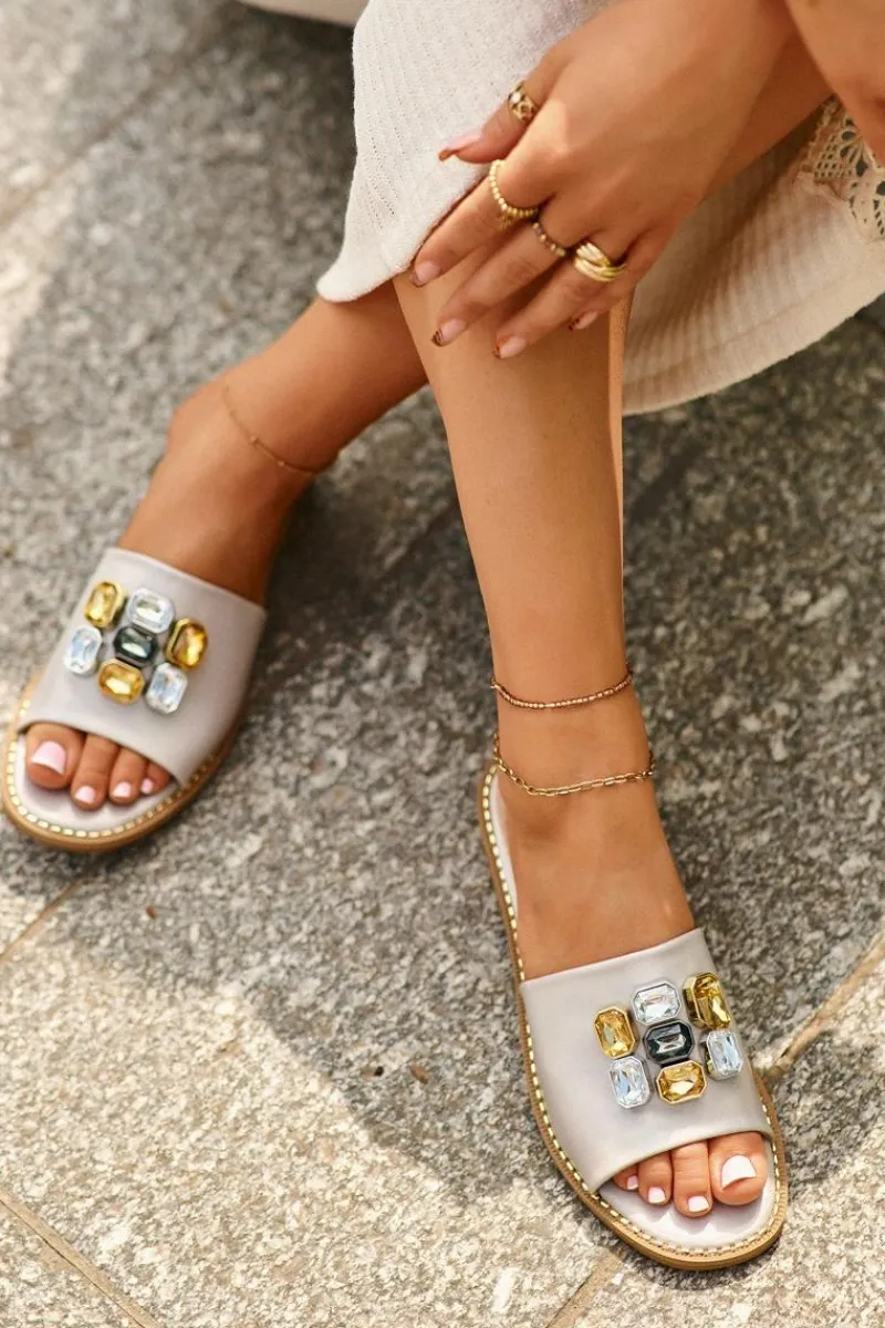Damskie klapki na płaskim obcasie z ozdobami. Wykonane z wysokiej jakości materiałów. Miękka, skórzana wkładka zapewni komfort noszenia przez cały dzień. Elegancki design sprawia, że są idealnym wyborem na różne okazje. Przy wyborze rozmiaru prosimy sugerować się tabelą rozmiarów.