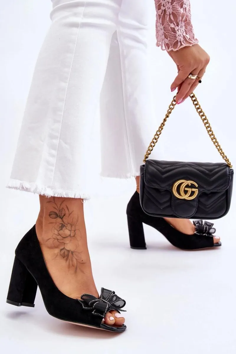 Czółenka zostały wykonane z eko zamszu. Klasyczny model będzie prezentować się wspaniale w połączeniu z wieloma stylizacjami. Miękka, wykonana z naturalnej skóry wkładka daje poczucie komfortu na każdym kroku. Obcas w postaci nieregularnego słupka. Przód czółenek został ozdobiony modną kokardą. Przy wyborze rozmiaru prosimy sugerować się tabelą rozmiarów.
