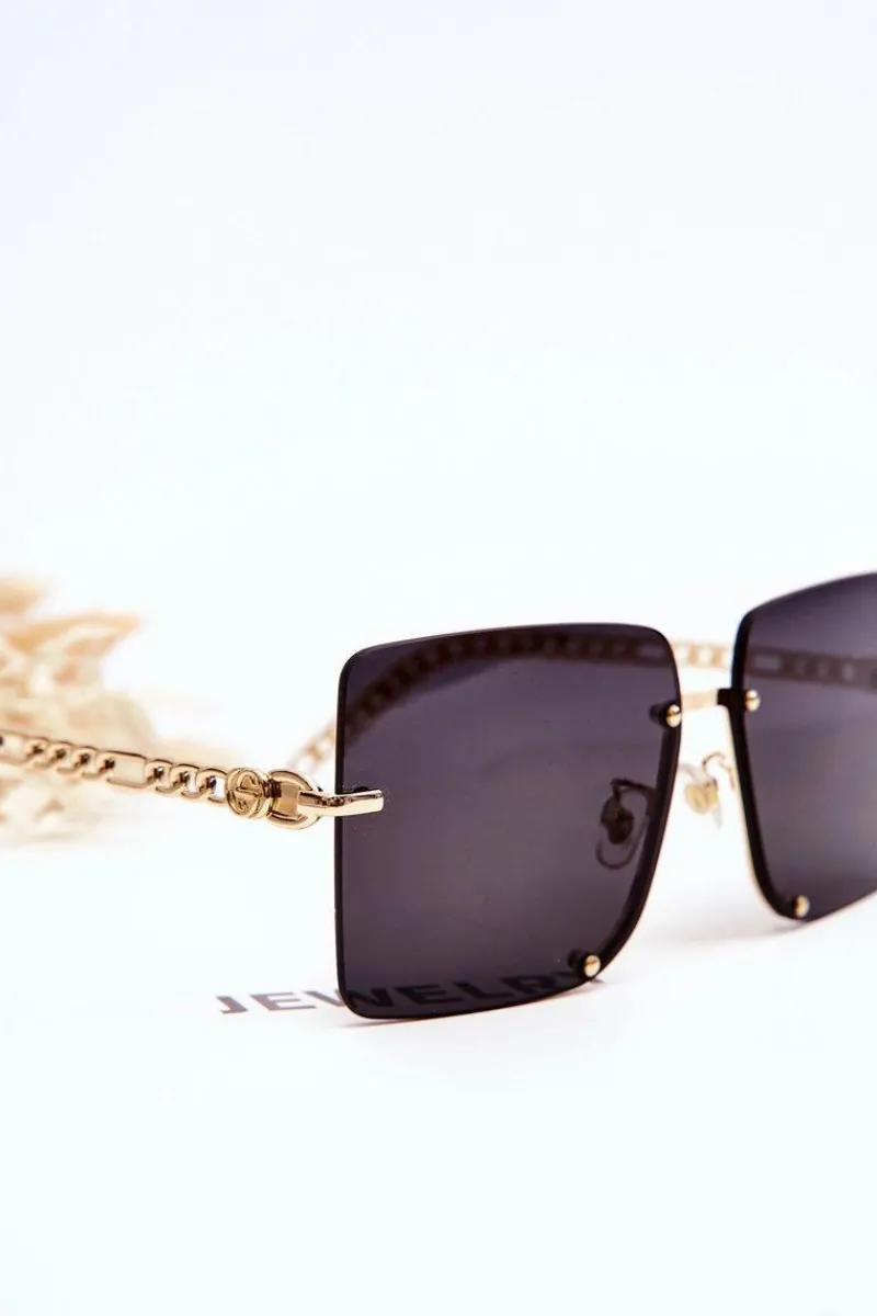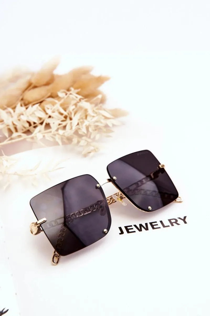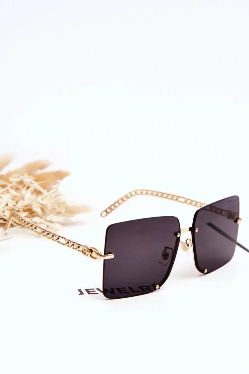 Okulary przeciwsłoneczne świetnie sprawdzą się przy słonecznej pogodzie, dzięki ochronie oczu przed promieniowaniem. Okulary zostały wykonane z połączenia tworzywa sztucznego oraz metalu. Kwadratowe soczewki nie posiadają ramek. Modne zauszniki imitują łańcuszek. Informacja od producenta: UV 400, kategoria 3.