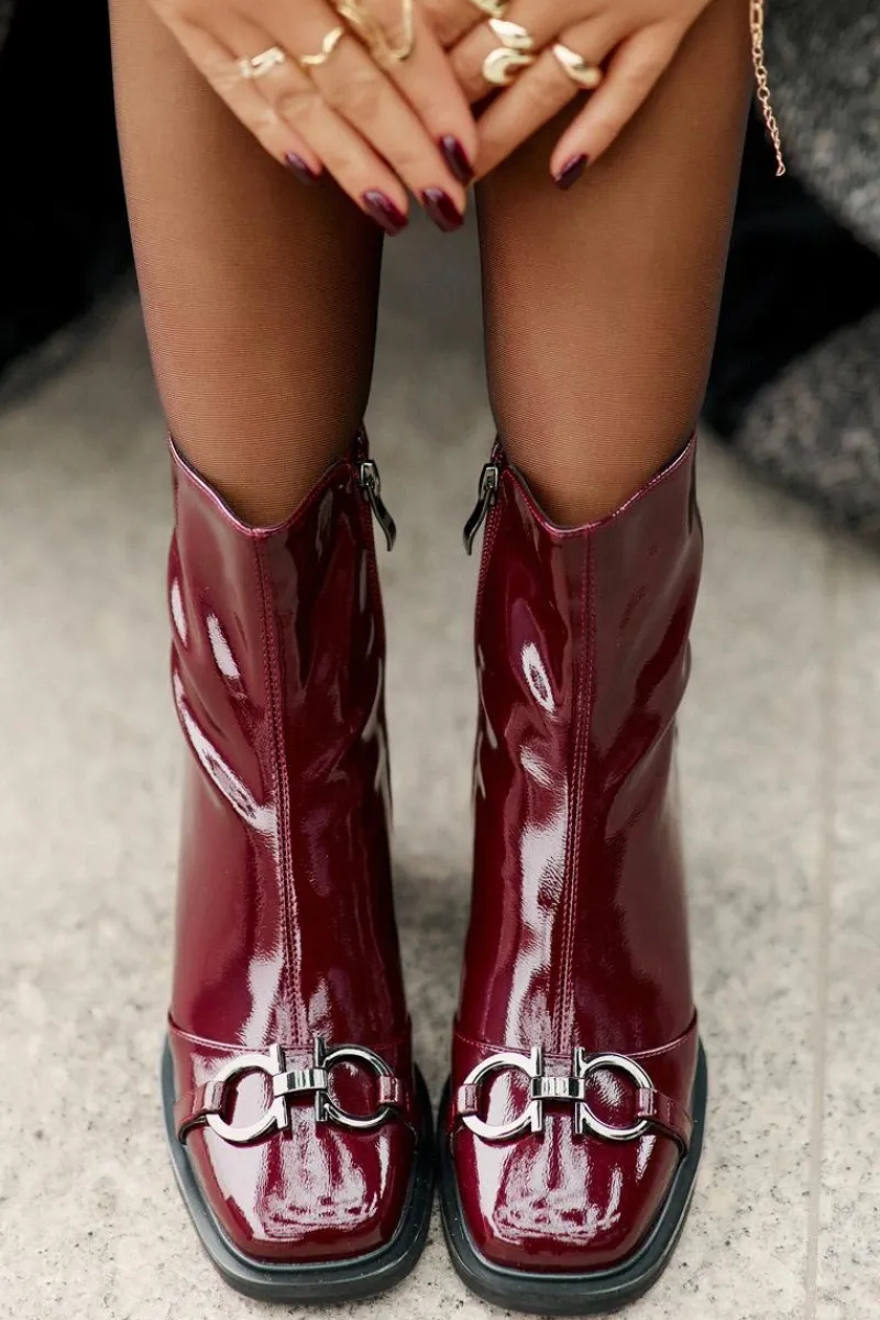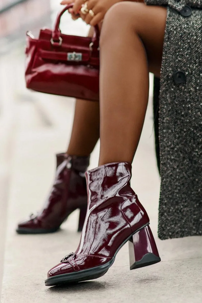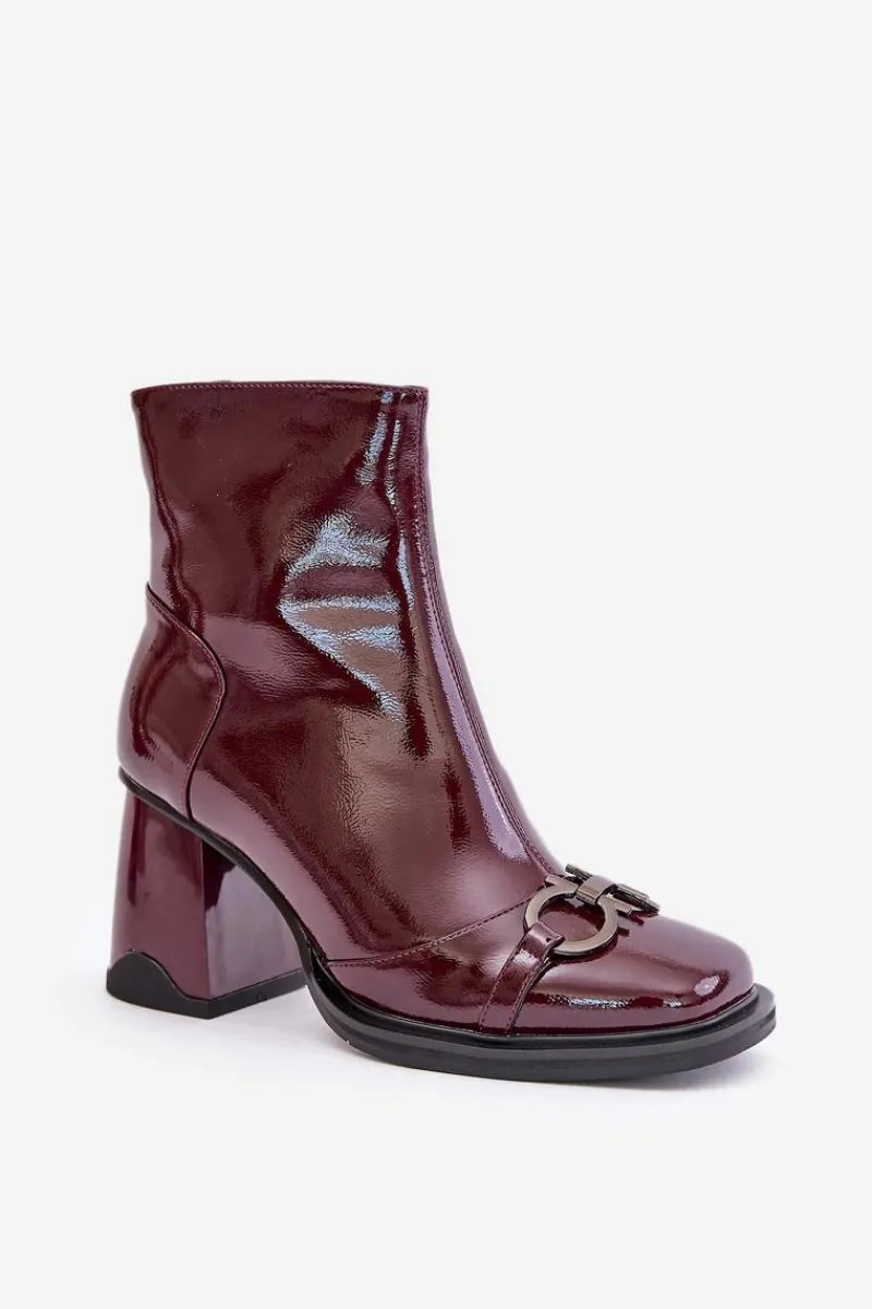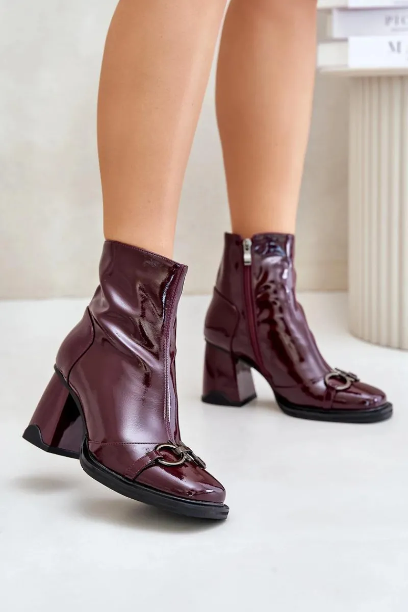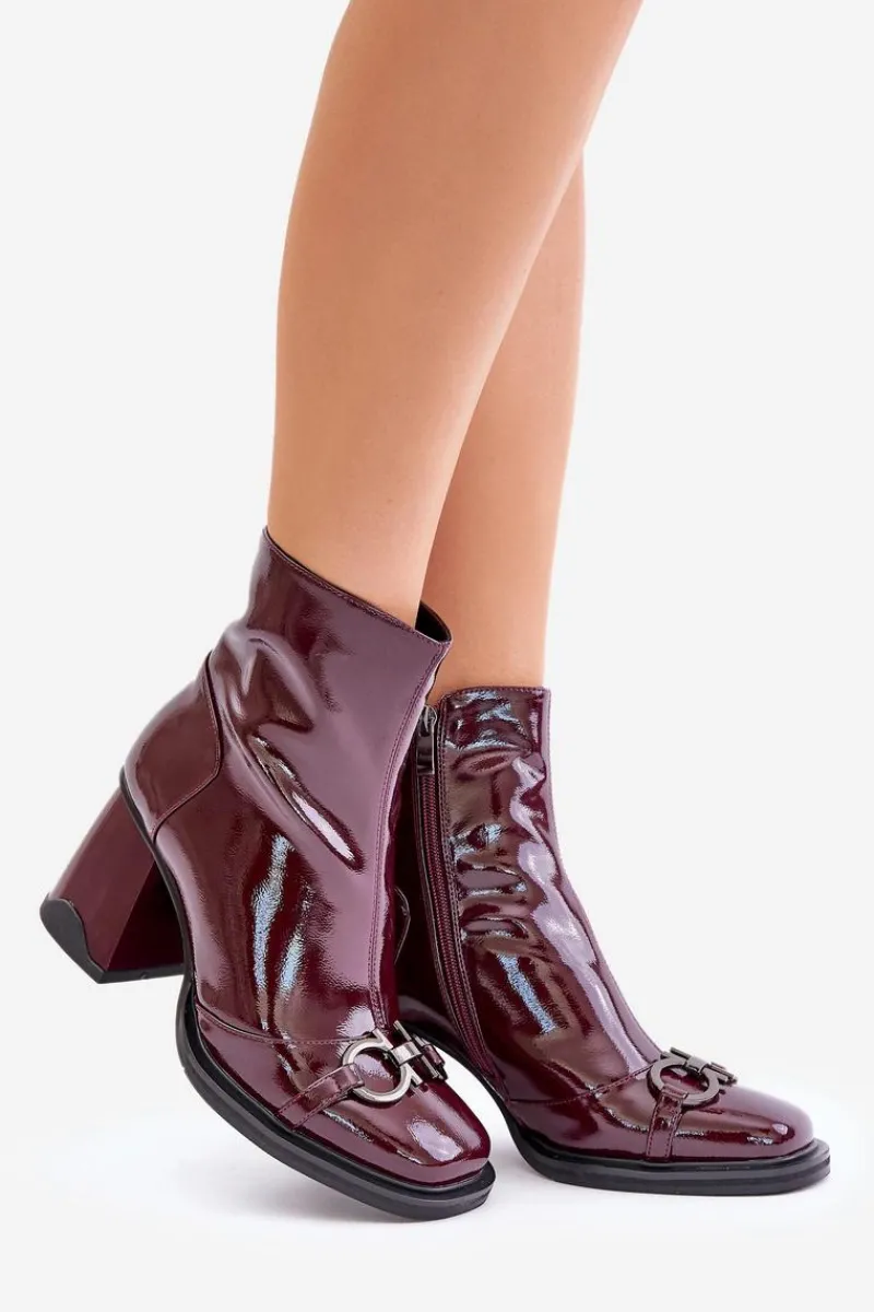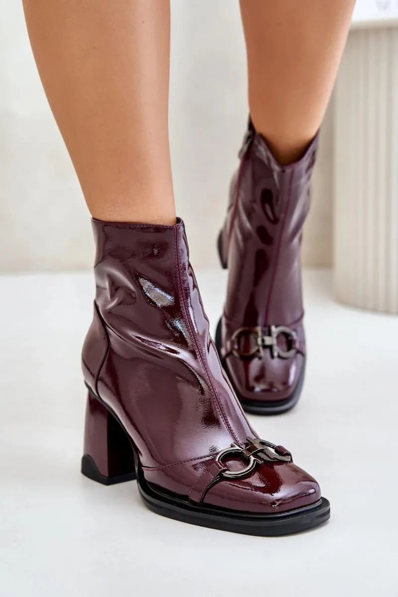 Damskie botki wykonane z lakierowanej eko skóry to stylowy wybór na chłodniejsze dni. Osadzone na stabilnym obcasie typu słupek, dodają sylwetce elegancji i nowoczesnego wyglądu. Model posiada kwadratowe noski oraz ozdoba z przodu podkreślają modny charakter. Ocieplane kocem obuwniczym, zapewniają komfort i ciepło, a zapięcie na zamek ułatwia szybkie zakładanie. Idealne do eleganckich i wyjściowych stylizacji. Przy wyborze rozmiaru prosimy sugerować się tabelą rozmiarów.