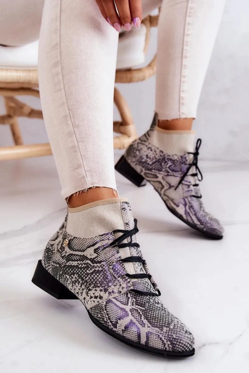 Niezwykle stylowe trzewiki od firmy Maciejka już dostępne! Na pewno przykuwają uwagę swoim niecodziennym designem. Połączenia kilku rodzajów skór o różnej fakturze, nadaje im iście eleganckiego i modnego stylu. Delikatny płaski obcas oraz sznurowana cholewka. Z takimi butami, Ty i Twoje stylizacje z pewnością zostaniecie zauważone. Przy wyborze rozmiaru prosimy sugerować się tabelą rozmiarów.