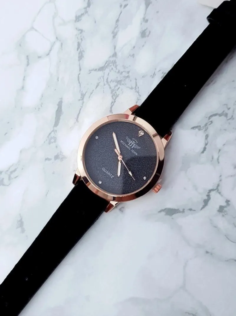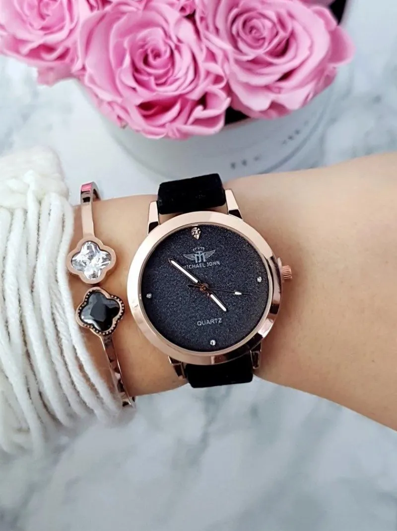 Outlet Michael John Damski Zegarek Evento Czarny Zamszowy Pasek Brokat