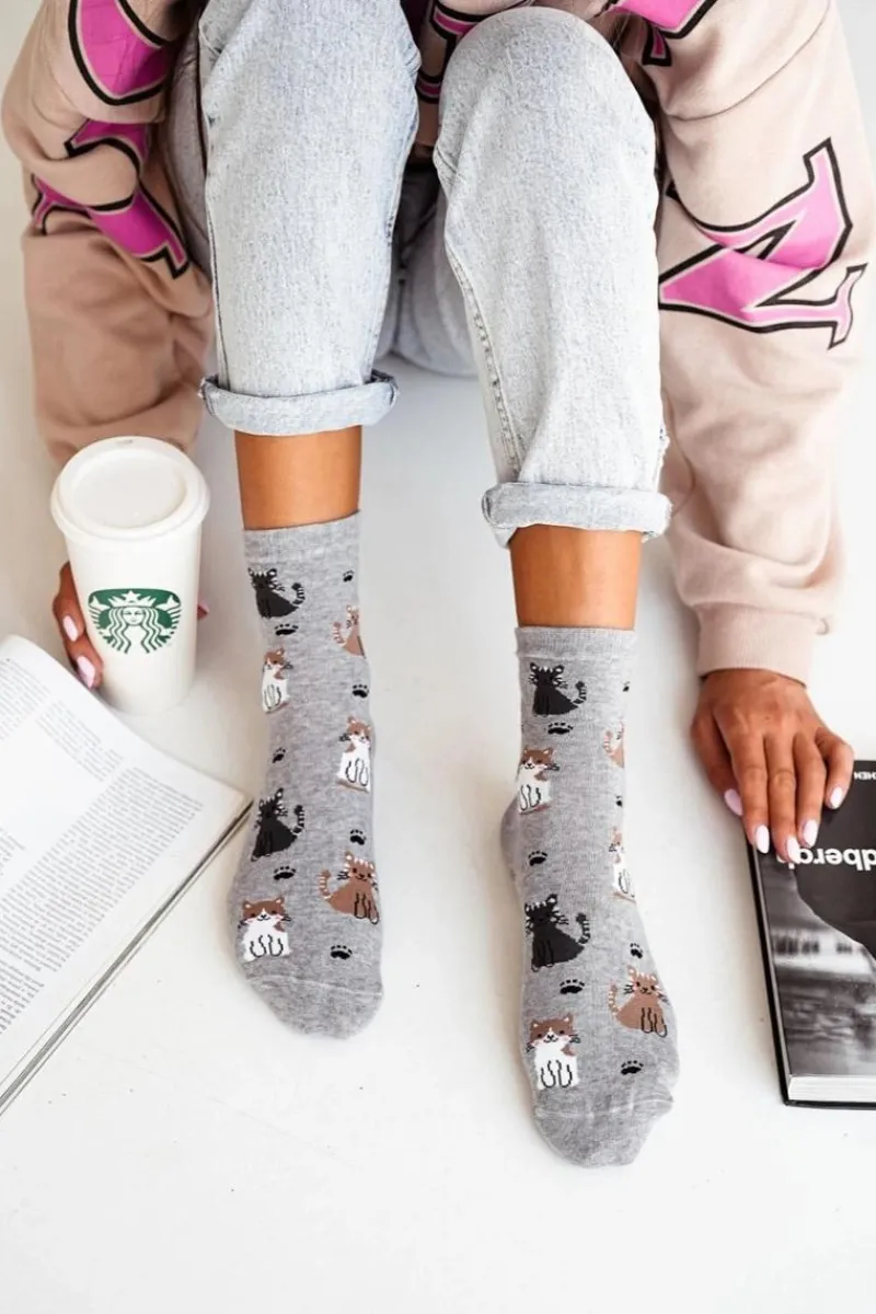 Outlet Milena Skarpetki Damskie Bawełniane W Koty Szare