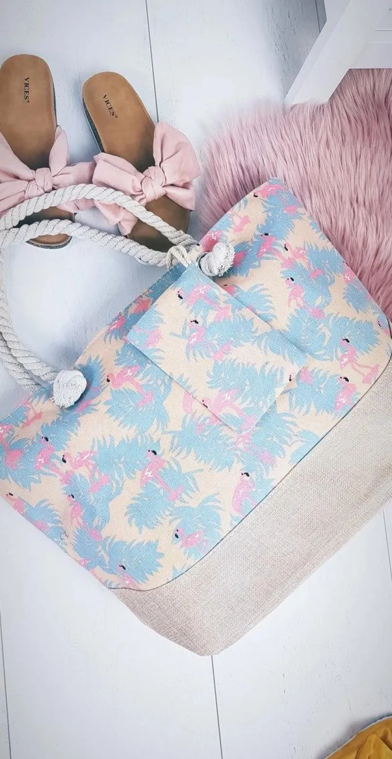 Outlet Plażowa Duża Beżowa Torebka Torba Damska Flamingi Torebki Plażowe