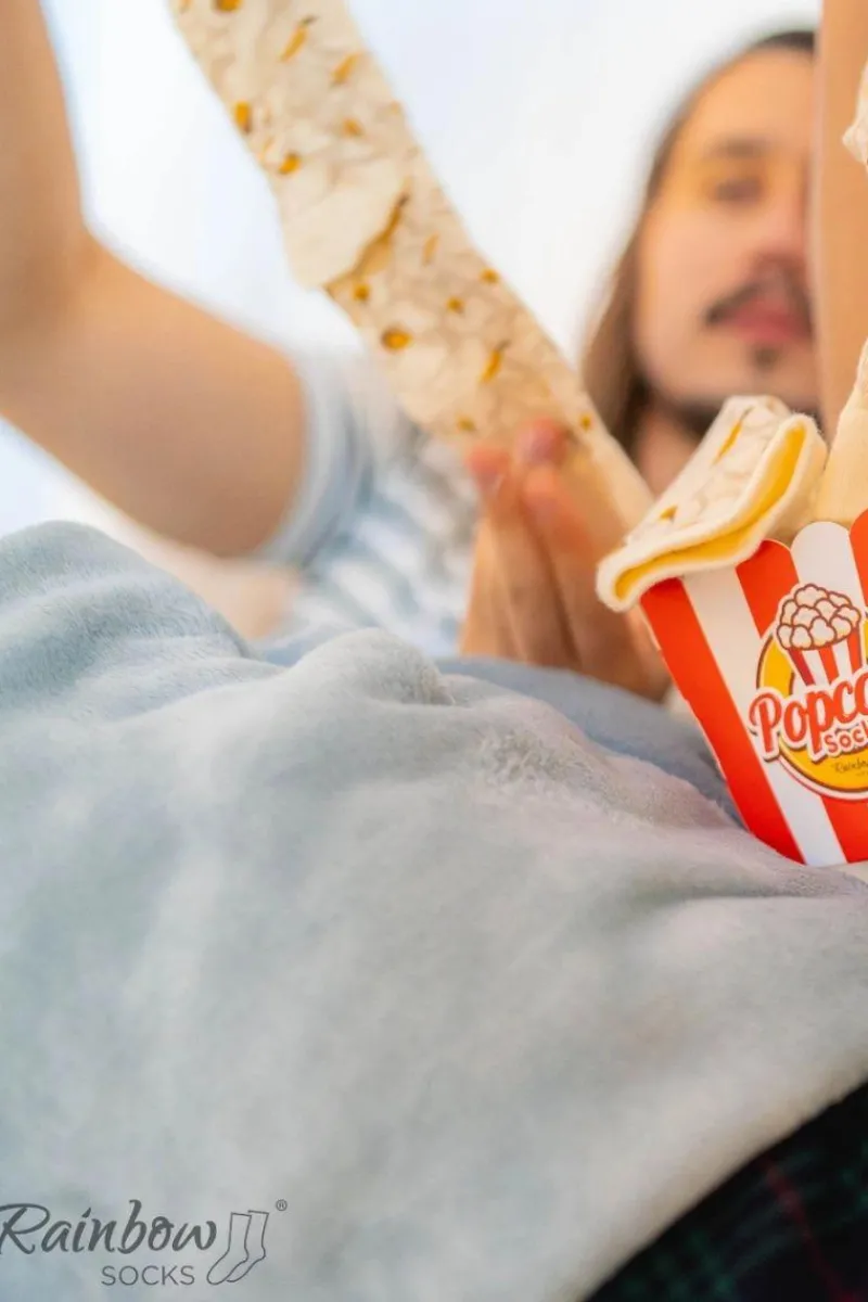 Bawełniane skarpetki dla kobiet i mężczyzn z motywem pysznego popcornu. Przenośna i wyjątkowo miękka maszyna do popcornu, który nigdy się nie kończy – w sam raz dla tych, którzy mogliby chrupać w nieskończoność. Dwie pary skarpetek zapakowane są w klasyczny kinowy kubełek. W skład pary wchodzi skarpetka ze wzorem popcornu i skarpetka z popcornem i kolbą kukurydzy.