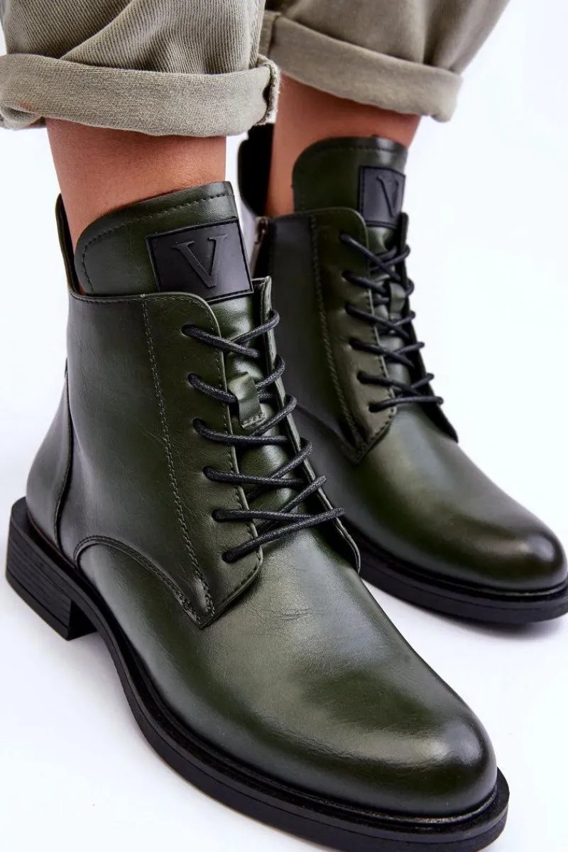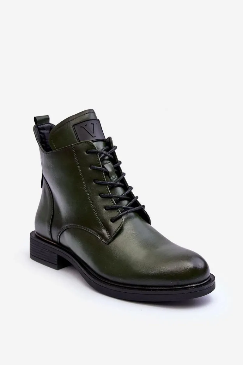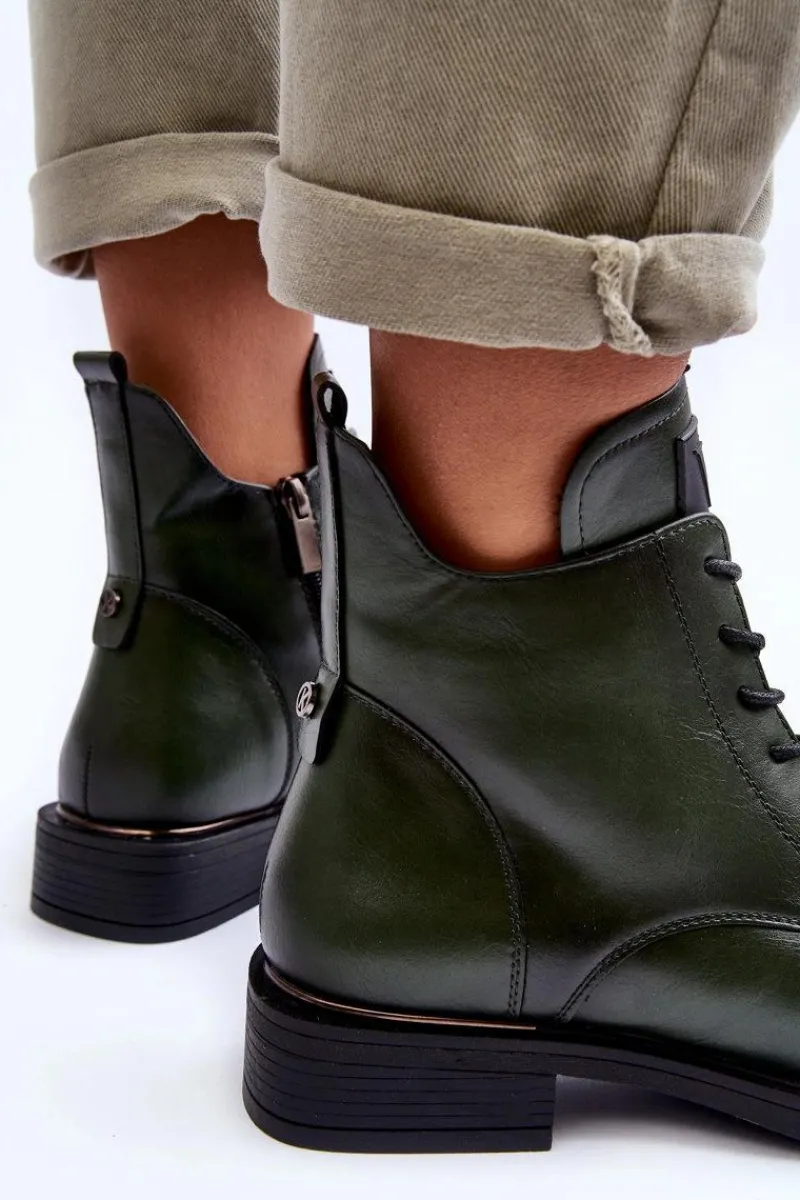 Wygodne botki damskie zostały wykonane eko skóry. Posiadają zapinanie z boku na suwak oraz dodatkowe sznurowanie. Osadzone na płaskim obcasie. Zapiętek w tym obuwiu jest usztywniany. Model ten jest idealny na jesienne dni! Koniecznie powinnaś je mieć w swojej szafie! Przy wyborze rozmiaru prosimy sugerować się tabelą rozmiarów.