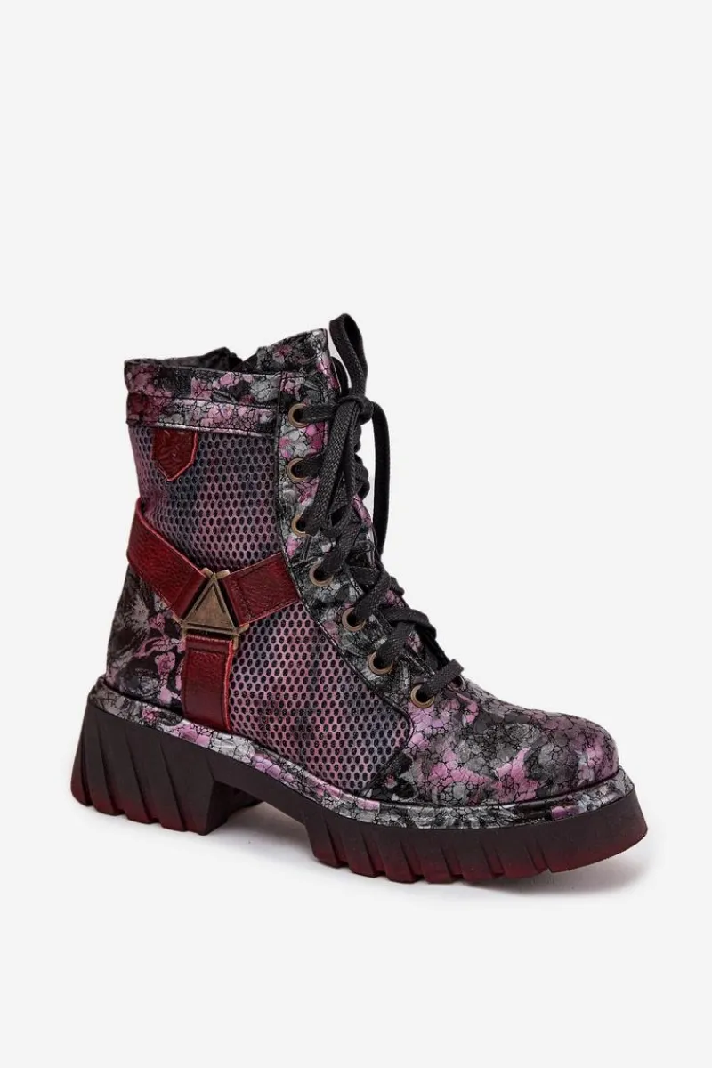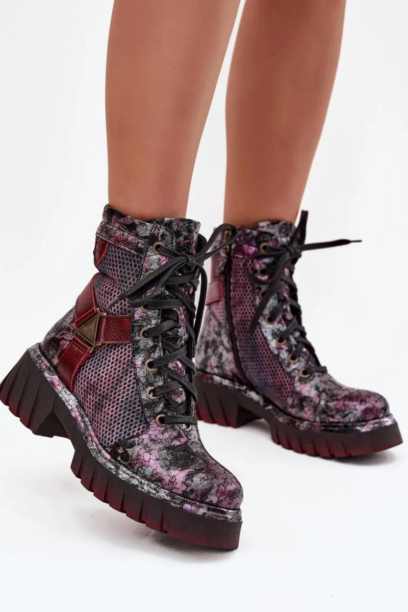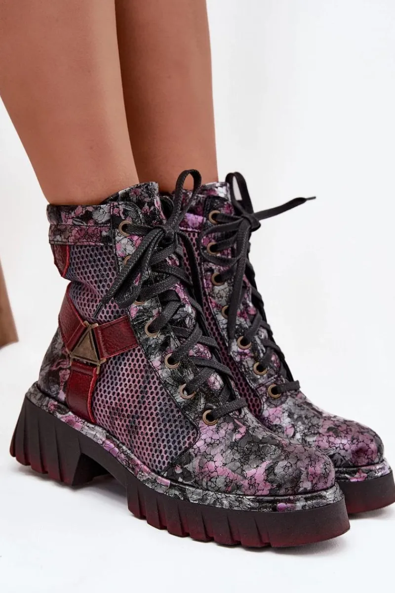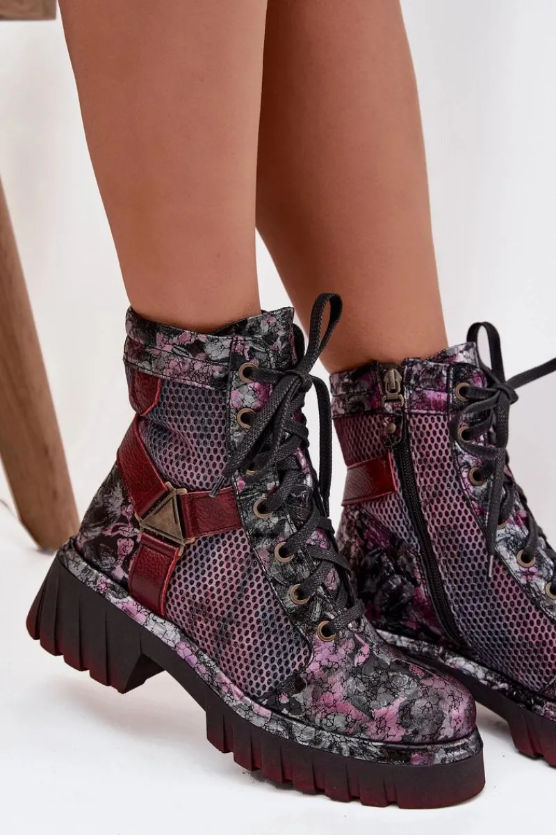 Botki workery damskie marki Maciejka to propozycja dla kobiet, które lubią oryginalny styl i wygodę. Wykonane z naturalnej skóry, wyróżniają się trwałością oraz wyjątkowym wyglądem, który przyciąga uwagę. Model osadzony został na platformie z płaskim obcasem, co zapewnia stabilność i komfort noszenia. Buty posiadają zarówno praktyczne sznurowanie, jak i zamek, dzięki czemu łatwo je dopasować do stopy i szybko zakładać. Na cholewce umieszczono paski połączone ozdobnym elementem, które dodają całości charakteru i nowoczesnego wyglądu. To botki, które świetnie sprawdzą się w codziennych stylizacjach, szczególnie dla kobiet ceniących odważne i stylowe akcenty.