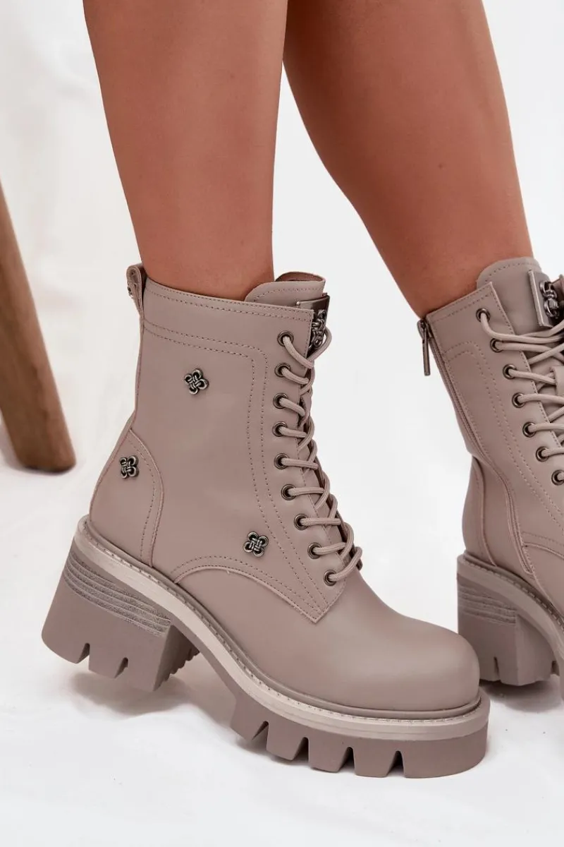 Botki damskie od marki Artiker. Wykonane z naturalnej skóry, prezentują się stylowo i są wyjątkowo trwałe. Model osadzony został na masywnym obcasie typu klocek oraz platformie, co zapewnia stabilność i wygodę podczas noszenia, jednocześnie dodając całości modnego charakteru. Buty są sznurowane i zapinane na zamek, dzięki czemu łatwo je dopasować do stopy i wygodnie zakładać. Na cholewce umieszczono ozdobne, drobne przypinki, które podkreślają unikalny styl modelu. Wnętrze zostało ocieplone, co sprawia, że botki świetnie sprawdzą się w chłodniejsze dni. To idealna propozycja dla kobiet, które cenią połączenie elegancji, komfortu i oryginalnego, miejskiego stylu. Przy wyborze rozmiaru prosimy sugerować się tabelą rozmiarów.