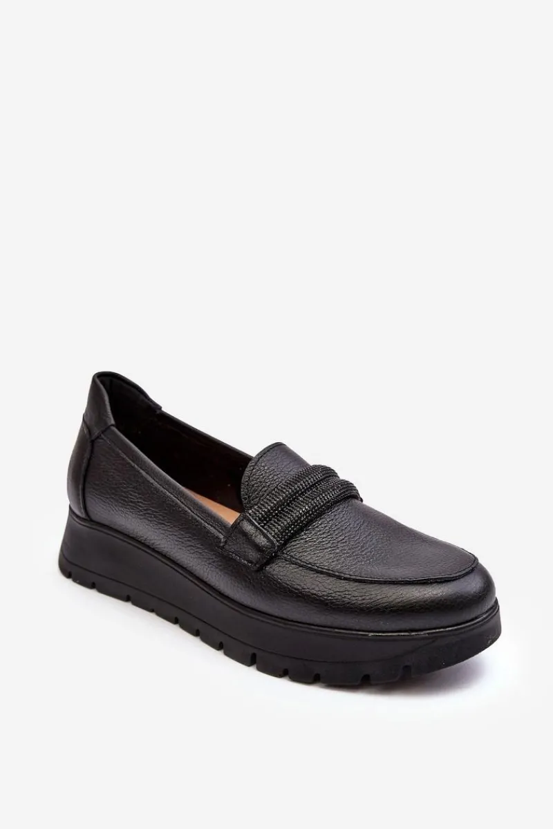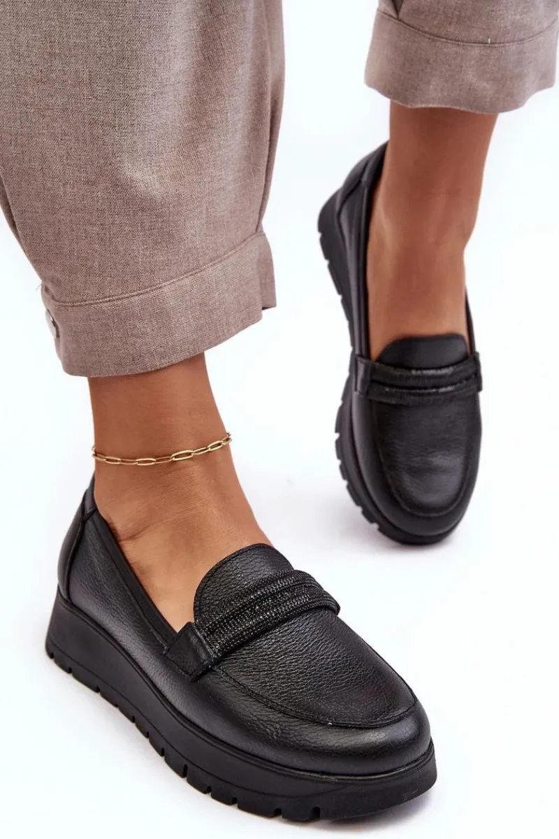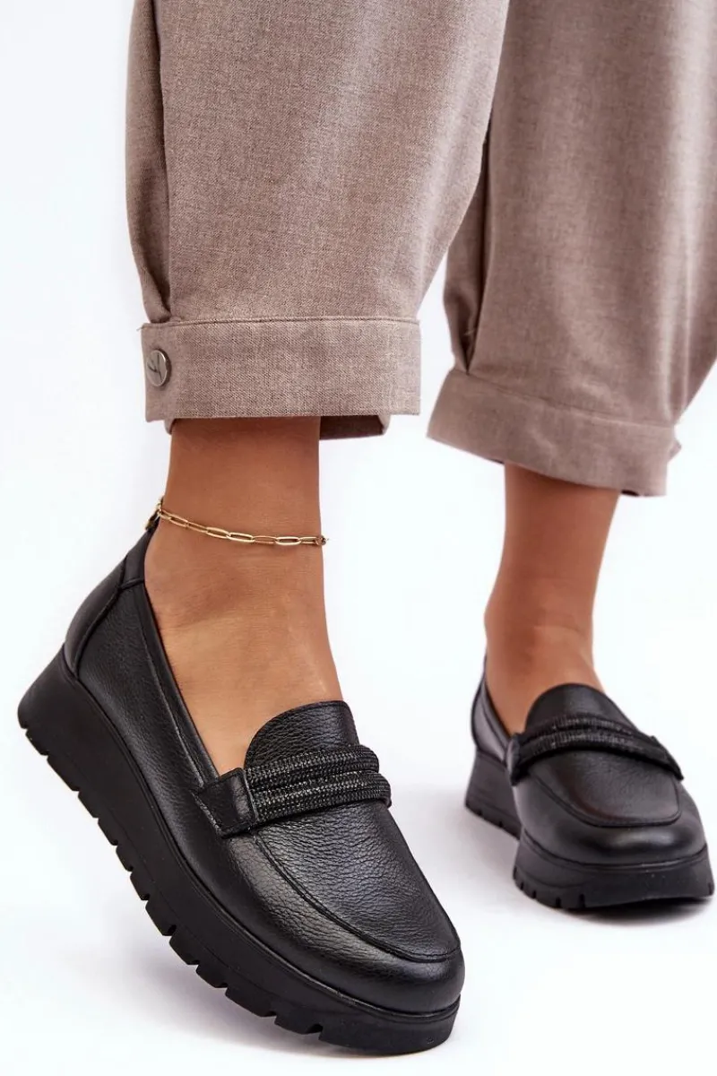 Damskie, wsuwane półbuty zostały wykonane z naturalnej skóry. Osadzone na masywnej platformie. Posiadają zaokrąglony nosek. Wkładka wykonana również ze skóry naturalnej zapewni komfort podczas użytkowania. Dodatkowo zapiętek w tym obuwiu jest usztywniony. Modne, wygodne, a także wykonane z dbałością o detale. Przy wyborze rozmiaru prosimy sugerować się tabelą rozmiarów.