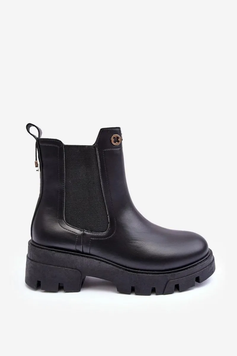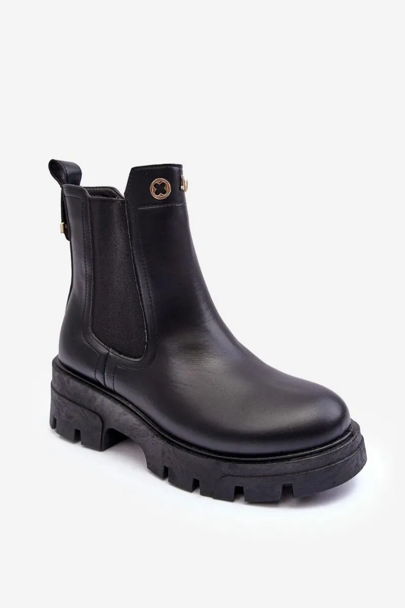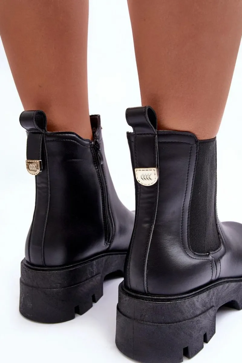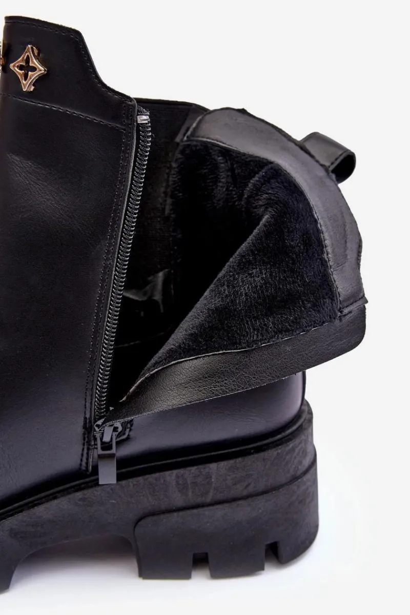 Klasyczne damskie botki osadzone na masywnym, płaskim obcasie oraz platformie. Wykonane z eko skóry. Wnętrze ocieplone kocem obuwniczym. Model zapinany na suwak. Na górze cholewki małe, złote ozdoby z tworzywa sztucznego. Koniecznie powinnaś mieć ten model w swojej szafie! Przy wyborze rozmiaru prosimy sugerować się tabelą rozmiarów.