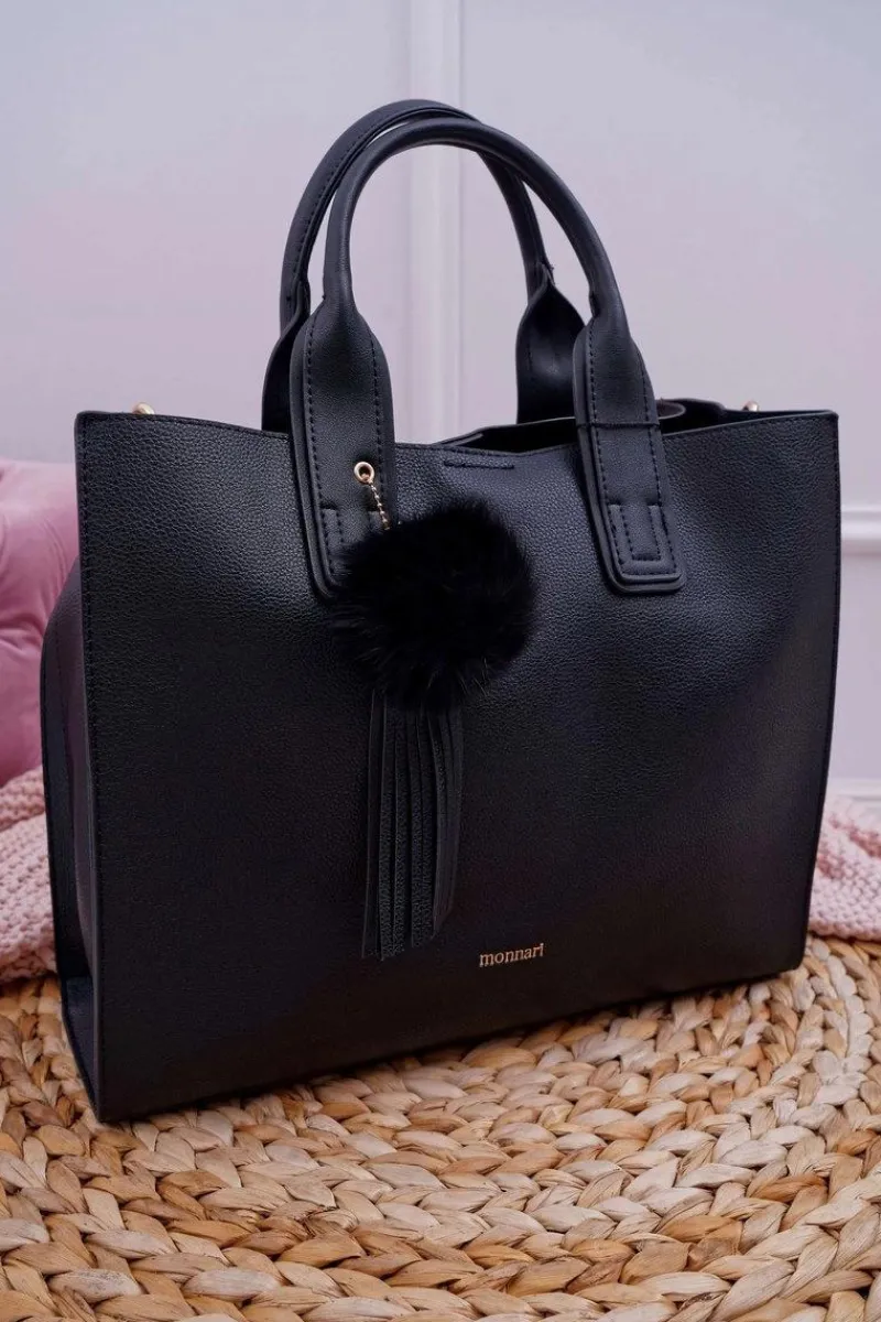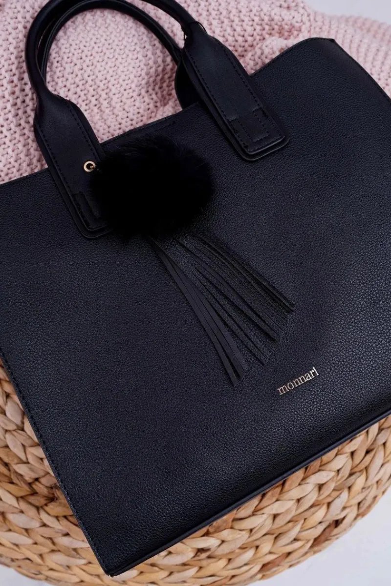 Wizytowa torebka damska o średniej wielkości (35, 29, 12cm) zawieszona na rączkach, z przywieszką w postaci sztucznego futerka i frędzelka. Na przednim panelu torebki tłoczone subtelne logo marki Monnari. Torba zamykana na suwak, w środku jasna podszewka i przegródki na drobiazgi. Polecamy ten model do eleganckiej stylizacji.