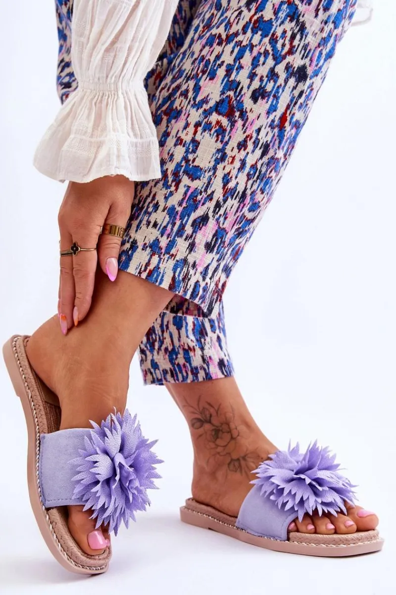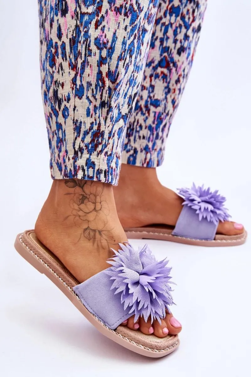 Klapki damskie z efektowną ozdobą na przodzie. Wykonane z eko zamszu, natomiast ozdoba z tkaniny. Wkładka oraz podeszwa są wykonane z gumowego tworzywa. Nosek odkryty, lekko kwadratowy. Zdobienie w postaci sznurka wokół podeszwy. Klapki osadzone na płaskim obcasie, z antypoślizgową podeszwą. Klapki są przewiewne, więc świetnie sprawdzą się w upalne dni! Model, który powinnaś mieć ! Nie czekaj i kup! Przy wyborze rozmiaru prosimy sugerować się tabelą rozmiarów.
